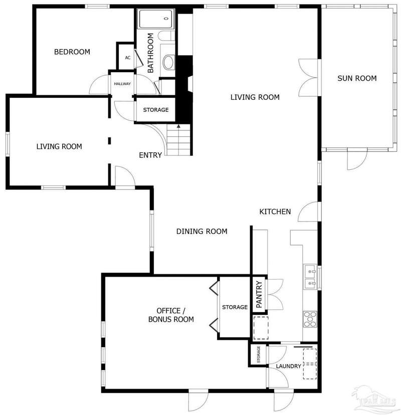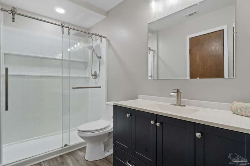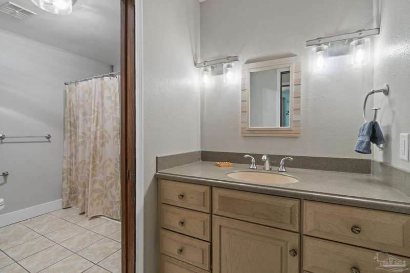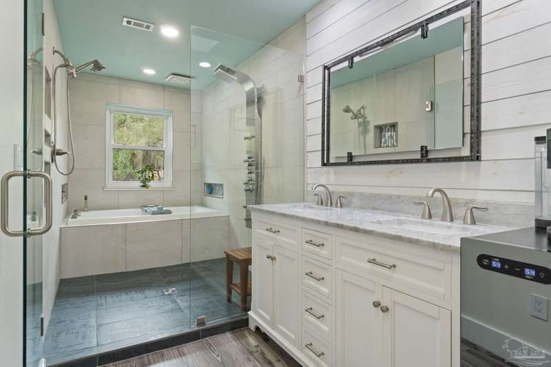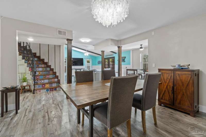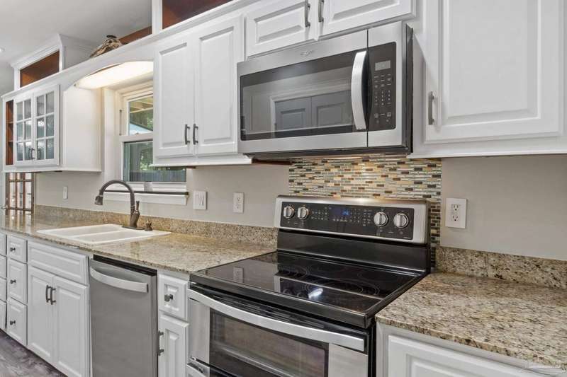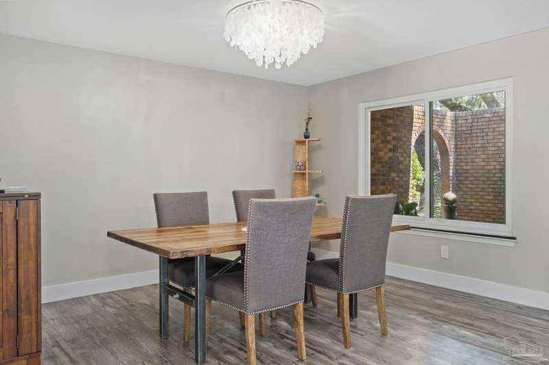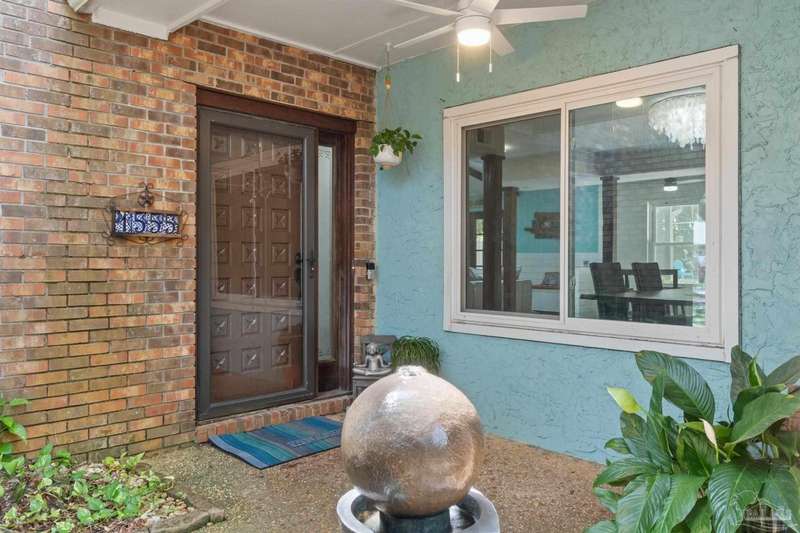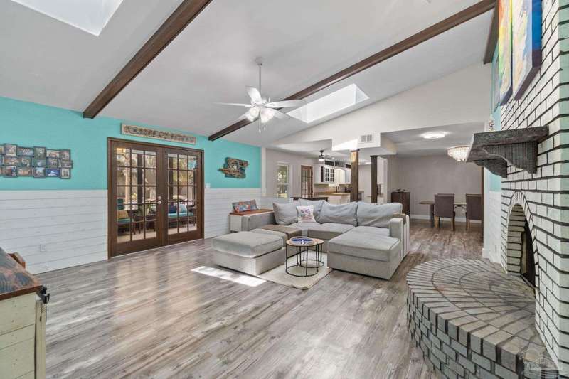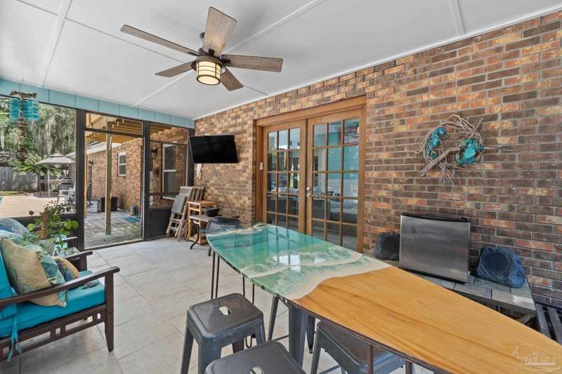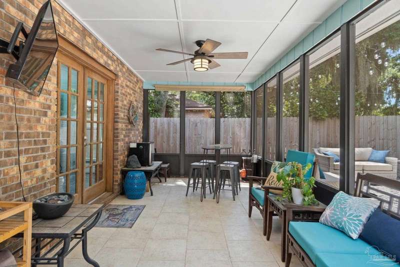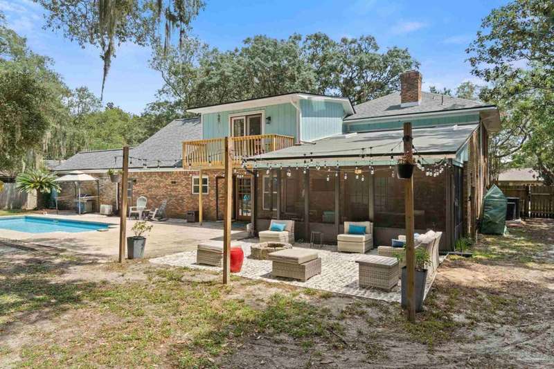 Discover charm and elegance in this 4-bedroom, 3-bathroom Gulf Breeze salt water pool home, designed for unforgettable gatherings and ask about the newly added seller concessions towards upgrades. Situated among majestic mature Live Oak trees, this home boasts a large L-shaped pool, a spacious outdoor patio, and a 20x10 screened porch for year-round enjoyment. Step inside to the light and bright living space with vaulted ceilings, skylights, a cozy fireplace, ship lap accents, and a stylish wet bar, which opens seamlessly into the eat-in kitchen featuring granite countertops, and ample cabinetry with pantry. The first floor also offers a formal dining area with a view of the courtyard entry, an additional cozy family room, a bedroom next to a full bathroom, and a private office space with exterior entry. Ascend the curved staircase to find two inviting guest bedrooms, each with access to a relaxing front balcony. The expansive primary suite, also on the second level, features a private balcony with serene views of the fenced backyard and sparkling pool, plus a luxurious newly renovated en-suite bathroom. You'll also find an additional bonus space, suitable for more storage or game room. With a new roof, impact windows, generous room sizes, abundant closet space, additional storage, and a two-car garage, this home combines practicality with sophistication. Don't miss your chance to own this entertainer's paradise in Gulf Breeze!