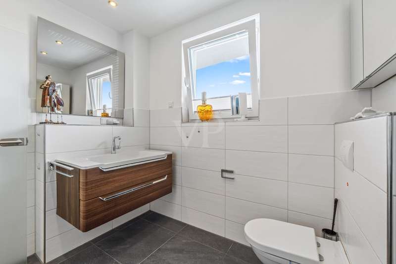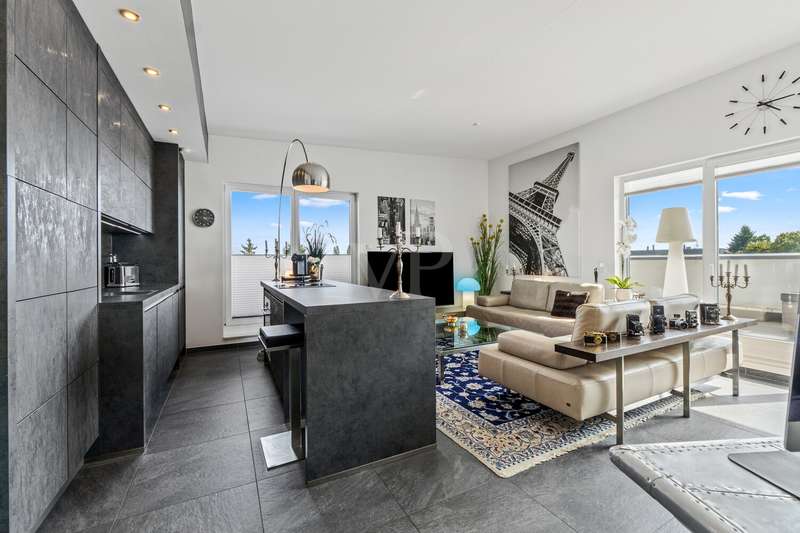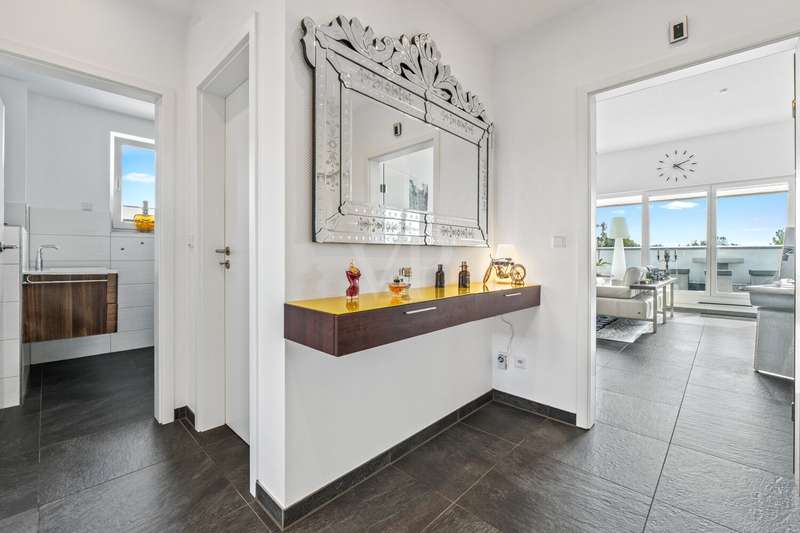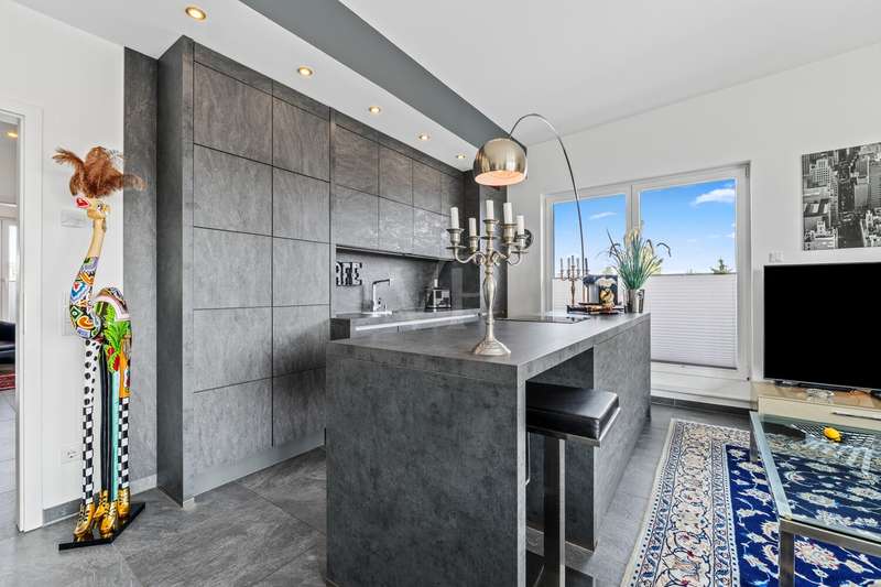 Welcome to a property that combines contemporary comfort with architectural finesse and sets standards for exclusivity and quality. This home is located in a carefully planned eight-unit house that is designed for state-of-the-art construction and high energy efficiency - specifically as a KfW Efficiency House 70%. This is a retreat for people with high standards and a flair for the extraordinary. An elevator takes you to your private retreat. The well thought-out floor plan comprises two rooms, including a generously sized bedroom and a living/dining area with an open-plan kitchen. With its access to the roof terrace, this opens up an inviting atmosphere in which enjoyment, community and a stylish ambience flow seamlessly into one another. The fitted kitchen from the renowned Nolte brand - equipped with a high-quality Bora extractor fan, induction hob and Siemens brand appliances - blends into the living concept as a discreet statement of modern functionality. The daylight bathroom sets stylish accents with a double washbasin and elegant fittings. The attention to detail is evident in the choice of special materials: walls with fiberglass wallpaper, beautiful stone tiles in all rooms and underfloor heating that ensures a cosy warmth. Electric shutters and floor-to-ceiling plastic windows with triple glazing underline the careful balance of light, comfort and energy efficiency. The generous ceiling height of up to approx. 3.15 meters conveys an additional sense of space and emphasizes the exclusive character of this apartment. A storage room offers well thought-out storage space and structure in everyday life. One of the highlights of this home is undoubtedly the large south-west-facing roof terrace: here you can start and end the day with fascinating light moods and a panorama from the Siebengebirge to the Wahner Heide. This apartment embodies a promise of quality that is aimed at people who are looking for the extraordinary and value prestigious living space. A home that will inspire you with every facet. A cellar room offers plenty of storage space. Two underground parking spaces round off this offer.