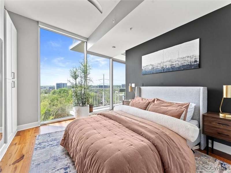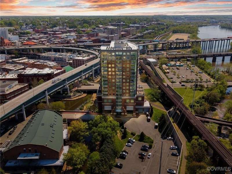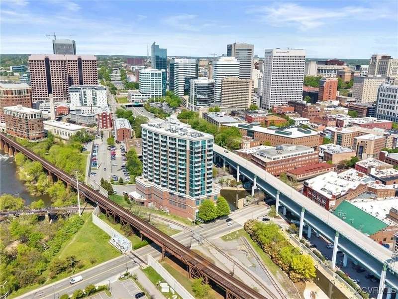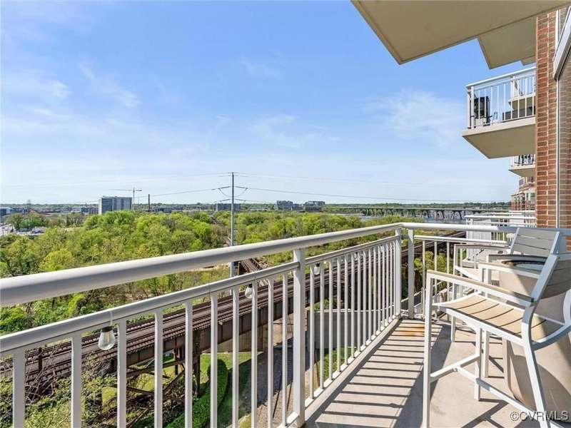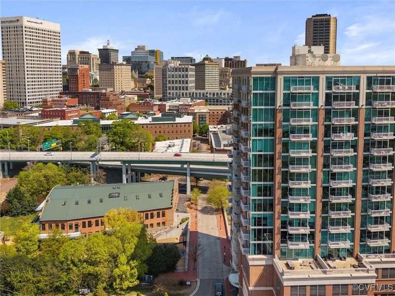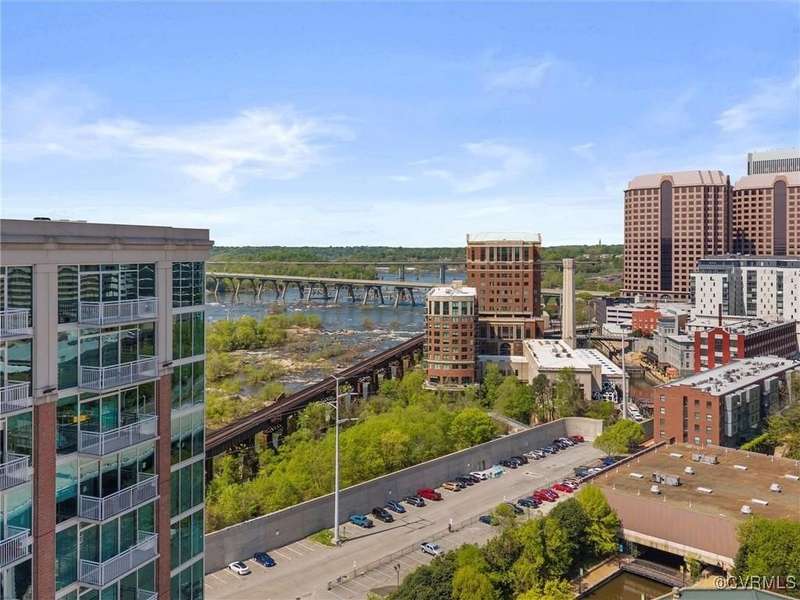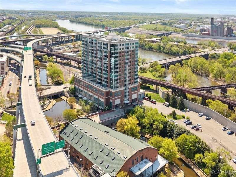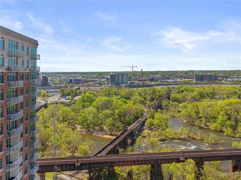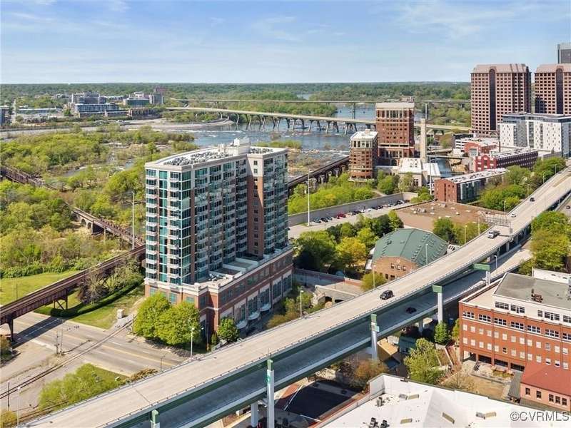 Step into sophisticated city living at its finest with this stunning mid century modern condo! Bathed in natural light due to expansive south-facing floor-to-ceiling windows and boasting 10 ft ceilings, this urban residence offers a refined and elevated ambiance. Recent updates enhance its appeal and functionality, including wide plank heart pine floors throughout and new granite countertops in the spacious kitchen that are complemented by a modernized island renovation and freshly painted cabinets. The unit also offers upgraded appliances (Samsung fridge, range & oven, microwave, dishwasher, etc.) including the convenience of a GE dual washer/dryer system. Thoughtful design continues with custom built-in storage solutions in both bedrooms, plus a versatile Murphy bed in the second bedroom. The primary suite features a stylish custom barn door leading to the walk-in closet. Also, enjoy outdoor living on your private balcony with panoramic views of the James River, now equipped with a low-profile screen door. Ideally located in the heart of downtown Richmond, this condo provides effortless access to major interstates and is just moments away from the vibrant dining and shopping scenes of both the Fan and Church Hill neighborhoods. Embrace an active lifestyle with easy walkability to the scenic Canal Walk, Capital Trail, and the renowned James River Park System. This is urban living at its finest!