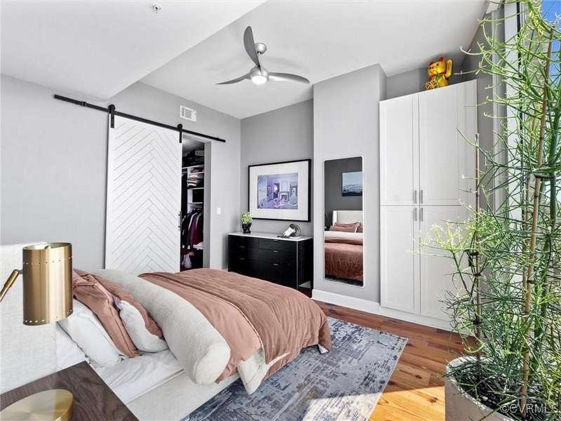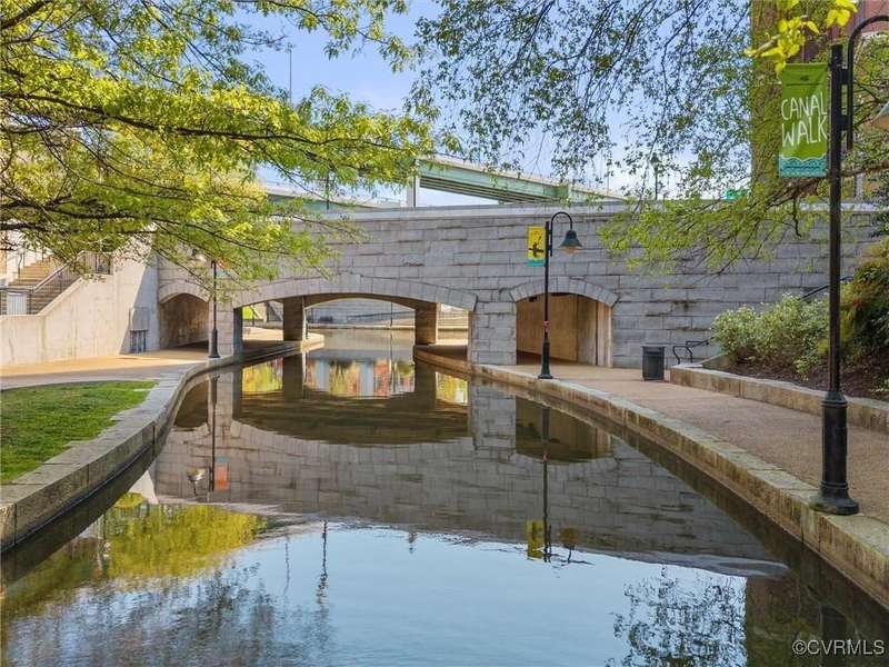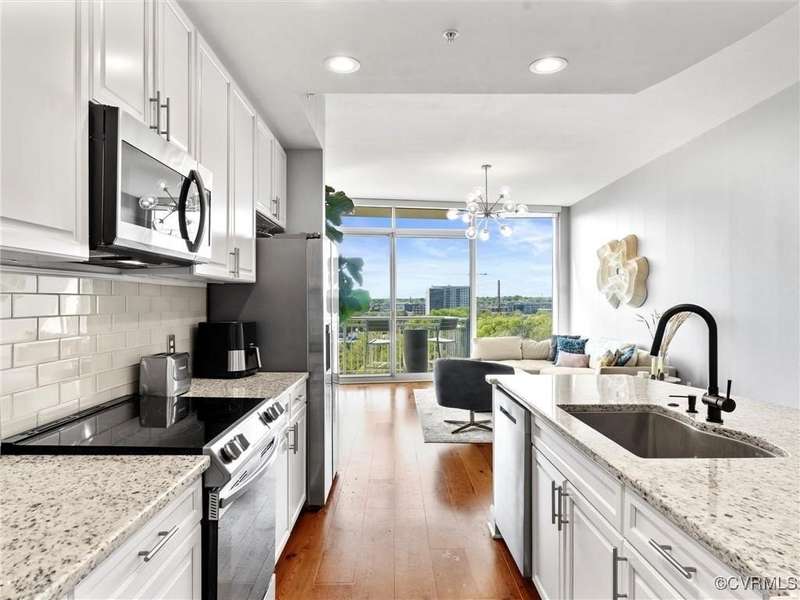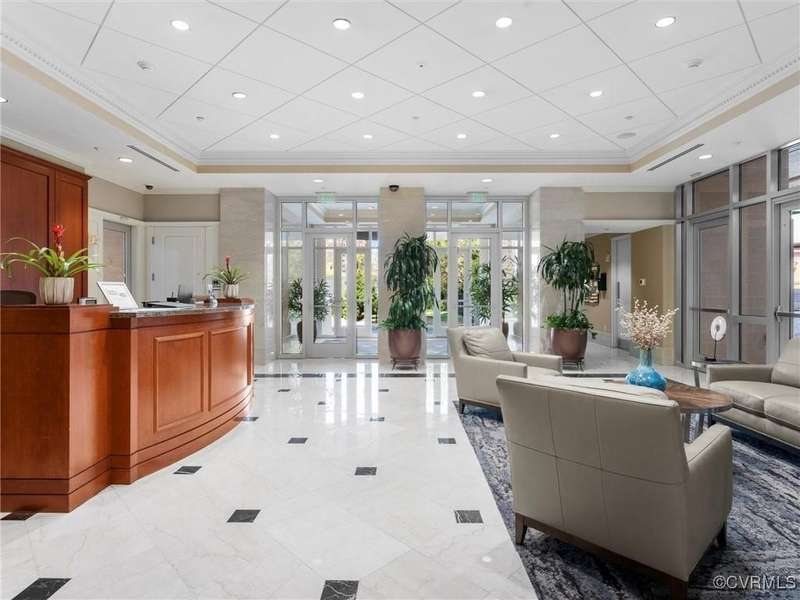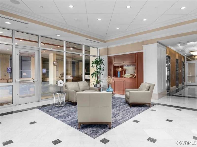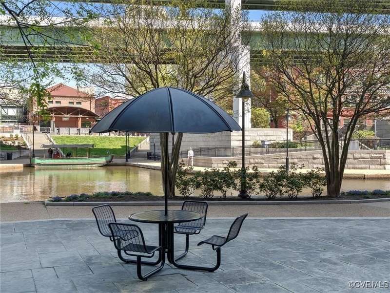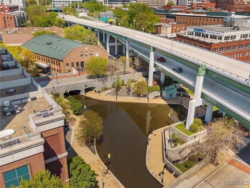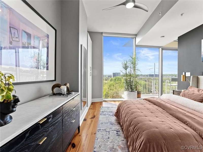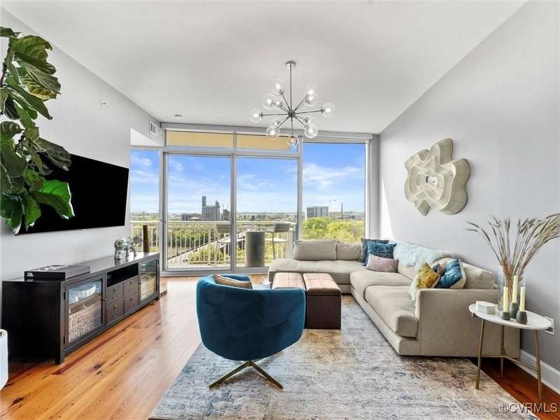 Step into sophisticated city living at its finest with this stunning mid century modern condo! Bathed in natural light due to expansive south-facing floor-to-ceiling windows and boasting 10 ft ceilings, this urban residence offers a refined and elevated ambiance. Recent updates enhance its appeal and functionality, including wide plank heart pine floors throughout and new granite countertops in the spacious kitchen that are complemented by a modernized island renovation and freshly painted cabinets. The unit also offers upgraded appliances (Samsung fridge, range & oven, microwave, dishwasher, etc.) including the convenience of a GE dual washer/dryer system. Thoughtful design continues with custom built-in storage solutions in both bedrooms, plus a versatile Murphy bed in the second bedroom. The primary suite features a stylish custom barn door leading to the walk-in closet. Also, enjoy outdoor living on your private balcony with panoramic views of the James River, now equipped with a low-profile screen door. Ideally located in the heart of downtown Richmond, this condo provides effortless access to major interstates and is just moments away from the vibrant dining and shopping scenes of both the Fan and Church Hill neighborhoods. Embrace an active lifestyle with easy walkability to the scenic Canal Walk, Capital Trail, and the renowned James River Park System. This is urban living at its finest!