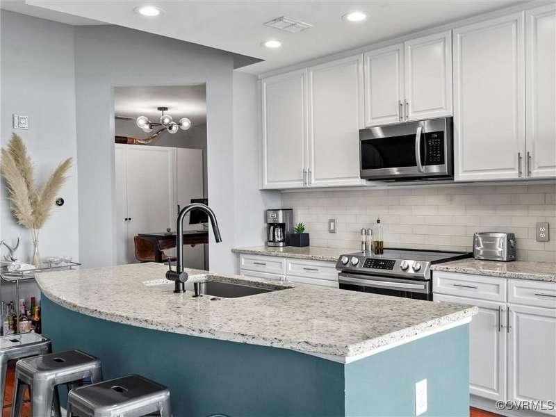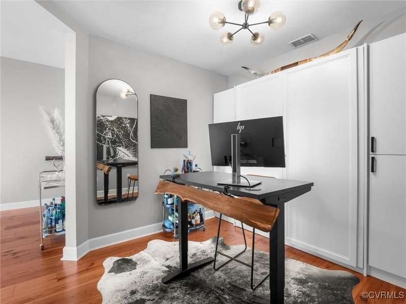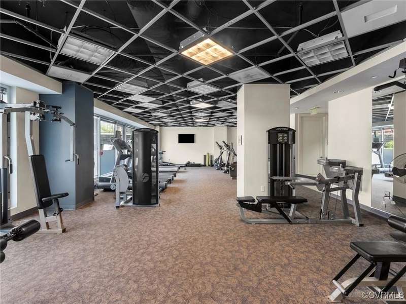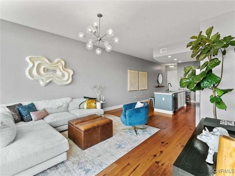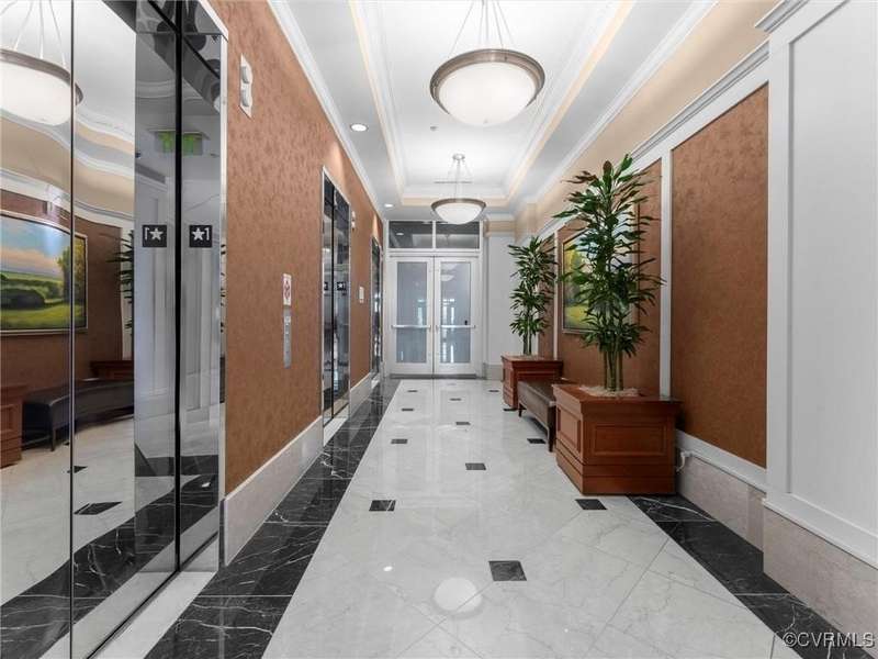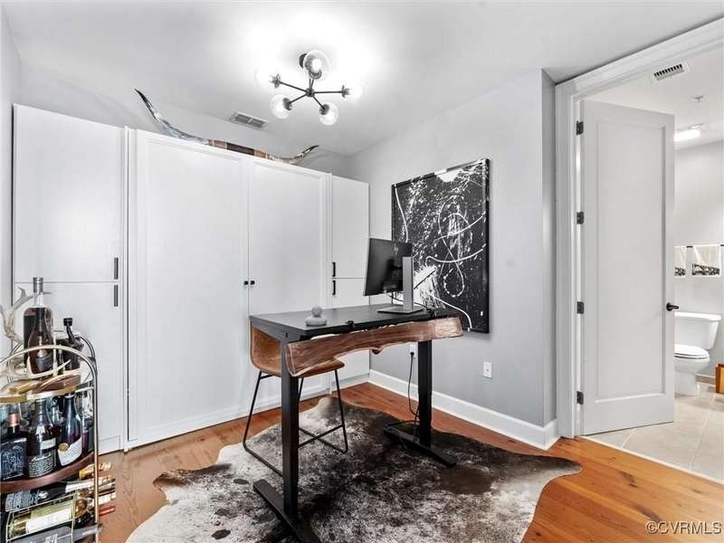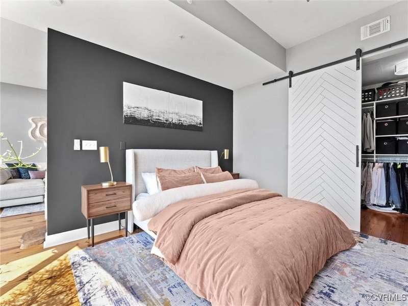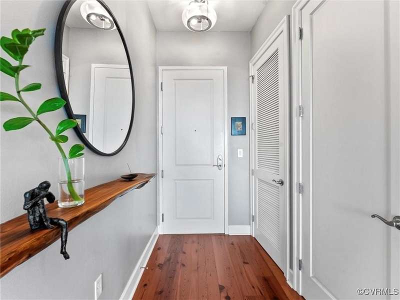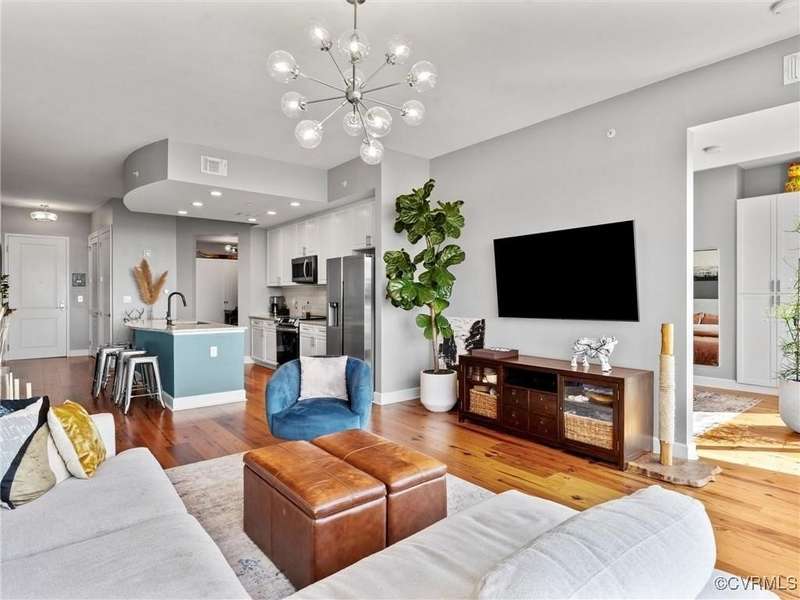 Step into sophisticated city living at its finest with this stunning mid century modern condo! Bathed in natural light due to expansive south-facing floor-to-ceiling windows and boasting 10 ft ceilings, this urban residence offers a refined and elevated ambiance. Recent updates enhance its appeal and functionality, including wide plank heart pine floors throughout and new granite countertops in the spacious kitchen that are complemented by a modernized island renovation and freshly painted cabinets. The unit also offers upgraded appliances (Samsung fridge, range & oven, microwave, dishwasher, etc.) including the convenience of a GE dual washer/dryer system. Thoughtful design continues with custom built-in storage solutions in both bedrooms, plus a versatile Murphy bed in the second bedroom. The primary suite features a stylish custom barn door leading to the walk-in closet. Also, enjoy outdoor living on your private balcony with panoramic views of the James River, now equipped with a low-profile screen door. Ideally located in the heart of downtown Richmond, this condo provides effortless access to major interstates and is just moments away from the vibrant dining and shopping scenes of both the Fan and Church Hill neighborhoods. Embrace an active lifestyle with easy walkability to the scenic Canal Walk, Capital Trail, and the renowned James River Park System. This is urban living at its finest!