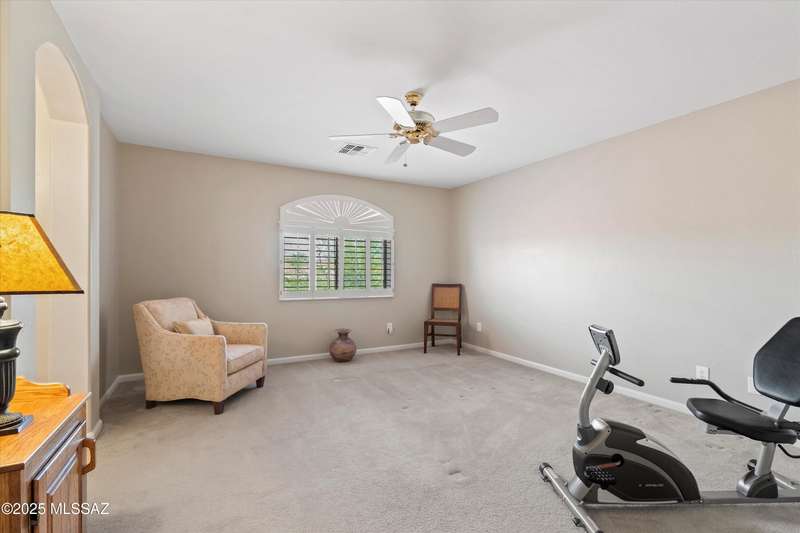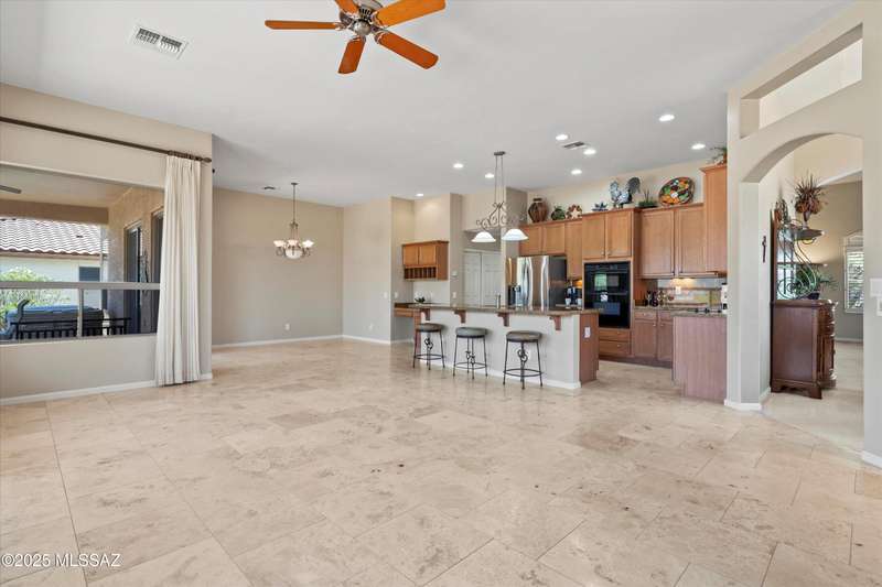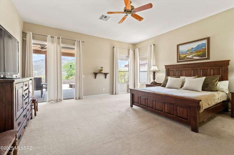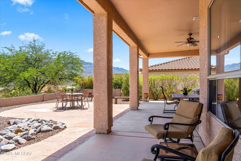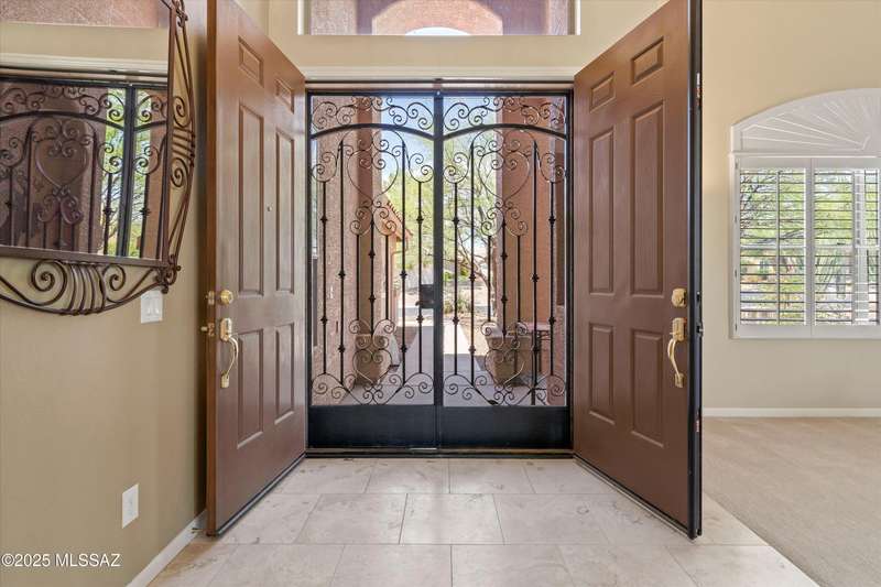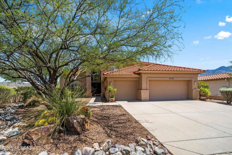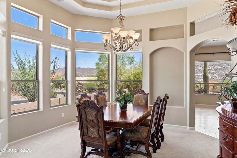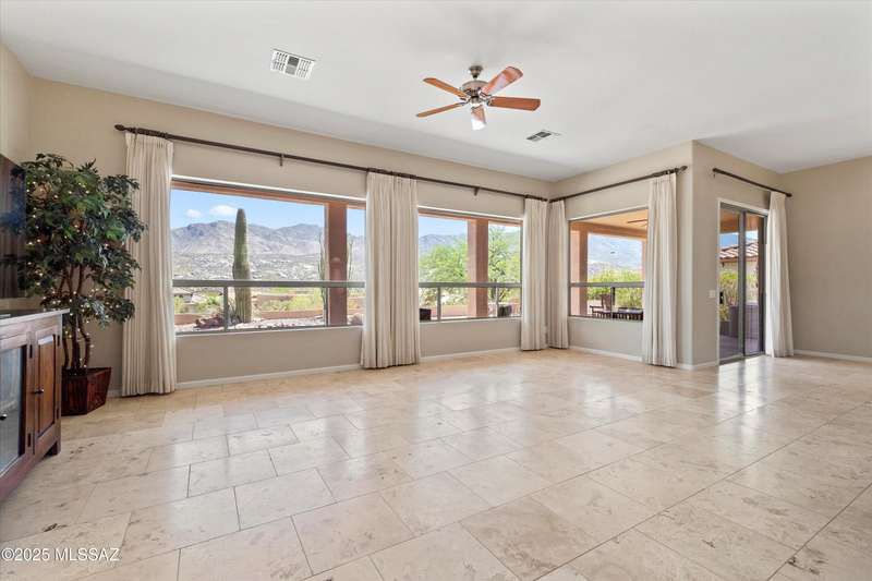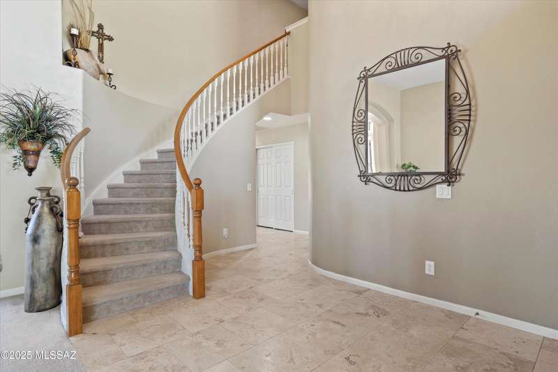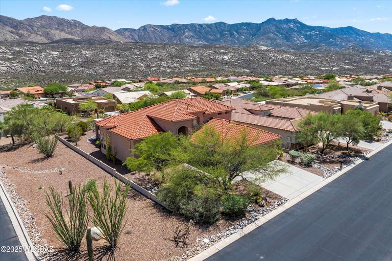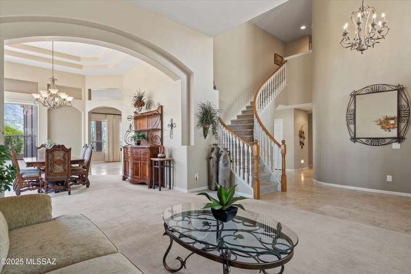 This spacious Sundance model offers impressive Catalina Mountain views. Enter through double doors into an elegant home highlighted by a dramatic staircase. The gathering room flows into a formal dining area featuring a semi-circle of windows designed to capture panoramic vistas. The kitchen is open to the family room, which benefits from large windows framing striking mountain scenery. The owners' suite is generously sized and includes a sitting area with views, an ensuite bathroom with a walk-in shower, double vanity, ample closet space, and extensive built-in cabinetry. Upstairs, the Casita contains two spacious bedrooms separated by a Jack and Jill bath, ensuring privacy for guests. Additional features include a conveniently located den, full hallway bathroom, and a three-car garage.