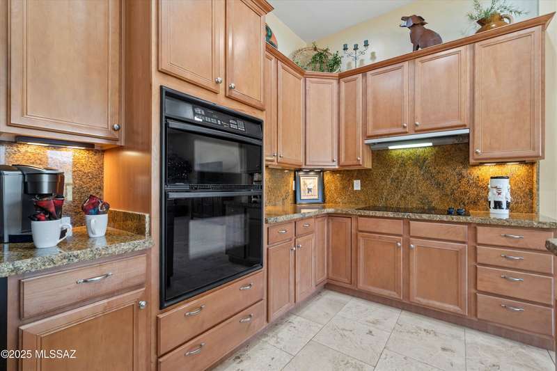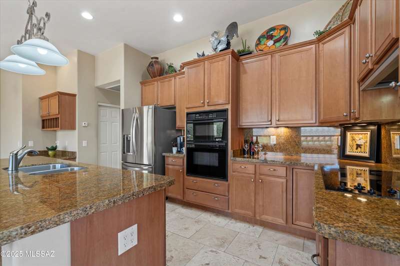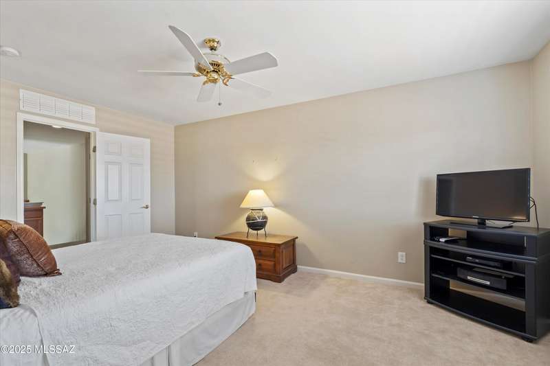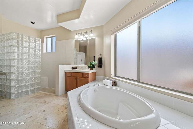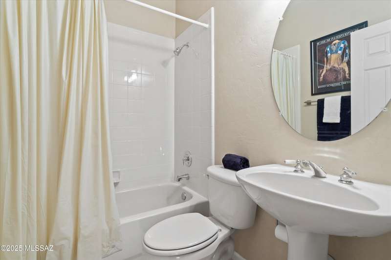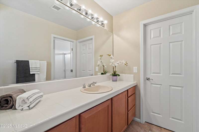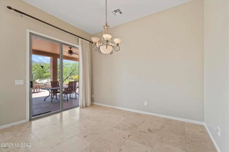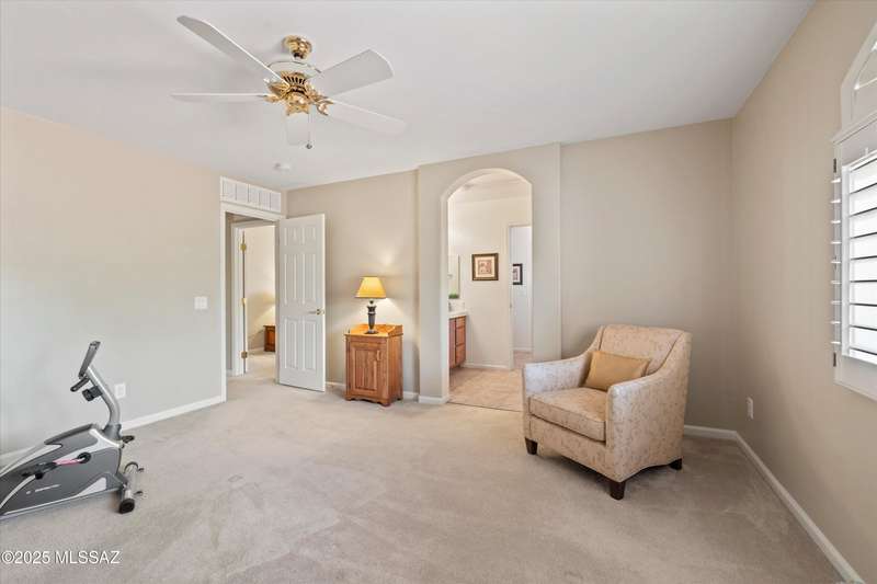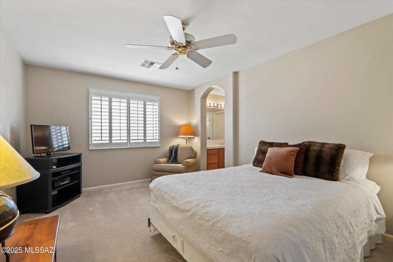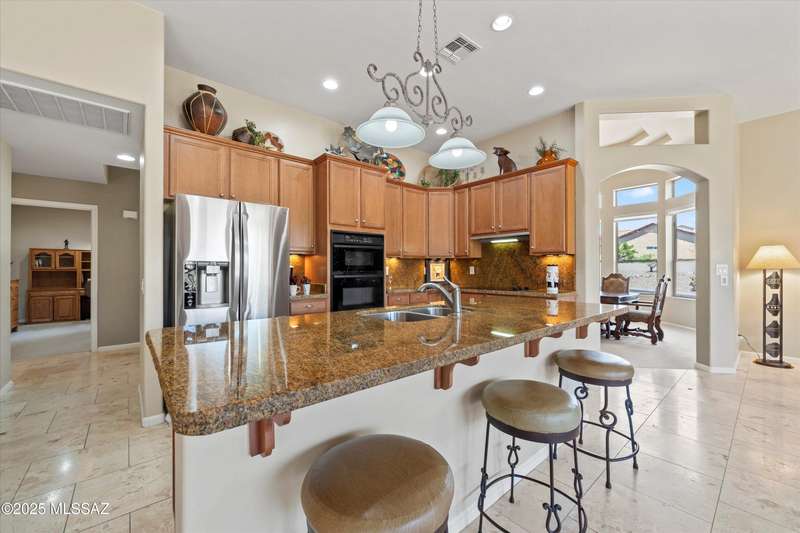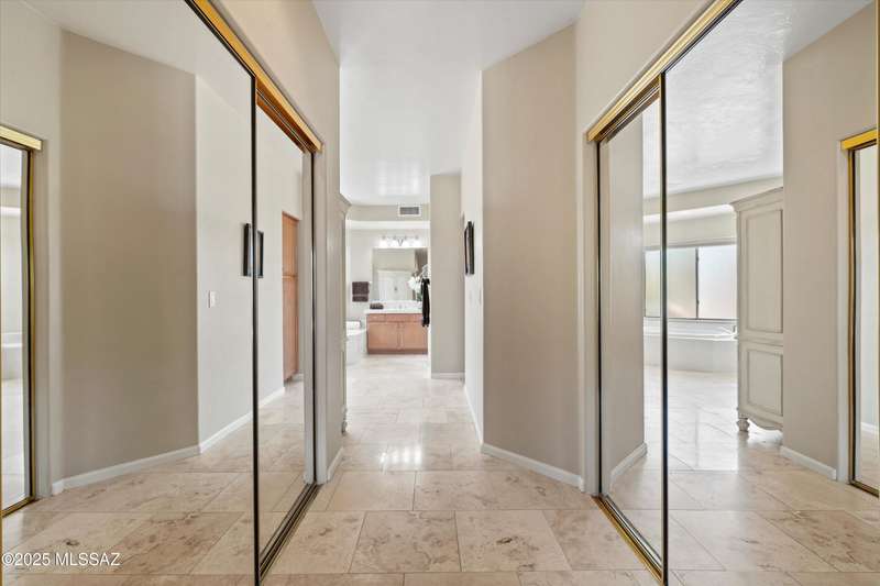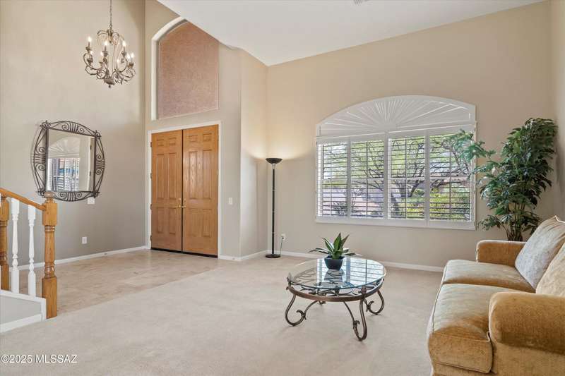This spacious Sundance model offers impressive Catalina Mountain views. Enter through double doors into an elegant home highlighted by a dramatic staircase. The gathering room flows into a formal dining area featuring a semi-circle of windows designed to capture panoramic vistas. The kitchen is open to the family room, which benefits from large windows framing striking mountain scenery. The owners' suite is generously sized and includes a sitting area with views, an ensuite bathroom with a walk-in shower, double vanity, ample closet space, and extensive built-in cabinetry. Upstairs, the Casita contains two spacious bedrooms separated by a Jack and Jill bath, ensuring privacy for guests. Additional features include a conveniently located den, full hallway bathroom, and a three-car garage.