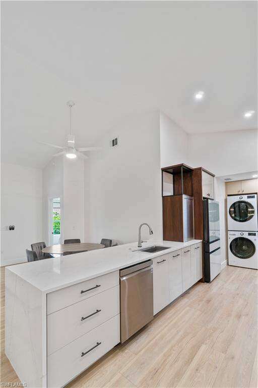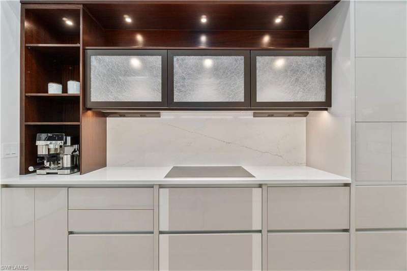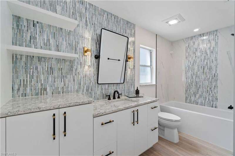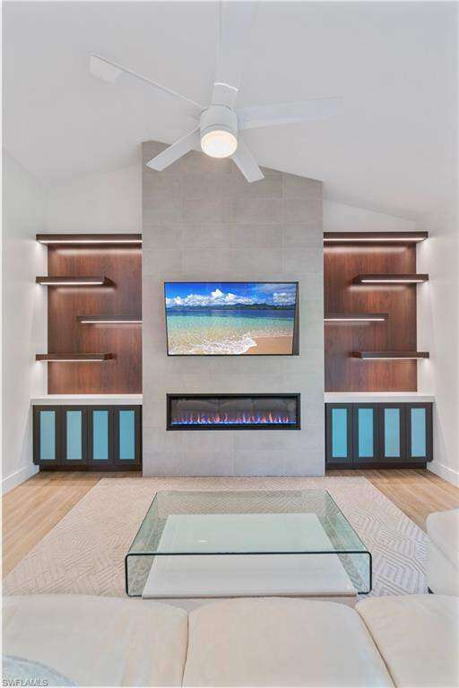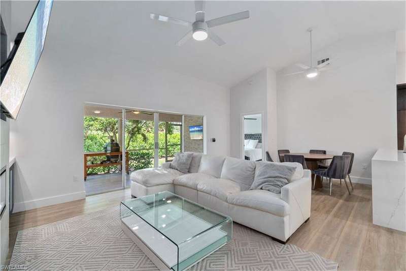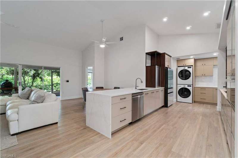 Welcome to a true modern masterpiece, where exquisite charm meets unparalleled craftsmanship. This fully high-end renovated residence is not just a home-it's a 360 piece of art. Every detail has been curated with the precision and elegance you'd expect to see in the pages of a world-class design magazine. Step inside and be greeted by tall ceilings and abundant natural light that amplify the home's open and airy feel. Throughout, luxury vinyl floors bring warmth and continuity, while the porcelain-tiled master bath exudes spa-like sophistication. The home's design showcases a thoughtful blend of the finest materials, including Silestone quartz kitchen counters, quartzite in the master bath, and Cambria quartz in the guest bath. The heart of the home shines with a chef-inspired kitchen rivaling those found in multi-million-dollar estates, complete with sleek finishes, timeless design, and high-end appliances. A striking statement fireplace with lighted floating shelves anchors the living space, while a custom bar area promises to impress guests and elevate your entertaining. The guest bedroom features custom built-ins, offering both elegance and functionality. Enjoy exceptional privacy with an open lot on the right side of the home, with no neighbors-an uncommon bonus in this sought-after community. A large side yard expands your living outdoors, perfect for gatherings under the Florida sunshine. Fairway Dunes is a peaceful, centrally located gem with a true sense of neighborhood charm. Residents enjoy an active clubhouse, GEO-thermal heated pool with baths, tennis and pickleball courts, a barbecue area, and scenic walking paths around the lake-all with low HOA fees. The home sits in an X flood zone, with no current assessments. Just minutes from Coconut Point, the Promenade, downtown Bonita Springs, RSW Airport, Interstate 75, FGCU, golf courses, parks, and boat ramps-not to mention the white sand beaches of Southwest Florida-you'll find the perfect balance of relaxation and everyday convenience. This isn't simply a place to live-it's a place to be. Touch every moment at this one-of-a-kind Fairway Dunes retreat.
