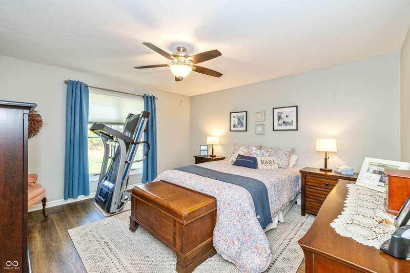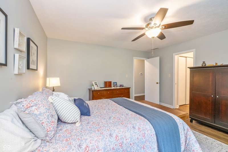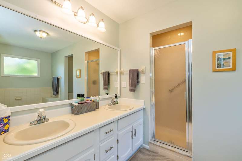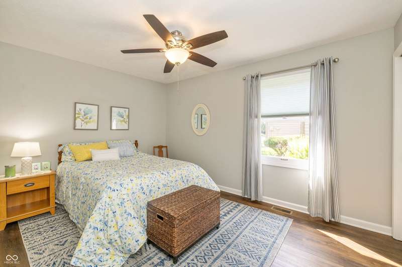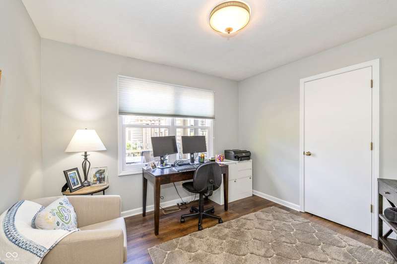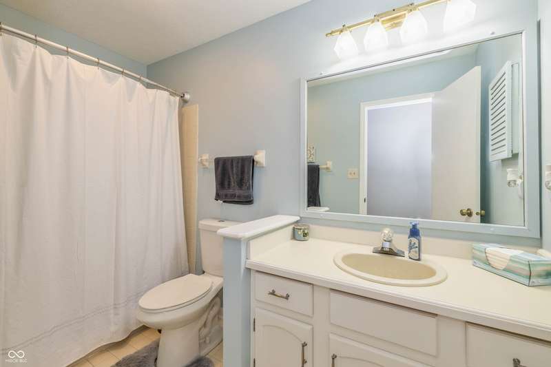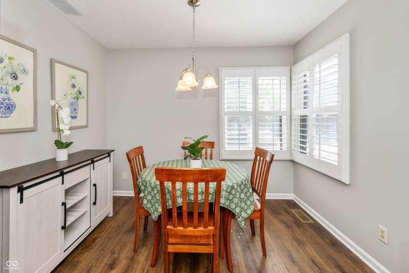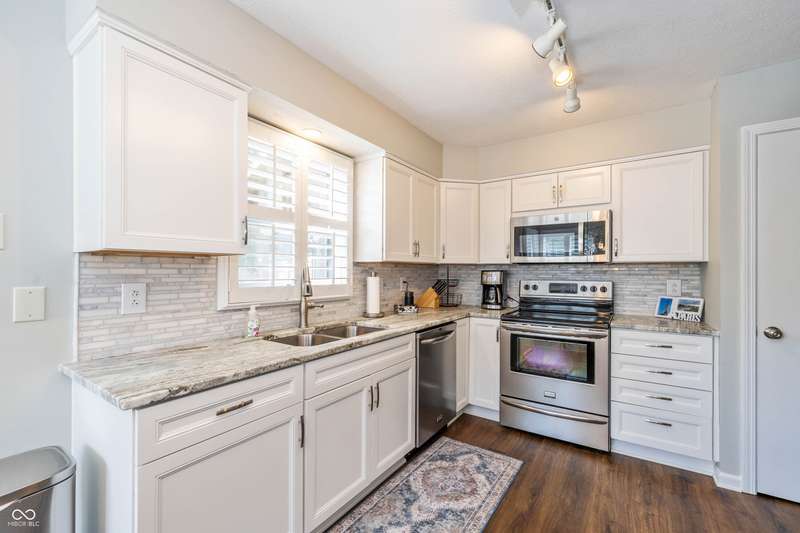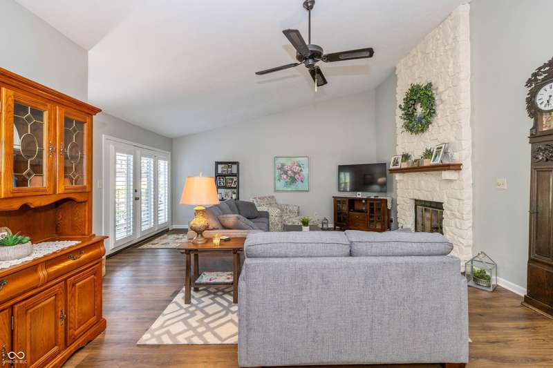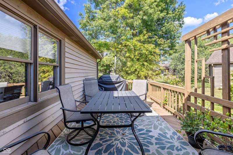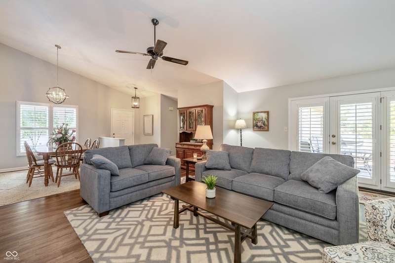 Immaculate ranch in popular Muir Woods! Updated kitchen with soft close cabinets, quartz countertops, stainless appliances and plantation shutters! Great room features vaulted ceiling, gas fireplace and doors to rear deck and is open to dining room! Primary bath has two sinks, garden tub and separate shower and tile is all in excellent condition. Updated flooring and lighting throughout. Washer and dryer remain. Pull down stairs in two car garage for extra storage. Updated blinds in 3rd bedroom/office which overlooks the deck. Kinetico water system. Radon system. One common wall. HOA maintains yard and exterior of property and handles snow removal. Unbelievable location close to schools, restaurants and shopping at Keystone at the Crossing!
