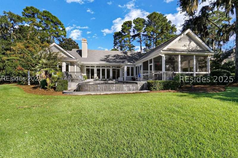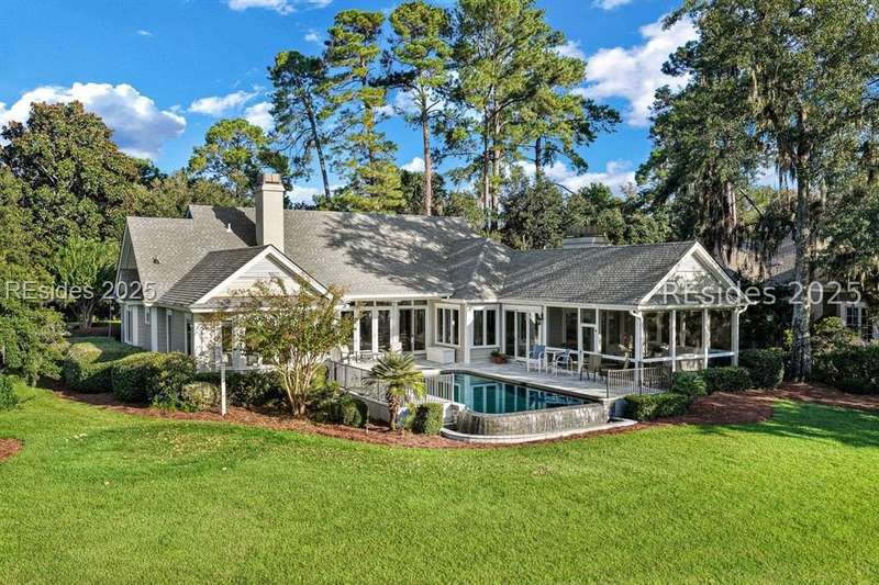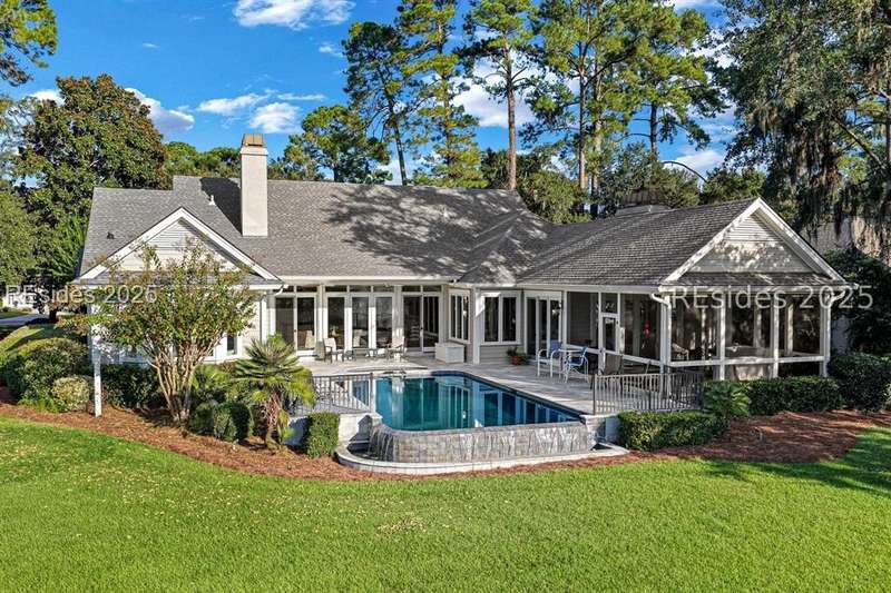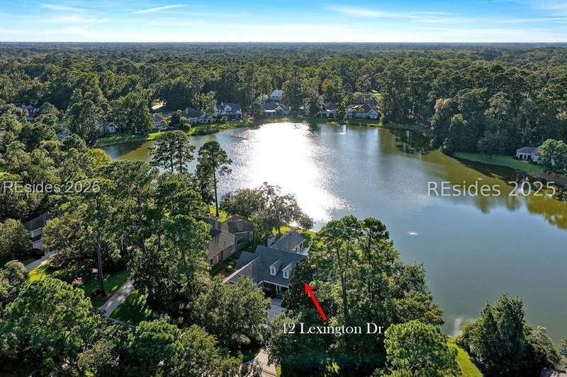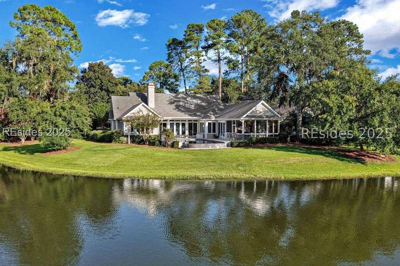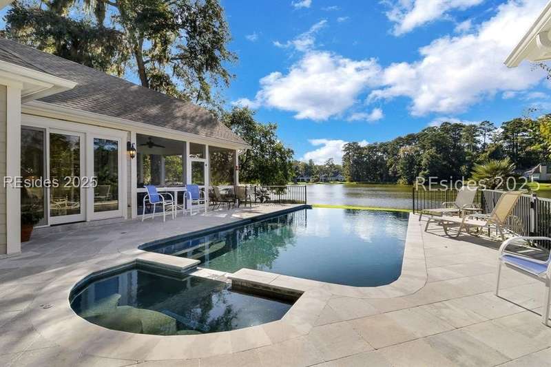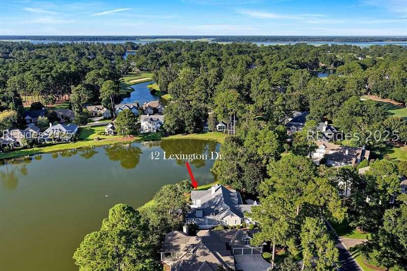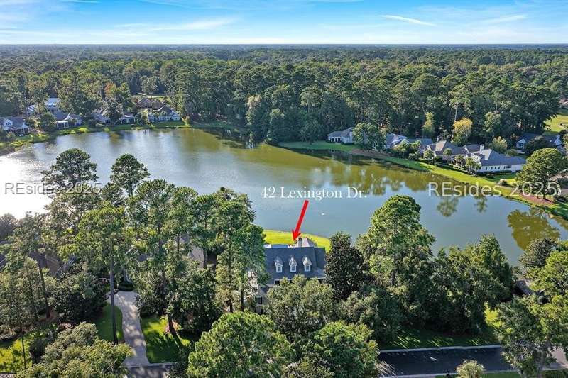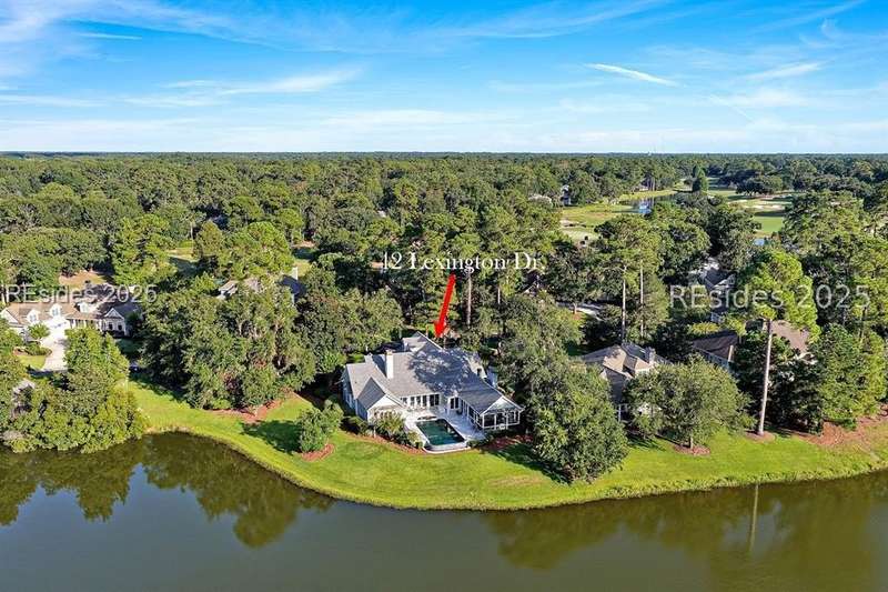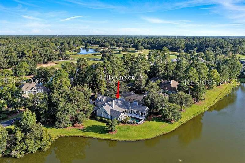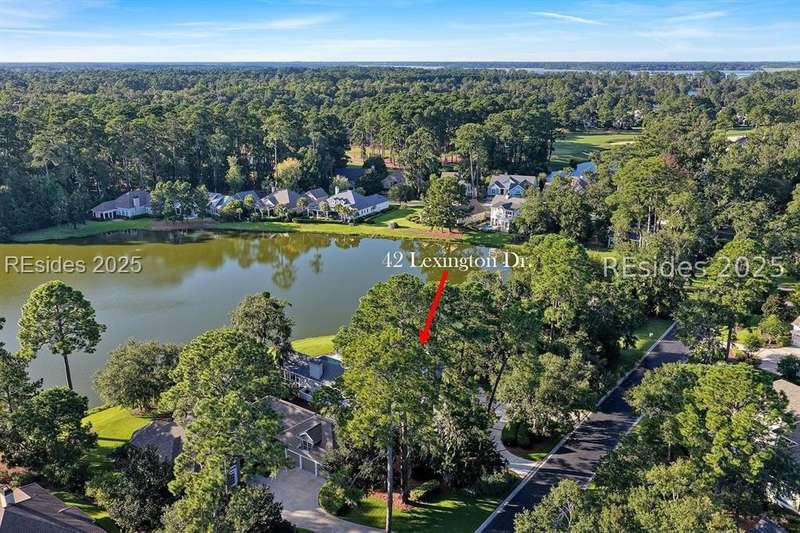 Arriving at 42 Lexington in Belfair you will see that the hardiplank home bursts with Low Country charm. A circular tabby driveway surrounded by lush mature landscaping brings one to the Southern exterior of the home. Upon entering you begin your peaceful and calm journey of being "home". The infinity edge pool appears to flow right into Hickory Lake creating a feeling of serenity. This 4 bedroom 4 bath home has plenty of room for expansion in the large bonus room over the garage to create another bedroom if needed allowing one of the 4 bedrooms on the first floor to be an office. Primary bathroom update has just been completed. The living/dining room open concept features a soaring beamed ceiling filled with light. Off the kitchen/great room is a screen porch. Gourmet kitchen with Wolf oven/stove, Sub Zero refrigerator. The home is perfect for entertaining friends and family whether a pool party, BBQ dinner, cocktail party or just spending quiet time with yourself and loved ones. You will not be disappointed viewing this home and considering it for your own.