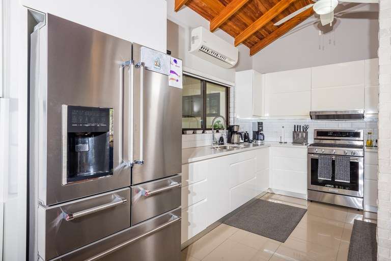 Features two queen beds, a private bathroom, an equipped kitchen with custom wood accents, and a 55-inch TV.