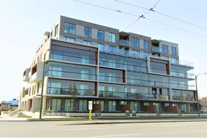COCO Oakridge: high end concrete boutique bldg by Keltic Development w/great floor plan. 1 bdrm & den unit w/huge North facing balcony. Unique retractable glass panels on the balcony allow you to open or close it in good or rainy weather. Features incl Scavolini- Italy's kitchen cabinet; Gaggenau appliances; fully integrated fridge; elect wall oven; 5 burner gas range; Quartz countertops & stylish kit island w/waterfall edge illuminated by efficient & integrated LED lighting systems; Engineered brushed oak hardwood runs throughout; Luxurious marble bathroom; 7' high shaker doors; Air-con and 1 pkg. Prime 41 Av and Alberta. Steps from Oakridge Centre, skytrain, park & schl. Photos virtually staged. Move in anytime. A pleasure to show!