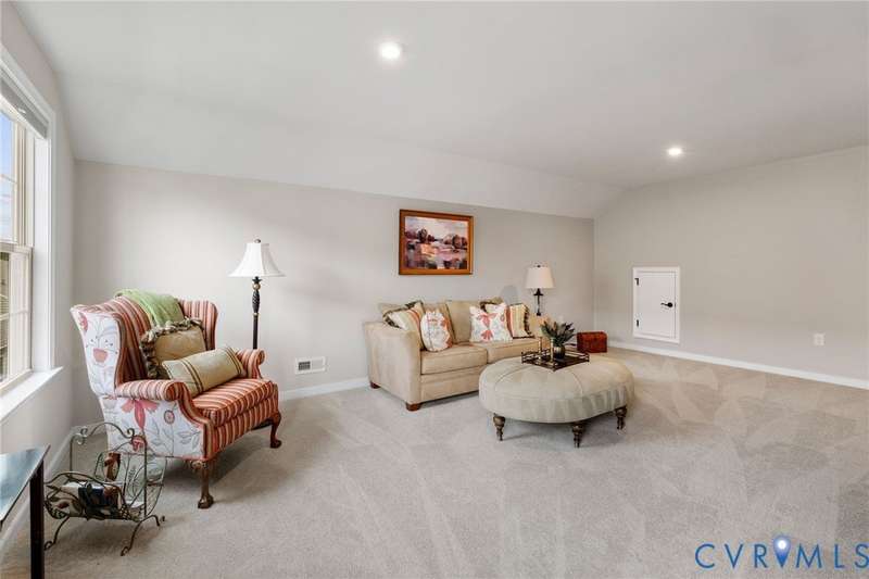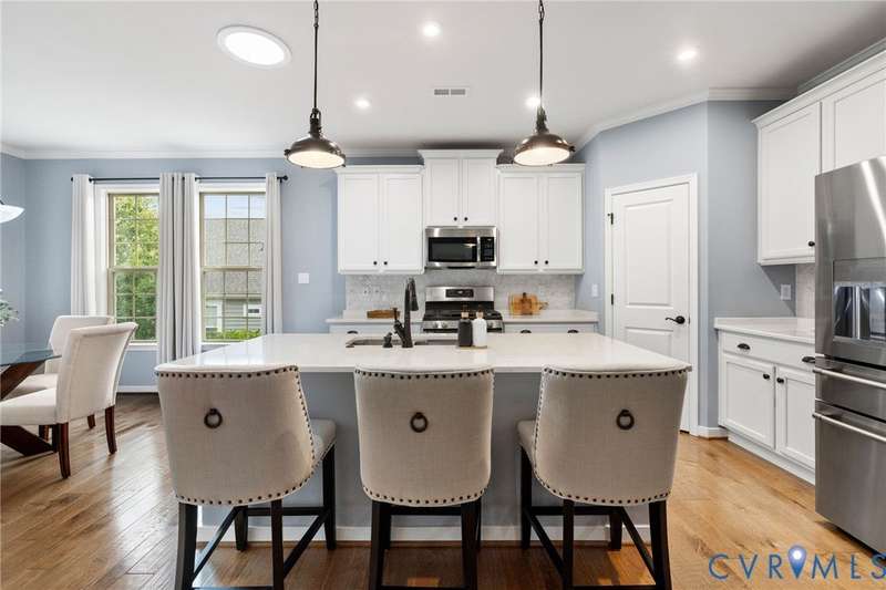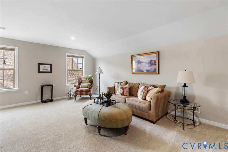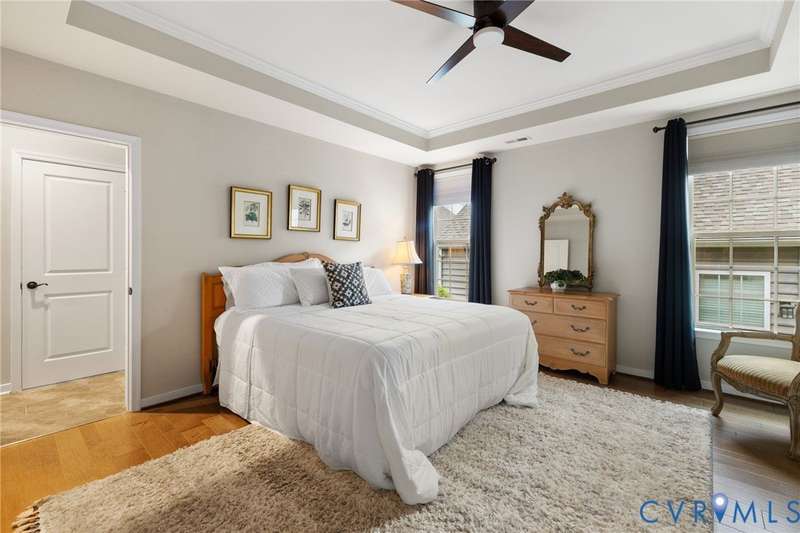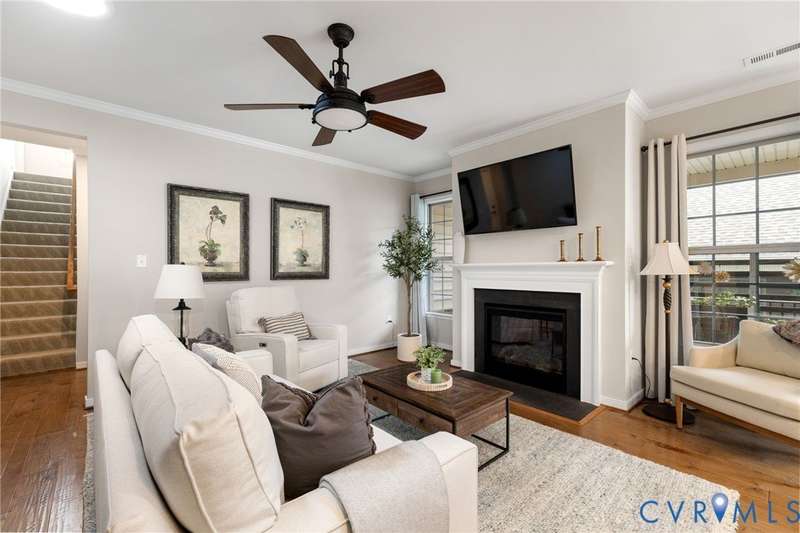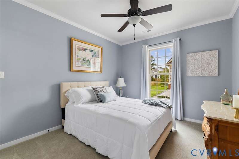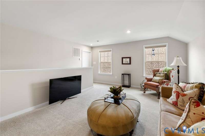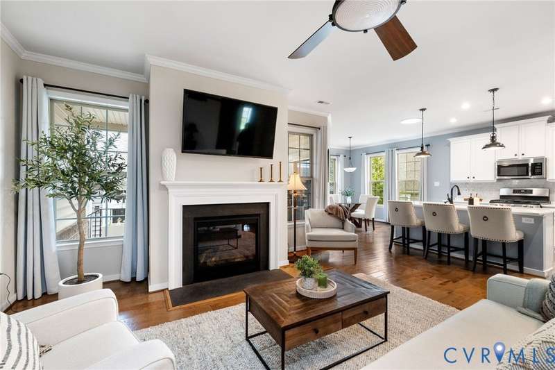 This is the ONE you have been waiting for! Welcome to all the Greenwich Walk Active 55+ Community has to offer in this beautifully appointed Villa Home located in the heart of the neighborhood away from busy street noise. 9' ceilings are highlighted by plentiful crown moulding and wide plank hardwood flooring in many rooms. Cozy fireplace provides the perfect focal point in LR which opens to the Kitchen with its oversized central island, crisp white cabinetry, quartz counters, marble back splash and abundant task and storage space including a step-in pantry closet for all your essentials. Windows surround the Dining Area and along with 2 solar tubes, invite soothing natural light into your spaces. Step through sliding glass to lovely, covered porch that provides a quiet retreat and elevated planters for garden color. Primary Suite has a generous scale and includes tray ceiling for added character, WI Closet, EnSuite bath with double vanity, oversized, zero entry shower with seamless glass and private water closet with its own window. Stunning, upgraded ceramic tile details are found here and in the additional Full Bath located adjacent to the second Bedroom. Front Office off the Entry overlooks a covered front porch - you can sit inside or outside to welcome your guests! Upstairs a finished, carpeted Loft area allows the option for an Upstairs Den or Flex Room and a walk-in attic provides additional storage beyond the generous 2 car garage. The neighborhood provides lawncare and some exterior maintenance, modern clubhouse with gathering spaces for activities, fitness area, terrace, pool, racquet and walking trails and more. Move-In. Relax. Enjoy!