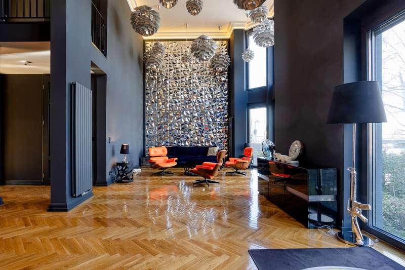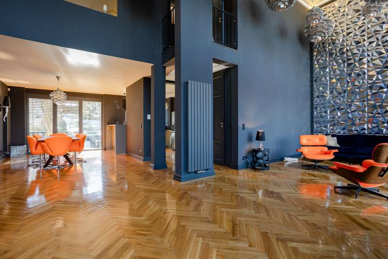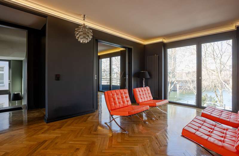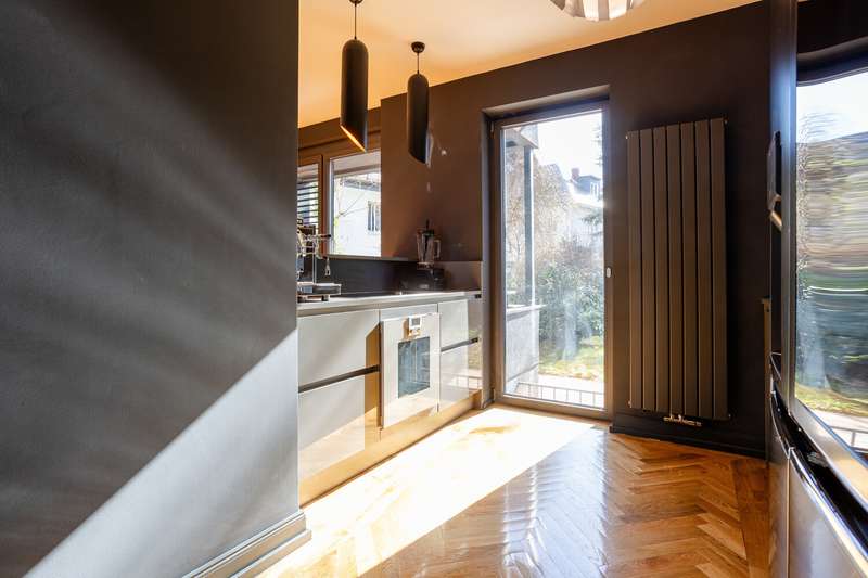 The single-family or multi-generation house on offer is in an urban location in Sachsenhausen-Nord, on the Museumsufer. Spread over three floors, with a spacious layout and a wide range of options for adapting the room layout to your needs, this exceptional home offers both a family with several children and couples who want to live and work comfortably under one roof the best conditions for a luxurious home directly on the Main. The furnishings are high-quality and timelessly modern. Several designer bathrooms are available, solid oak parquet flooring has been laid in all living rooms and bedrooms. The ceiling height in the living area is approx. six meters and the room concept is currently kept open. Another special feature of this location is the large, south-facing garden with a spacious terrace. The property has a garage with an electric door and two parking spaces in front of it.
