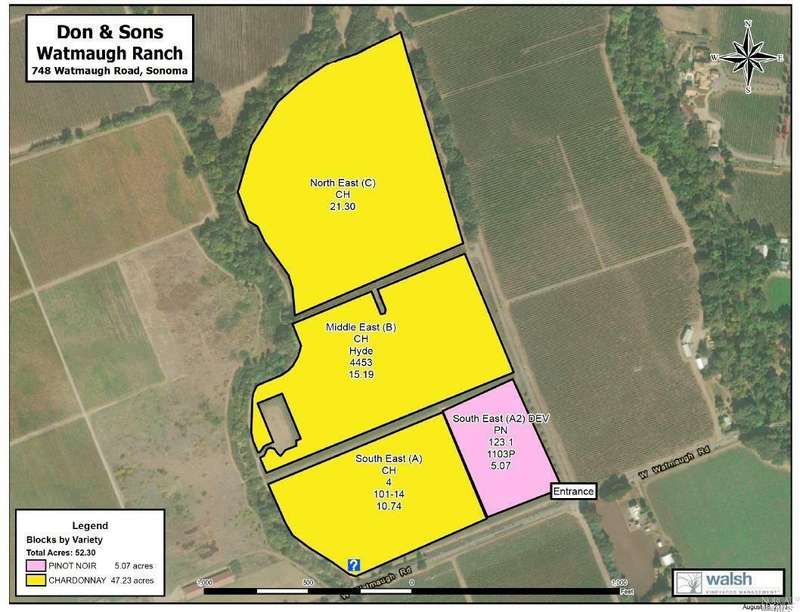The 61+/- acre Watmaugh Ranch consists of two separate legal parcels just 2.5 miles to the Sonoma Plaza. The property has a strong Ag well that services the 49+/- acre Pinot Noir and Chardonnay Vineyard. 10 acres of Chardonnay planted by Walsh Vineyard Management in 2023. There are 5 acres of Pinot Noir on its 4th leaf, and 34+/- acres of additional Chardonnay. Multiple appellations include: Sonoma Valley, Sonoma Coast and Sonoma Carneros. There is a build site and complete engineered home plans. Block maps and detailed vineyard stats available.