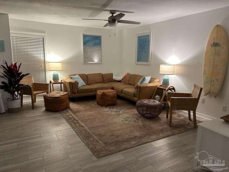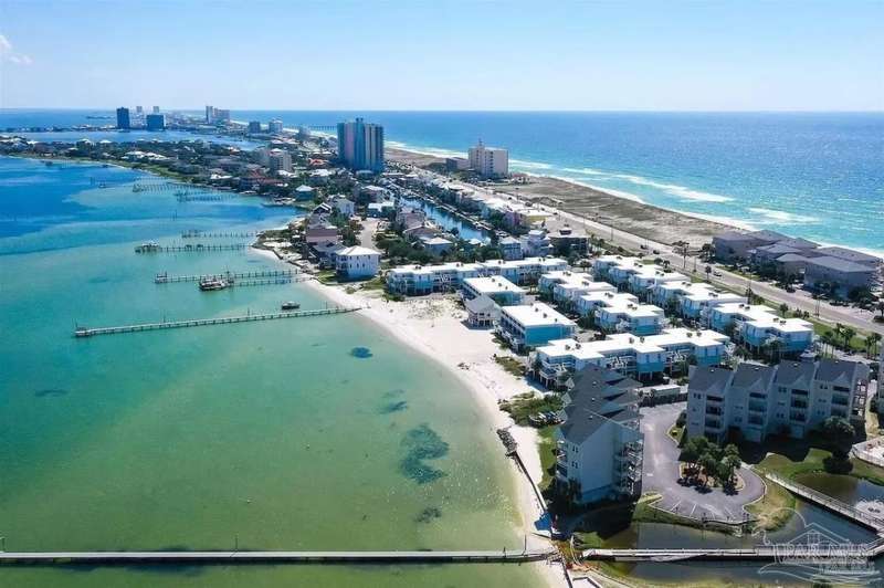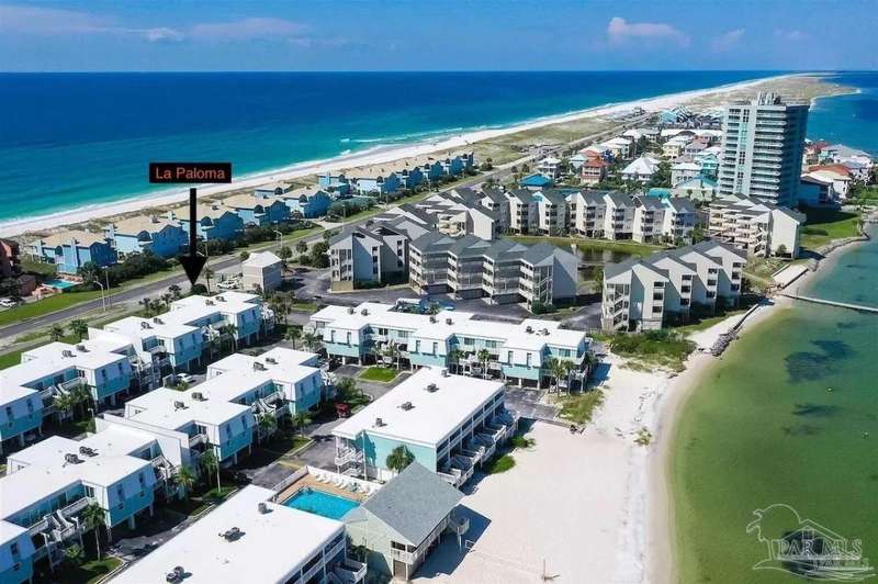 La Paloma is a California surf shack themed condo on Pensacola Beach. This space is intentionally designed to offer you a tropical retreat. An end unit with private decks with views of the Gulf of Mexico and Pensacola Bay. Only steps from the whitest beaches on the planet. The space has a large living area to enjoy gatherings or relaxation. Off the living room you have the dining/kitchen area with a slider that opens up to the deck. Both bedrooms are on the top floor with sliders opening to private decks as well With views of the Gulf. Hang out underneath with a grill for your enjoyment. Outdoor shower to rinse off that salt from your day at the beach. Best family opportunity as there is a beachfront on the bay side with calm water and access to the gulf side. There also is a pool available to all guests.