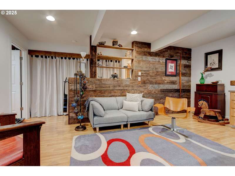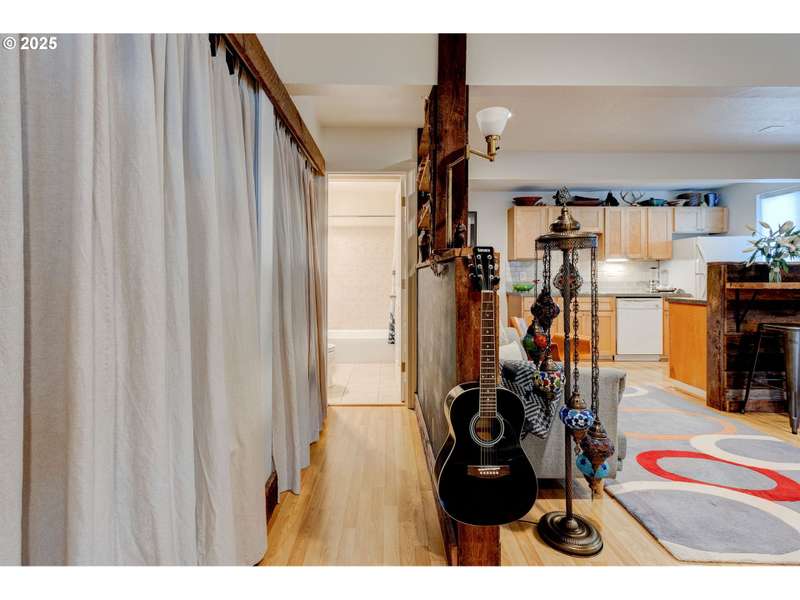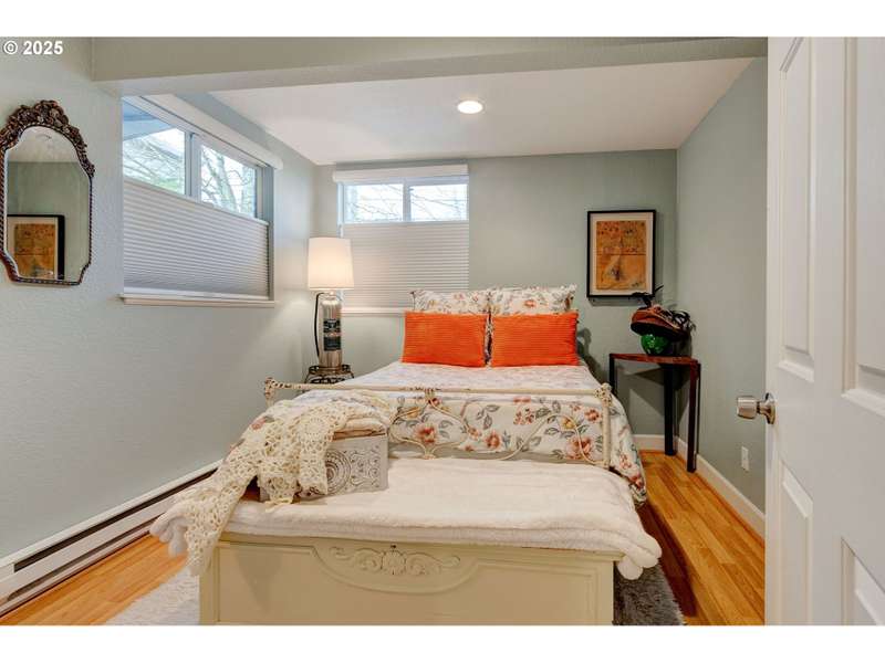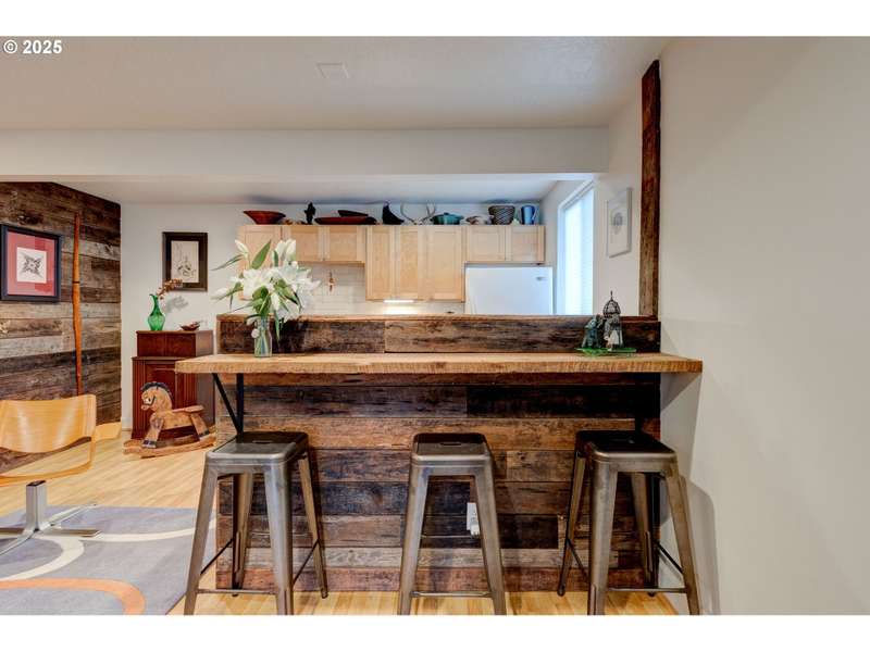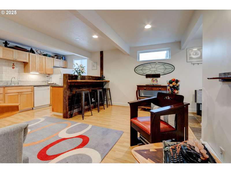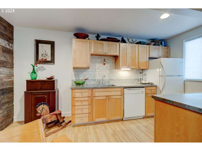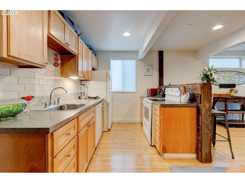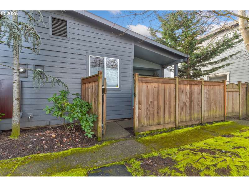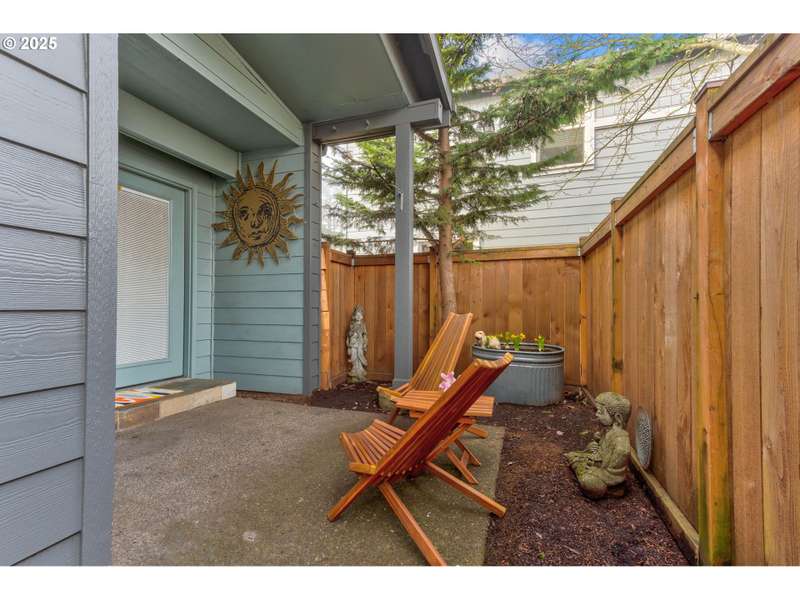 Lives like a house!Hard to find SINGLE-LEVEL,END unit condo with private fenced in yard with patio — the perfect spot for your morning coffee, evening drinks. With no adjacent neighbors on one side, this serene outdoor space offers unmatched privacy.Inside, French doors open to a light-filled, mid-century modern feel featuring a slate entry. The spacious, open floor plan seamlessly connects the living and dining areas, highlighted by a breakfast bar that leads into the kitchen with a stylish tile backsplash and birch cabinetry. Laminate flooring flows throughout, adding warmth and cohesiveness to the space.This condo also includes in-unit full size stackable washer and dryer, a private bedroom, and a well-appointed bathroom. Additional amenities include an assigned parking space right in front, extra storage, and ample street parking for guests. Recent updates include paint and double-paned vinyl windows, ensuring the home is move-in ready. The well-managed HOA with just 8 units in the community includes water, sewer, and trash services with it's fee. Ideally situated in a vibrant urban location, just steps from St. Johns shops, restaurants, theaters, food carts, Cathedral Park, as well as nearby Forest Park, beaches, swimming areas, boat docks, and fishing spots. It's a true walker's and cyclist's paradise, and public transportation is just moments away. Don’t miss out on this rare opportunity!
