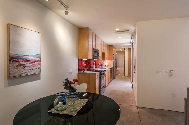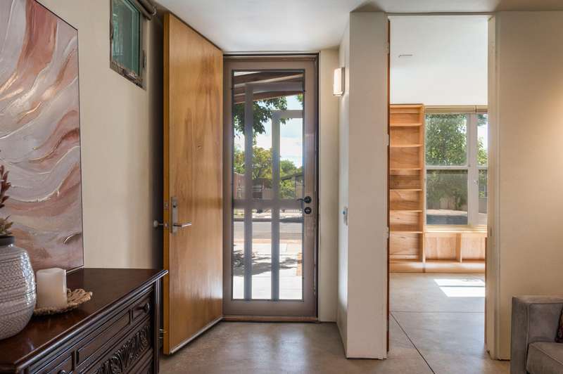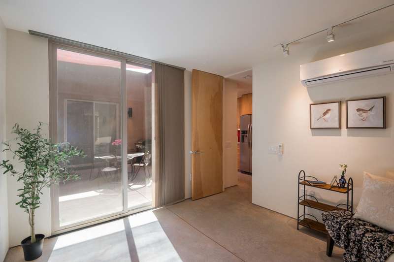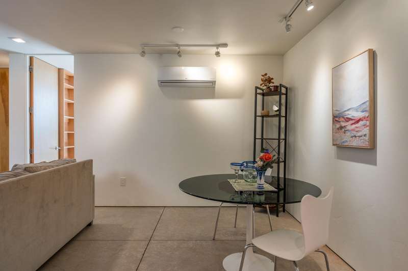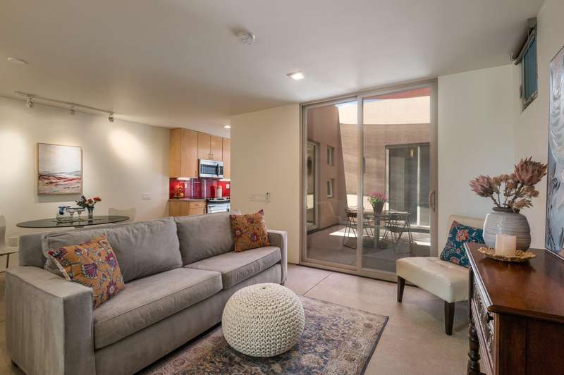 Sleek energy efficient home. Modern condo flooded with natural light from the interior courtyard. Etched concrete floors, tall ceilings & Birch solid wood doors add style. Spacious kitchen with ample cabinets, Quartz counters, stainless steel appliances, sleek backsplash, & nickel finish hardware. The courtyard is encircled by the living room, kitchen, & primary bedroom. Home office with built-in desk & shelves. Nicely appointed full bathroom with deep tub/shower, Quartz vanity top and clean white tile, plus the washer/dryer in the closet. Dual mini-split heating/cooling, energy recovery ventilation system, & tankless water heater. Includes one off-street parking space and storage space. Great walkable neighborhood-close to the Zoo, Tingley beach, the Abq country club and so much more!