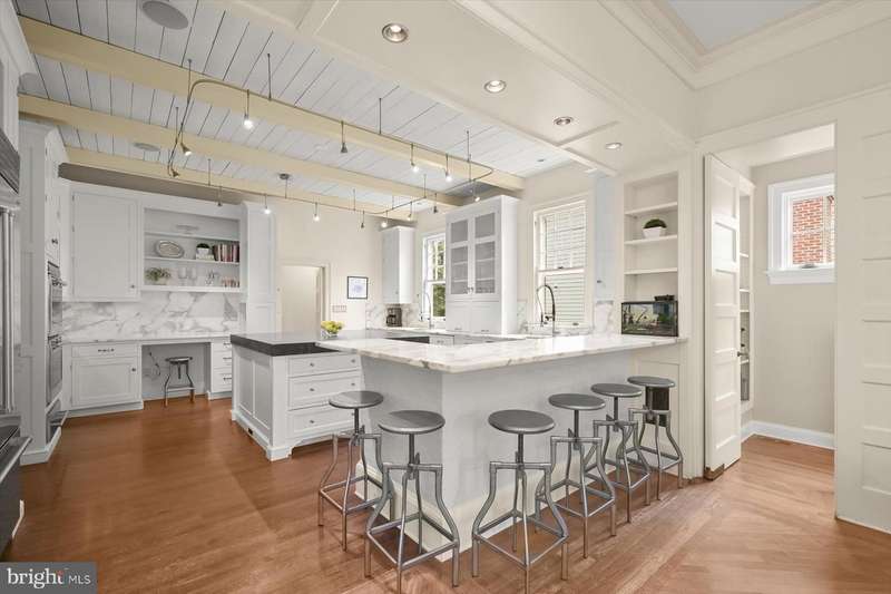 Constructed in 1908, this distinguished Colonial Revival residence stands as one of the seminal grand estates within Chevy Chase Village. Elegantly proportioned, the historic home includes a thoughtfully designed two-story addition by acclaimed architect Cliff Elmore, built by Mauck-Zantzinger. The property encompasses approximately 8,480 square feet of refined living space across four levels (per Floorplan Visuals), situated on a generous 16,667 square foot lot (per public records).The residence boasts expansive entertaining rooms characterized by soaring ceilings and grand scale. Architectural details such as six fireplaces, hardwood flooring, double-hung windows, and glass door transoms enrich the historic ambiance throughout. Upon entering from the original colonnaded wrap-around porch, guests are welcomed into an exquisite foyer and gallery, flanked by a corner living room and formal dining roomboth featuring wood-burning fireplaces and impressive bay windows.Adjoining the foyer are a private home office, powder room, and walk-in coat closet. The gourmet kitchen, custom designed for both function and style, offers marble countertops, a substantial center island, peninsula bar seating, ample cabinetry, dual sinks, a pantry, and a built-in desk area. Top-tier appliances include a Sub-Zero refrigerator and freezer, Miele dishwasher, dual Wolfe wall ovens, and a six-burner Wolfe gas range. The kitchen seamlessly connects to the magnificent family room, which features an 11-foot, 9-inch ceiling, a wood-burning fireplace, and a distinctive glass-paned inglenook with built-in window seats. Additional amenities in this space include a breakfast area, a walk-in dry bar, a secondary staircase to the lower level, and French door access to the porch.The stately main staircase leads to the second floor, where the expansive primary suite, formerly two rooms, has been transformed into a luxurious corner retreat. This suite includes a wood-burning fireplace, two walk-in closets, a dressing room, and dual access points to a terrace overlooking the beautifully landscaped grounds. The primary bathroom is appointed with a double vanity, walk-in shower, soaking tub, and generous storage. Two additional corner bedroomsone with a fireplace and both with walk-in closetsare served by a renovated Jack-and-Jill bathroom featuring a double vanity and tub/shower combination.The third level offers three additional bedrooms, ample storage, a hallway bathroom with a walk-in shower, a shared sitting area, and an attic/utility room. The finished lower level, accessible via a separate staircase, comprises a spacious recreation room, an entertainment/media room with a gas fireplace and walkout access to the flagstone patio and landscaped yard, as well as a bedroom, hallway bathroom, laundry room, and two utility rooms.The propertys fully fenced grounds provide privacy enhanced by mature trees and shrubbery. This remarkable home, previously owned by only a select few including the prominent judge who originally commissioned it as a vacation estate, is now presented to the market with great pride.