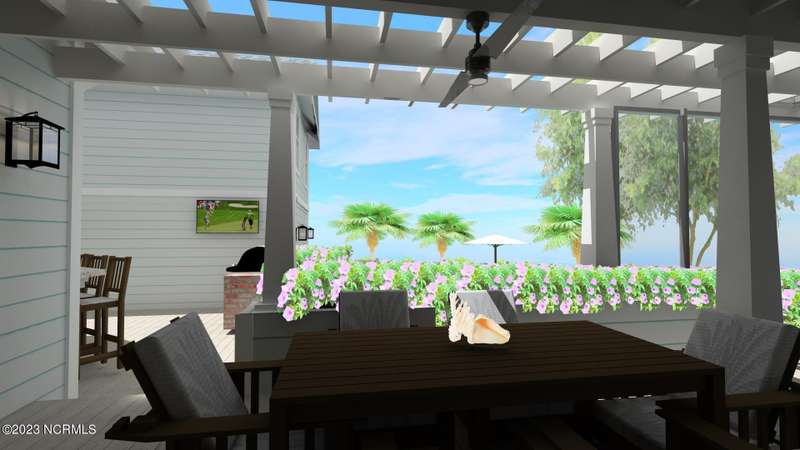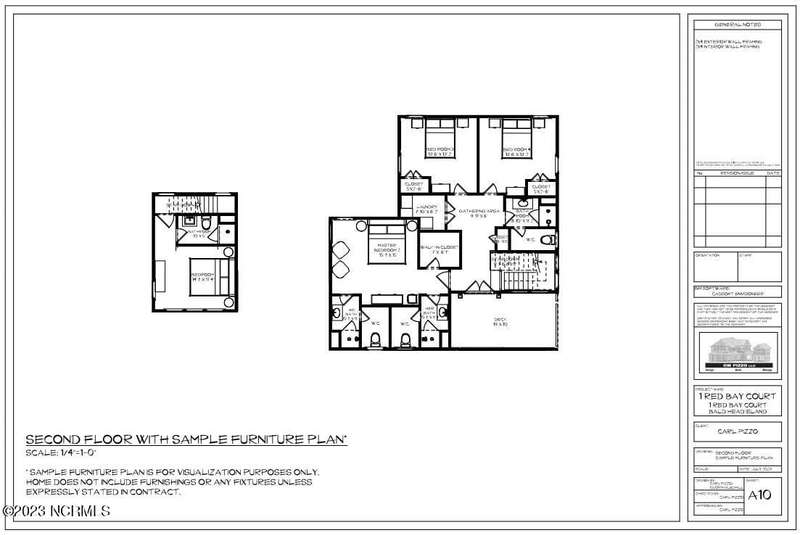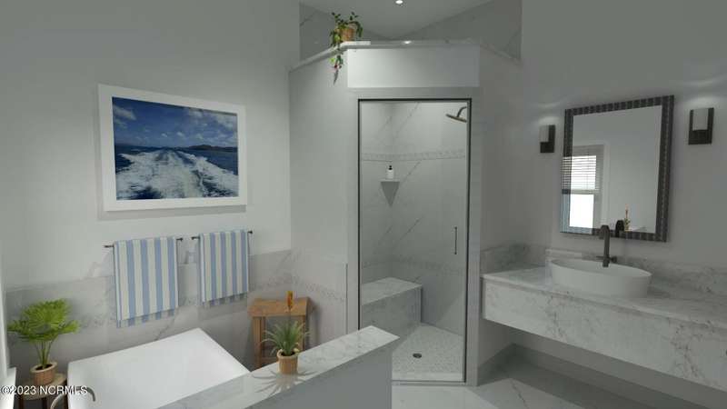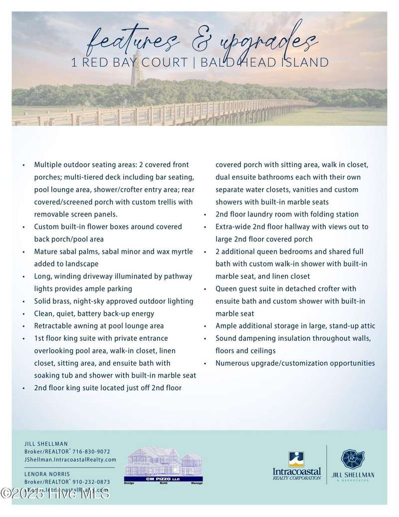 LAST CHANCE TO CUSTOMIZE/PRE-COMPLETION PRICING. ULTRA HIGH-END NEW BUILD W/EXCEPTIONAL OUTDOOR LIVING.1 Red Bay is a luxurious maritime retreat centrally located on Bald Head Island, just minutes from beaches, marina, golf, shopping and dining. It has 3193 sqft of indoor living space (2878 house/315 crofter) with 5 well-appointed bedrooms, 6 bathrooms and 2000 sqft of outdoor living space approved for optional pool. This exceptional home has been meticulously designed using the best materials for uncompromising quality and carefully curated to include custom finishes and designed fixtures. From the grand entry on the 1st floor you are greeted by gleaming hardwood floors, 10 ft ceilings and an open floor plan flowing through living spaces to a wall of French doors opening to outdoor living. Kitchen, includes custom cabinets/island, gas stove with pot filler, wet bar, wine cooler and pass-through window opening to outdoor seating. There's also a bonus rom, 1/2 bath, closet and utility room. 1st floor king suite has private entrance, walk-in closet and ensuite with custom shower with built-in marble seat and soaking tub for a spa like experience. The 2nd floor primary king suite is NEXT LEVEL LUXURY with a walk-in closet and 2 PRIVATE ENSUTE BATHROOMS - thats 2 separate vanities, showers and water closets. 2 additional bedrooms with shared bath are down the hall. All baths feature marble/stone showers with built-in marble seats. 2nd floor also includes laundry room, linen closet, attic access and wide hall leading to 2nd floor covered porch. Detached crofter has parking for 2 golf carts and guest suite with custom marble bathroom on 2nd floor. the exterior boasts generous outdoor living spaces: multi-tiered deck, 2 covered porches, screened/covered porch with trellis (removable screens), built-in flower boxes, optional in-ground pool, TV, bar seating and shower. The lush landscape provides beauty and privacy from all views.