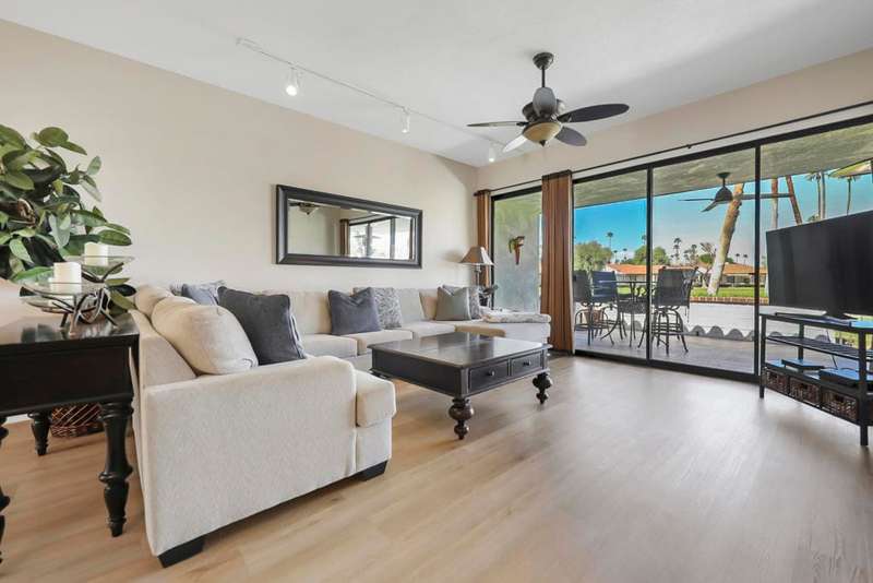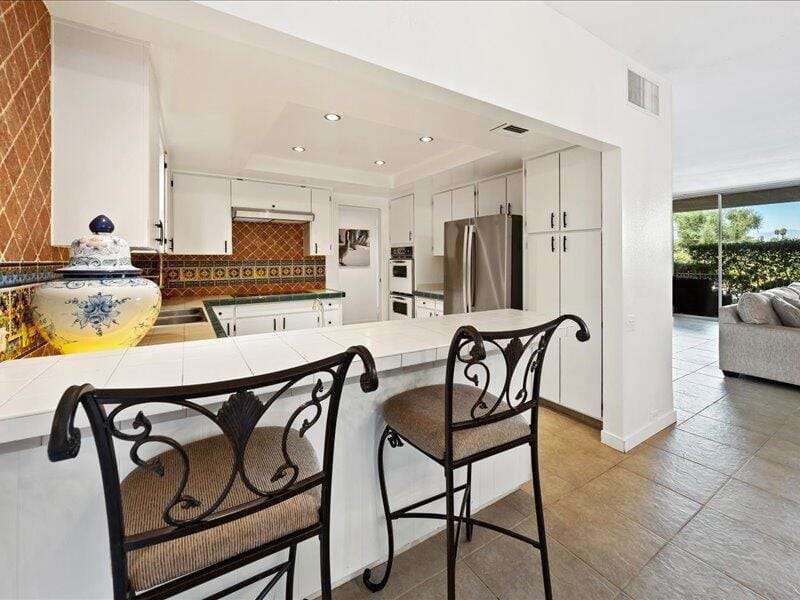 Spacious corner unit with tile flooring throughout, featuring versatile open living and dining areas. The large terrace is ideal for entertaining or relaxing and offers privacy and views of beautifully lit trees at night. 9-foot floor-to-ceiling windows fill every room with natural light; the screened patio with sliding glass door provides easy outdoor access. Living room includes Spanish style tiled fireplace. The kitchen includes beautiful hand-painted Spanish tile backsplash, ceramic tile counters, and a breakfast bar. Both spacious bedrooms have ample closet space and direct access onto the terrace. HOA dues include cable TV with HBO/Showtime, Internet Wi-Fi service, air-conditioning, water, gas, trash, much more. This spacious condo promises a blend of privacy and comfort, making it the perfect retreat for those seeking a serene yet vibrant lifestyleDesert Island is a unique hi-rise condominium community nestled on a 25-acre island surrounded by a sparkling lake and 18-hole championship golf course. Centrally located to The River shopping, movies & restaurants.