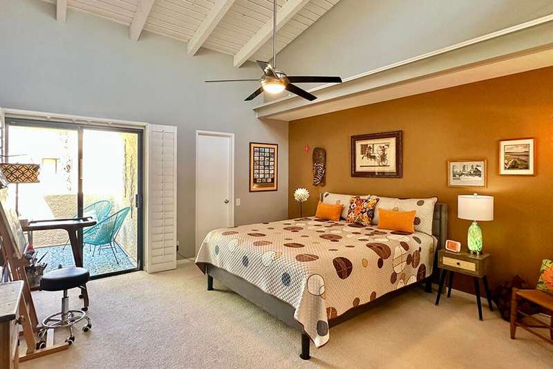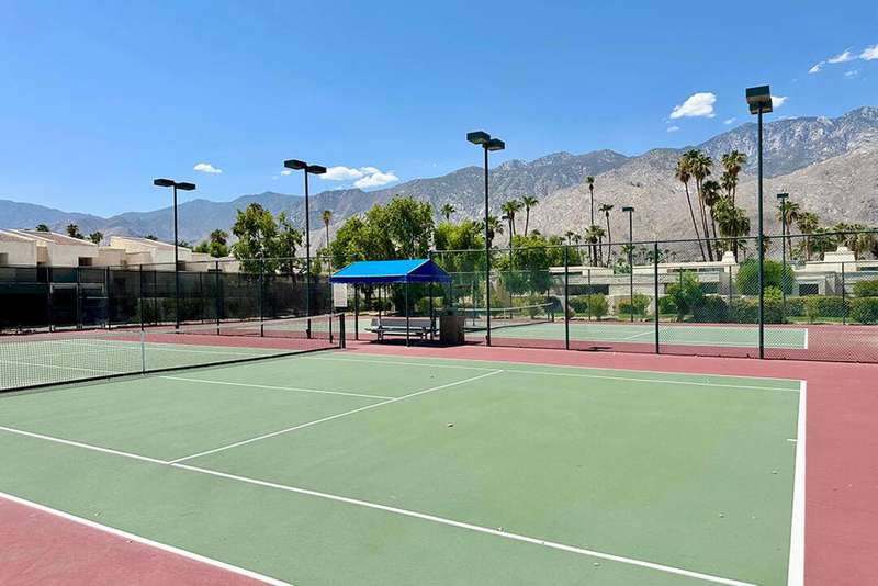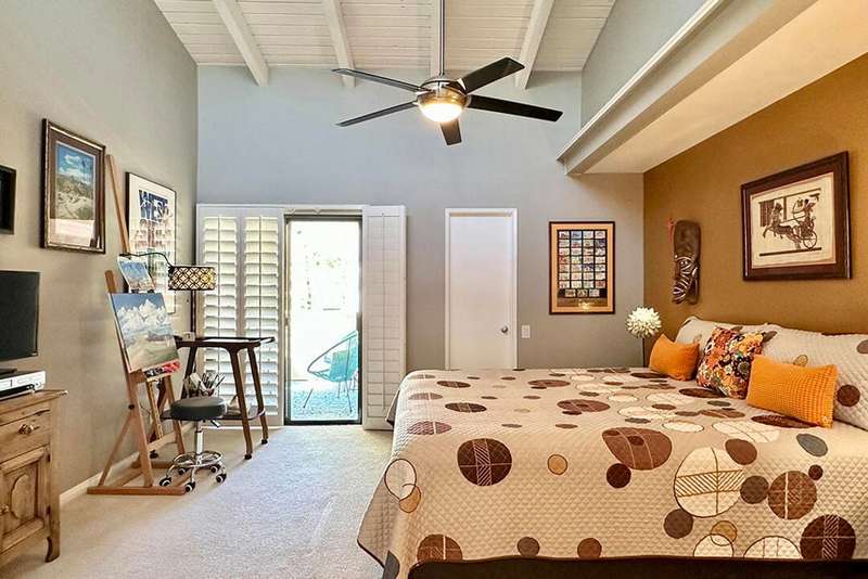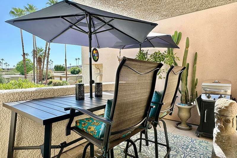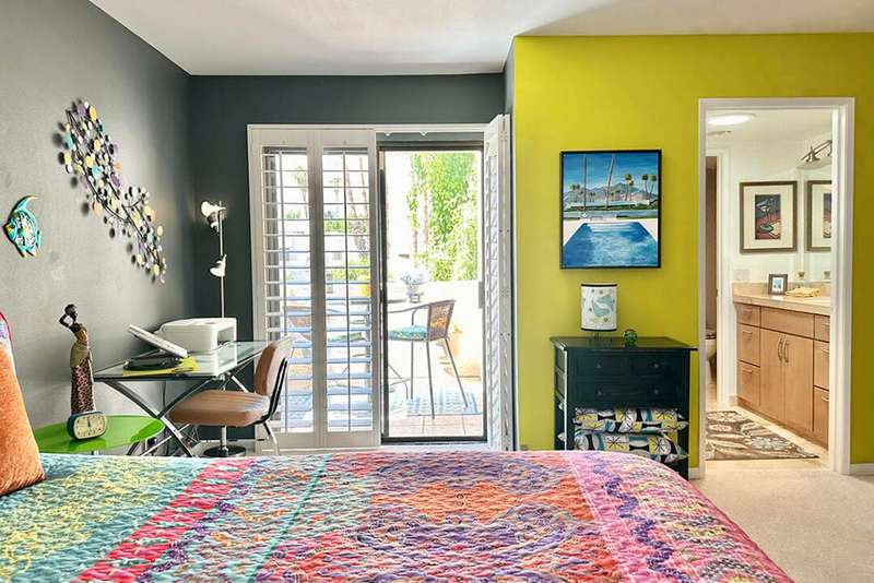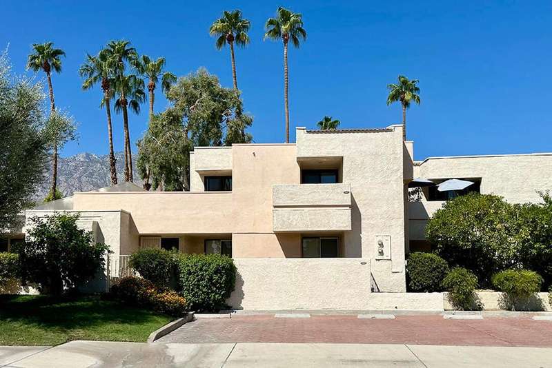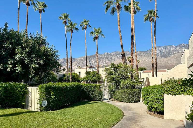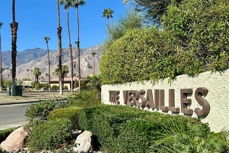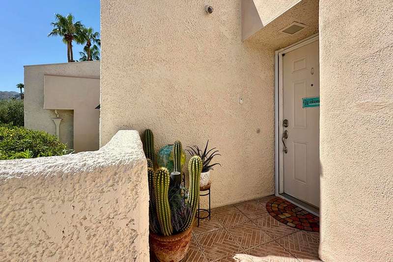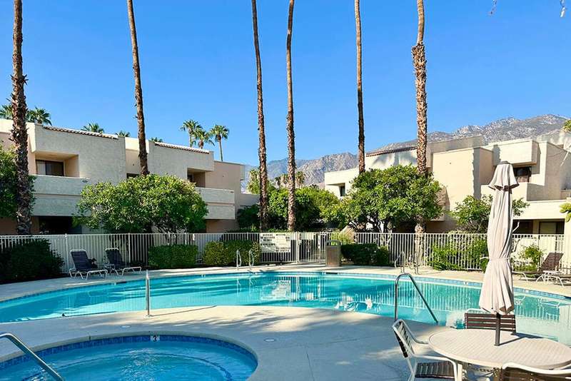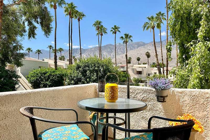 This two-bedroom South Palm Springs condo is a serene retreat with an unbeatable location. An upstairs unit, it is spacious and private, featuring vaulted wood-beam ceilings and clerestory windows that fill the home with natural light, a gorgeous kitchen, and three patios. Stylishly updated and meticulously maintained, this home showcases designer touches like custom built-ins, plantation shutters, beautiful finishes, and a seamless indoor/outdoor flow.Sliding glass doors from both the living room and dining area open to a large balcony, which is perfect for entertaining. The bedrooms also each have a private outdoor space, both of which overlook a central courtyard with community pool and spa, framed by a stunning mountain backdrop. Each bedroom also has an ensuite bathroom.Additional conveniences include an in-unit washer/dryer, a suite of newer stainless steel kitchen appliances, engineered hardwood flooring, and plush bedroom carpeting, as well as a dedicated storage closet, assigned carport, and newer HVAC and water heater. In addition, the Versailles is a vibrant condo community with an active and well-run HOA. Its convenient location across from the Smoke Tree shopping area provides unmatched convenience with grocery shopping, restaurants, coffee, and retail options. This is desert living at its finest.Additional Amenities include: HVAC system and hot water heater installed in 2021 Newer kitchen appliances: Fisher and Paykel dishwasher and LG microwave replaced five years ago. The refrigerator and Oven/stove are 10 years old. Washer and dryer are also 10 years old Two (2) well maintained and updated community tennis courts with lighting Four (4) community pools and four (4) spas: recently refurbished + new decking + newer pool furniture HOA also provides security with security cameras at all pools and carports. A security company walks the property every night Smart thermostat Furnishings are available outside of escrow per inventory