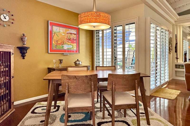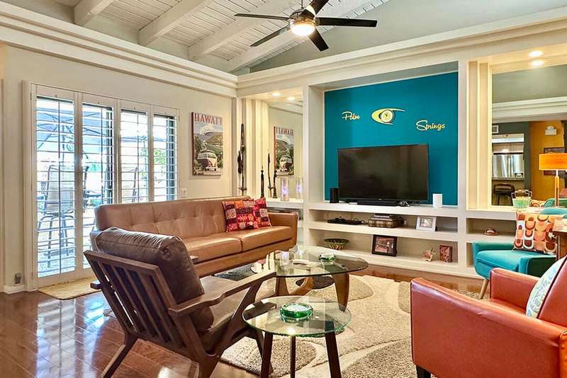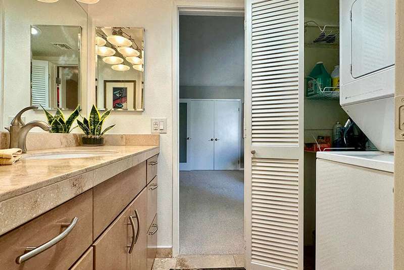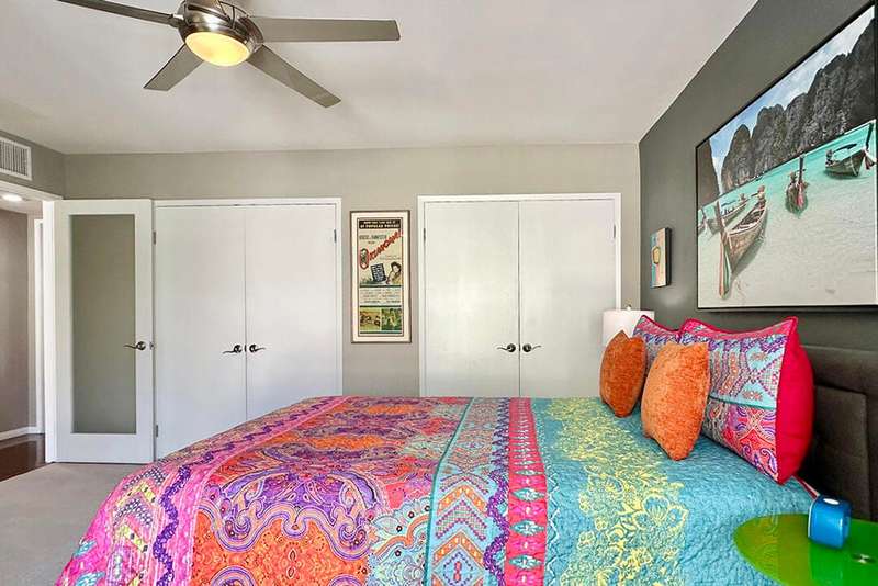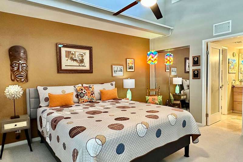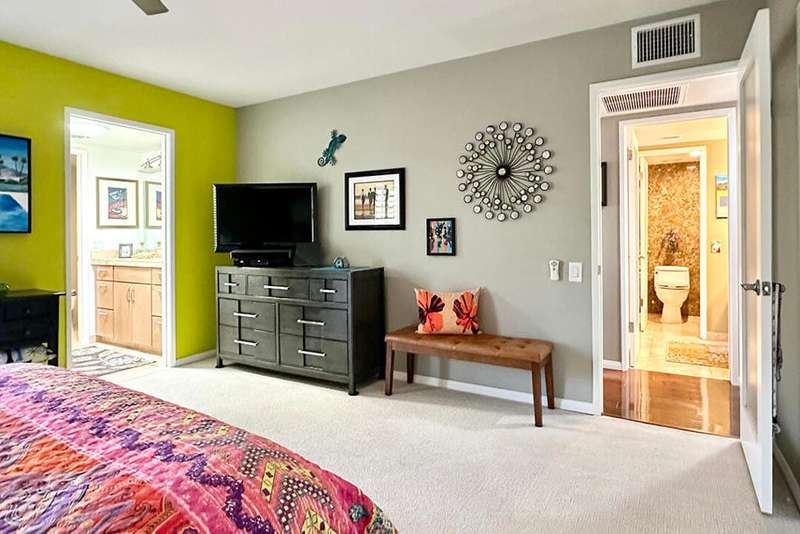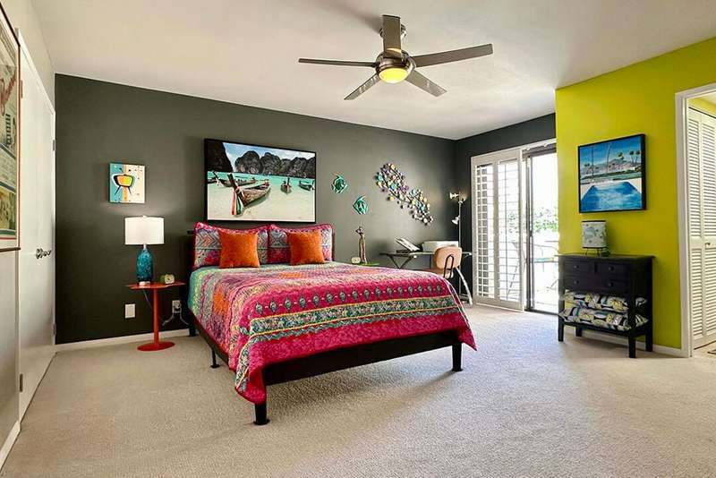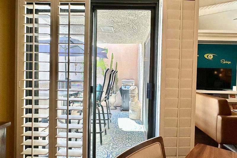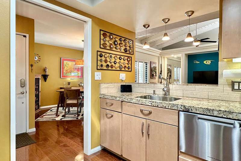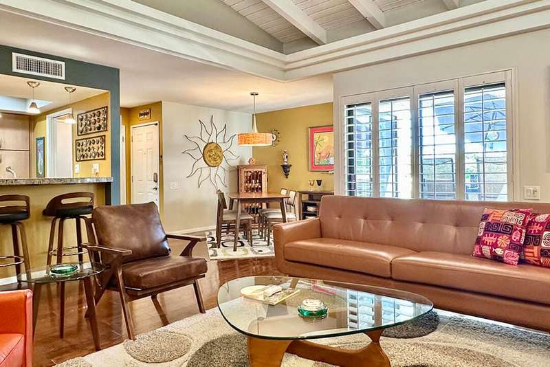 This two-bedroom South Palm Springs condo is a serene retreat with an unbeatable location. An upstairs unit, it is spacious and private, featuring vaulted wood-beam ceilings and clerestory windows that fill the home with natural light, a gorgeous kitchen, and three patios. Stylishly updated and meticulously maintained, this home showcases designer touches like custom built-ins, plantation shutters, beautiful finishes, and a seamless indoor/outdoor flow.Sliding glass doors from both the living room and dining area open to a large balcony, which is perfect for entertaining. The bedrooms also each have a private outdoor space, both of which overlook a central courtyard with community pool and spa, framed by a stunning mountain backdrop. Each bedroom also has an ensuite bathroom.Additional conveniences include an in-unit washer/dryer, a suite of newer stainless steel kitchen appliances, engineered hardwood flooring, and plush bedroom carpeting, as well as a dedicated storage closet, assigned carport, and newer HVAC and water heater. In addition, the Versailles is a vibrant condo community with an active and well-run HOA. Its convenient location across from the Smoke Tree shopping area provides unmatched convenience with grocery shopping, restaurants, coffee, and retail options. This is desert living at its finest.Additional Amenities include: HVAC system and hot water heater installed in 2021 Newer kitchen appliances: Fisher and Paykel dishwasher and LG microwave replaced five years ago. The refrigerator and Oven/stove are 10 years old. Washer and dryer are also 10 years old Two (2) well maintained and updated community tennis courts with lighting Four (4) community pools and four (4) spas: recently refurbished + new decking + newer pool furniture HOA also provides security with security cameras at all pools and carports. A security company walks the property every night Smart thermostat Furnishings are available outside of escrow per inventory