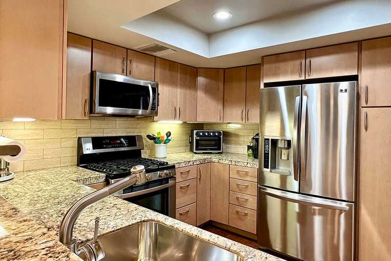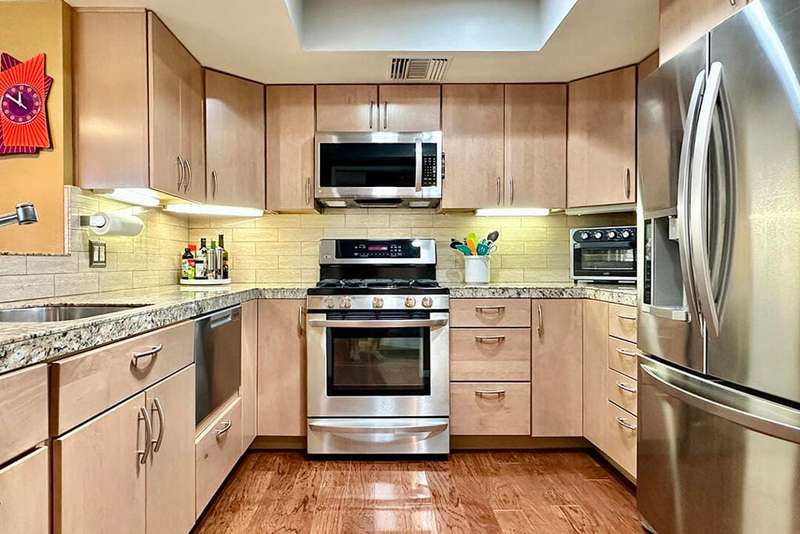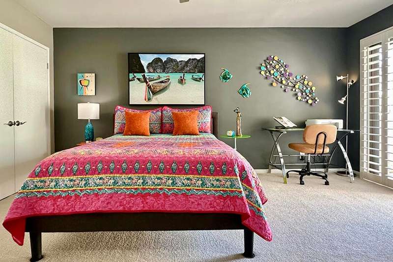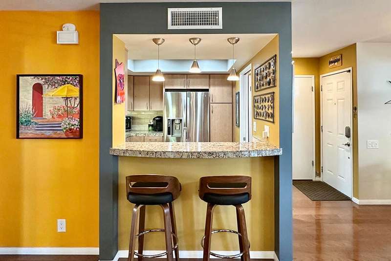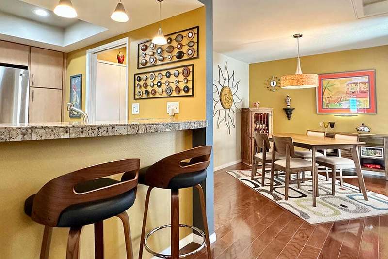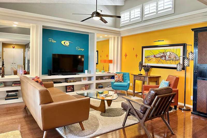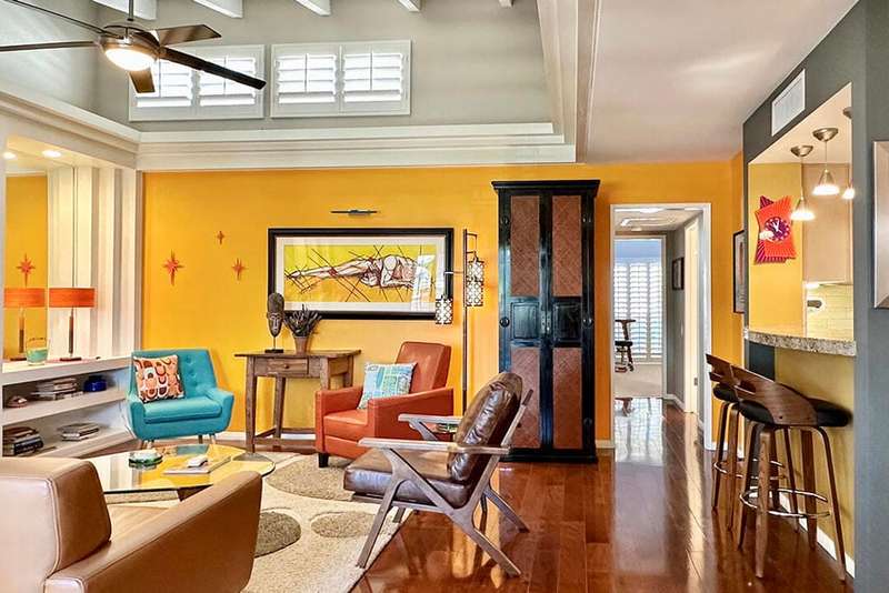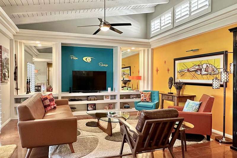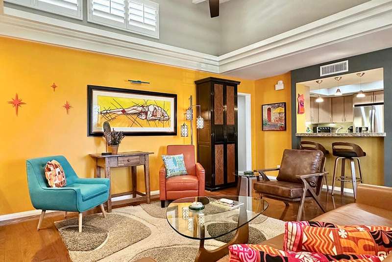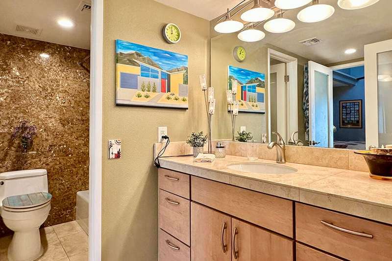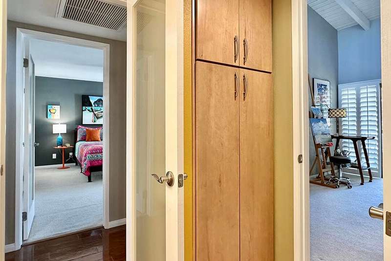 This two-bedroom South Palm Springs condo is a serene retreat with an unbeatable location. An upstairs unit, it is spacious and private, featuring vaulted wood-beam ceilings and clerestory windows that fill the home with natural light, a gorgeous kitchen, and three patios. Stylishly updated and meticulously maintained, this home showcases designer touches like custom built-ins, plantation shutters, beautiful finishes, and a seamless indoor/outdoor flow.Sliding glass doors from both the living room and dining area open to a large balcony, which is perfect for entertaining. The bedrooms also each have a private outdoor space, both of which overlook a central courtyard with community pool and spa, framed by a stunning mountain backdrop. Each bedroom also has an ensuite bathroom.Additional conveniences include an in-unit washer/dryer, a suite of newer stainless steel kitchen appliances, engineered hardwood flooring, and plush bedroom carpeting, as well as a dedicated storage closet, assigned carport, and newer HVAC and water heater. In addition, the Versailles is a vibrant condo community with an active and well-run HOA. Its convenient location across from the Smoke Tree shopping area provides unmatched convenience with grocery shopping, restaurants, coffee, and retail options. This is desert living at its finest.Additional Amenities include: HVAC system and hot water heater installed in 2021 Newer kitchen appliances: Fisher and Paykel dishwasher and LG microwave replaced five years ago. The refrigerator and Oven/stove are 10 years old. Washer and dryer are also 10 years old Two (2) well maintained and updated community tennis courts with lighting Four (4) community pools and four (4) spas: recently refurbished + new decking + newer pool furniture HOA also provides security with security cameras at all pools and carports. A security company walks the property every night Smart thermostat Furnishings are available outside of escrow per inventory
