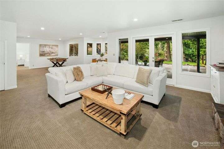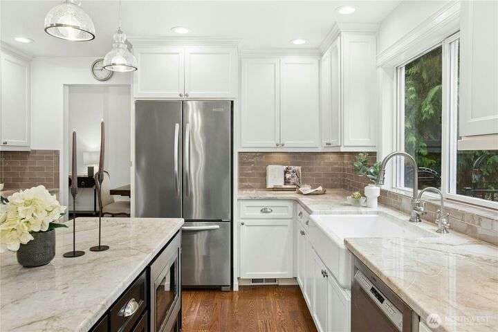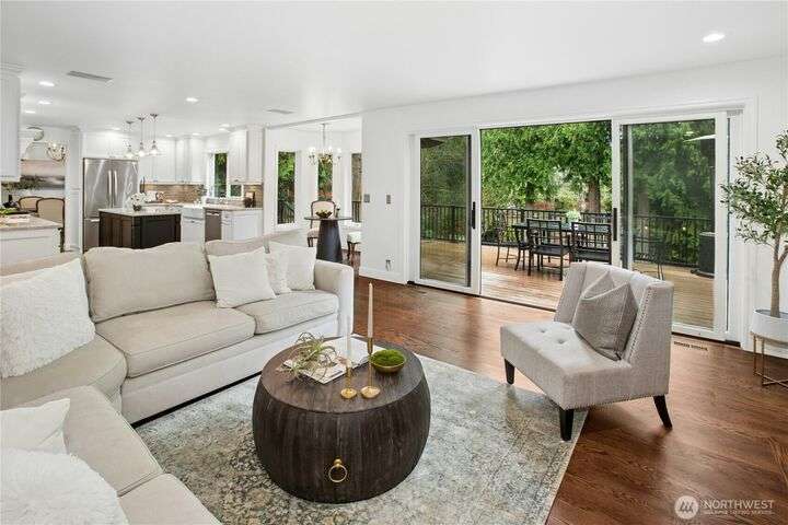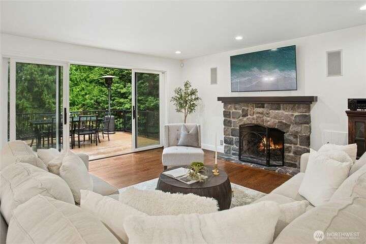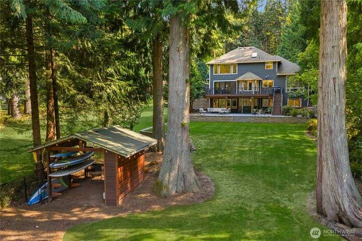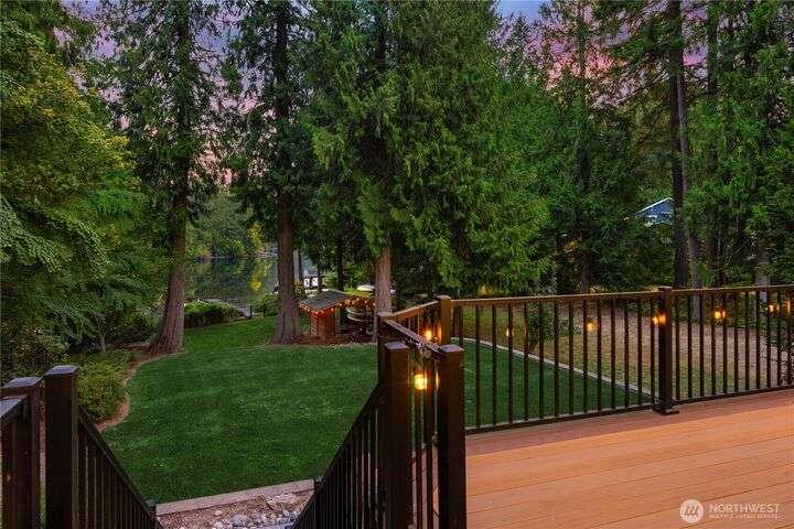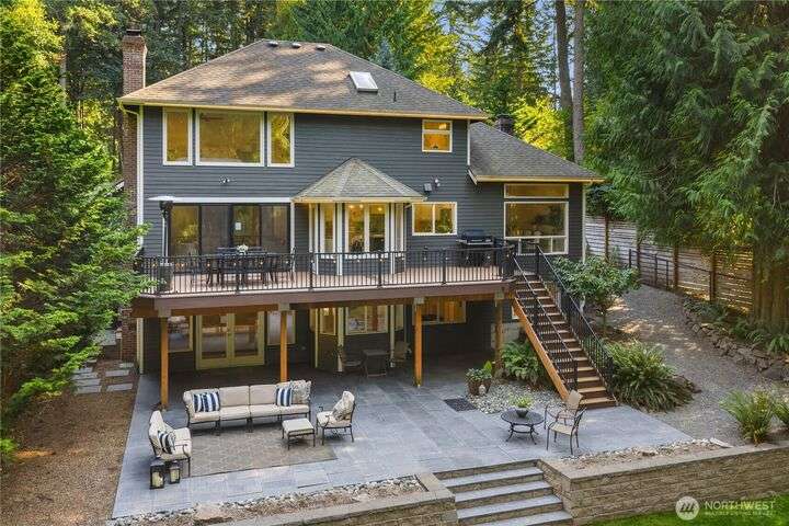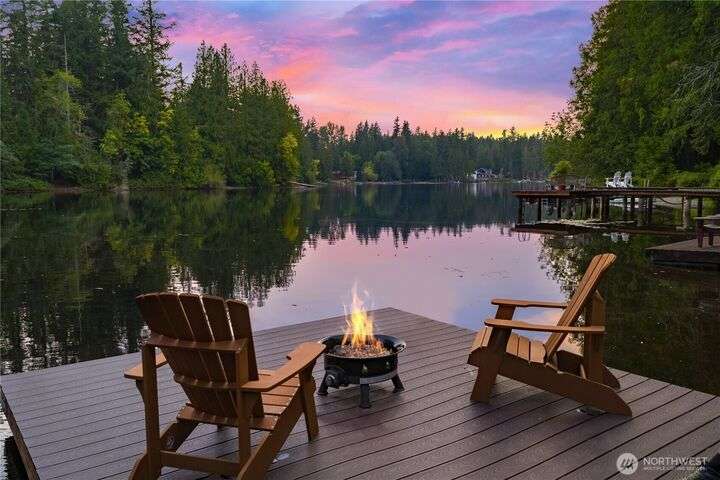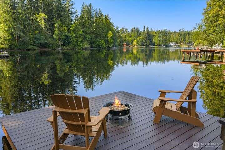 A brilliant life starts here w/ elevated style, 56 feet of waterfront on a shy acre on scenic Beaver Lake. Cohesive indoor/outdoor living provides the ultimate PNW experience. All-weather, high-end composite deck, covered patio & sprawling lawn lead to a private dock w/ floating party barge. Lakeside boathouse for paddleboards, kayaks & water toys. Timeless finishes - honed marble bathroom counters, custom cabinets, heated floor. Epicurean kitchen boasts SS appliances, 6-burner Thermador range w/ custom hood, breakfast nook & gorgeous lake views. Desirable main-level guest suite; expansive lower level w/ a lrg rec room, office, remodeled 3/4 bathroom + potential 5th bdrm. Pre-inspected and 100% turn-key. Min to I-90, schools & amenities.