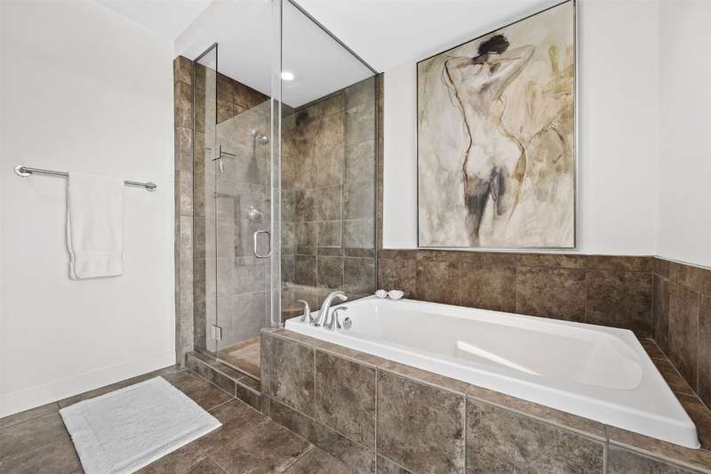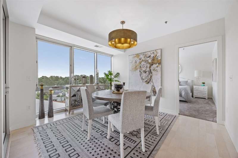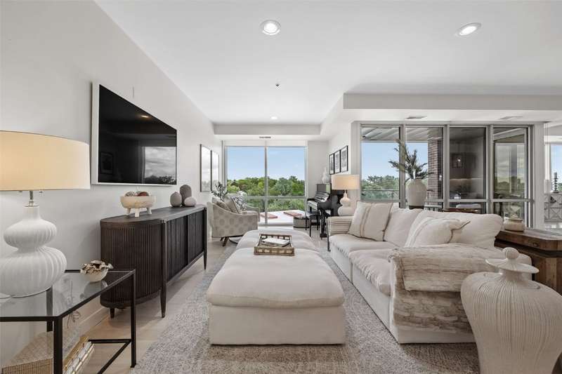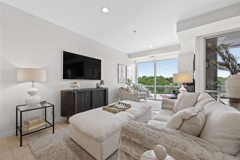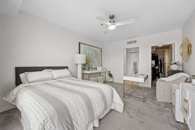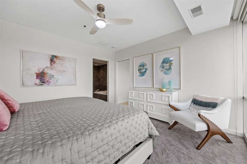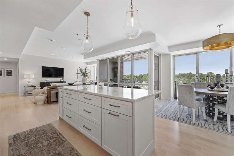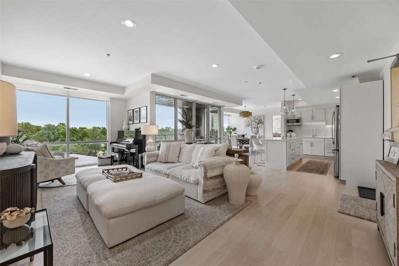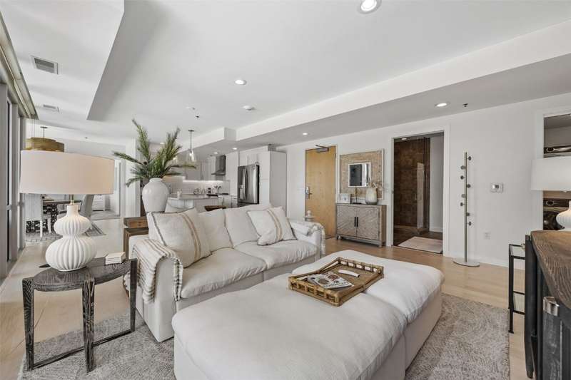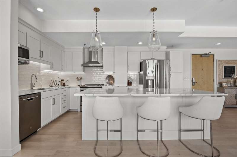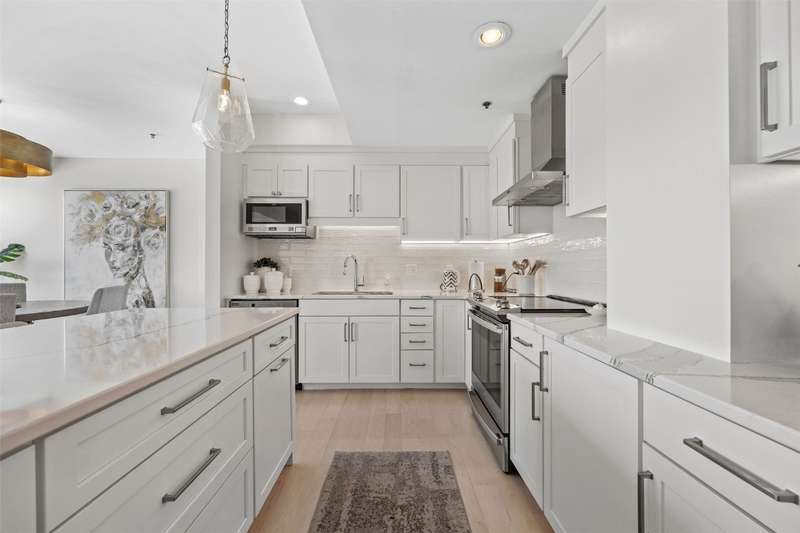 Experience sophisticated urban living in this top-floor penthouse at the prestigious Plaza on Fifth. This stunning condo offers an open-concept layout with floor-to-ceiling windows that flood the space with natural light and provide sweeping views from your private balcony. Refinished hardwood floors, the updated kitchen features quartz countertops, a striking tile backsplash, stainless steel appliances, modern pendant lighting, and a breakfast bar island perfect for entertaining. Designer touches continue throughout the primary suite and additional living spaces. Enjoy the convenience of a dedicated laundry room with custom built-ins, temperature-controlled underground parking, and a storage room . Residents also have access to a fitness center and a rentable guest suite for visitors.