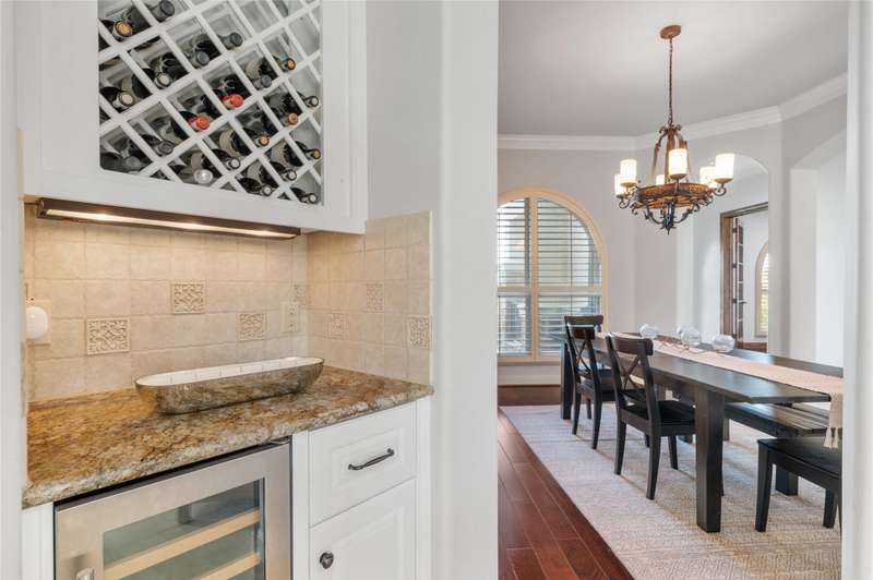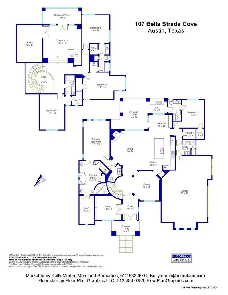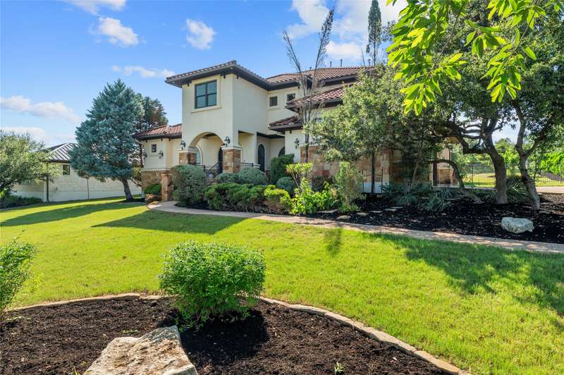 Tucked within a private gated enclave in Lakeway, 107 Bella Strada Cove offers a rare blend of lakeside luxury and Hill Country elegance. This grand, Tuscan-style estate sits on over 1 acre, beautifully framed by mature oaks and resort-style landscaping. With its stucco and stone facade, clay tile roof, and arched iron entry doors, the residence makes a striking first impression in a serene cul-de-sac setting. Inside, refined craftsmanship and natural materials echo the home's architectural roots. The open-concept layout features vaulted ceilings with hand-hewn beams, rich wood and stone finishes, and floor-to-ceiling windows that draw in natural light. The gourmet kitchen is a chef's dream, outfitted with top-tier appliances, custom cabinetry, and a large center island. Generously sized living areas, a formal dining space, and a stone-clad fireplace create an inviting environment for both grand entertaining and everyday comfort. The main-level primary suite is a true retreat, with a spa-like bathroom and spacious walk-in closet. The home also offers a main level dedicated office or study, while the upstairs media room provides the perfect space for movie nights, gaming, or a secondary living area. Residents enjoy the security of a boutique gated enclave, exemplary Lake Travis ISD schools, and quick access to golf courses, marinas, shopping, and Hill Country dining hotspots, making 107 Bella Strada Cove an exceptional blend of serenity and convenience. Tax and assessed values are estimates for illustration purposes only. All figures should be independently verified.