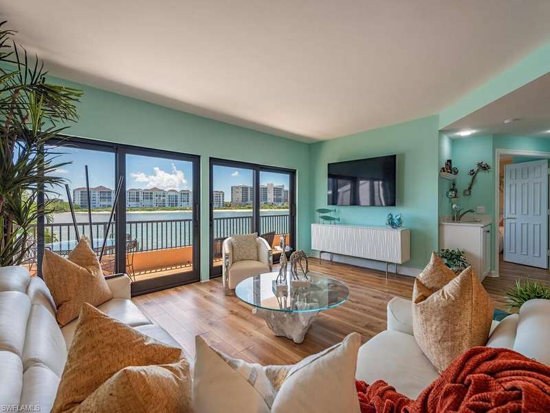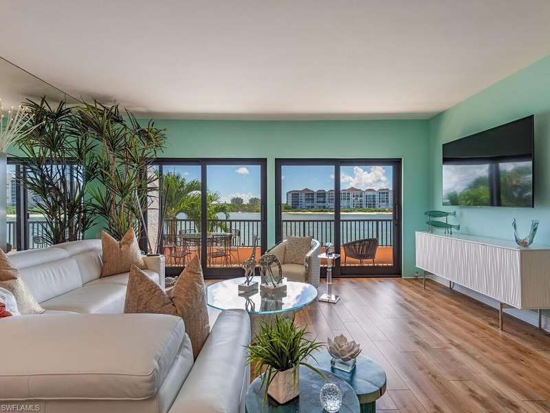 Fabulous view of the Marco River from this condo in La Peninsula on the Isles of Capri! This 2-bedroom 2-bath condo has water views from every room and is being offered furnished. Professionally decorated to reflect the coastal location with a contemporary flair using quality furnishings and attention to detail. Desirable upgrades include wide plank wood-look floors, eat-in kitchen, wet bar, quartz countertops, new a/c and plantation shutters throughout. The spacious master suite includes a luxurious bath with a soaking tub and a dramatic water view. The river front balcony has room for both a sitting and dining area, perfect for viewing the daily parade of boats traveling the intercoastal waterway and sunset over the Gulf. La Peninsula is a gated complex of 7 mid-rise luxury buildings and home to The Club at La Peninsula where you will find the clubhouse with party room featuring wet bar and kitchen, fitness room, heated pool and spa. Come and enjoy view!