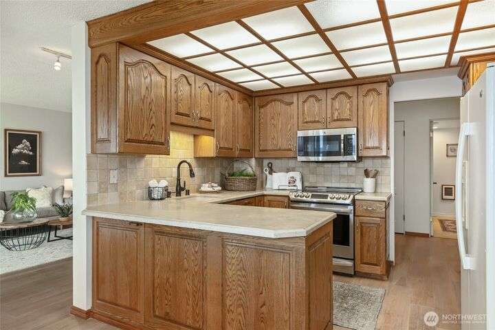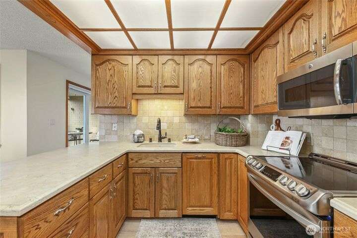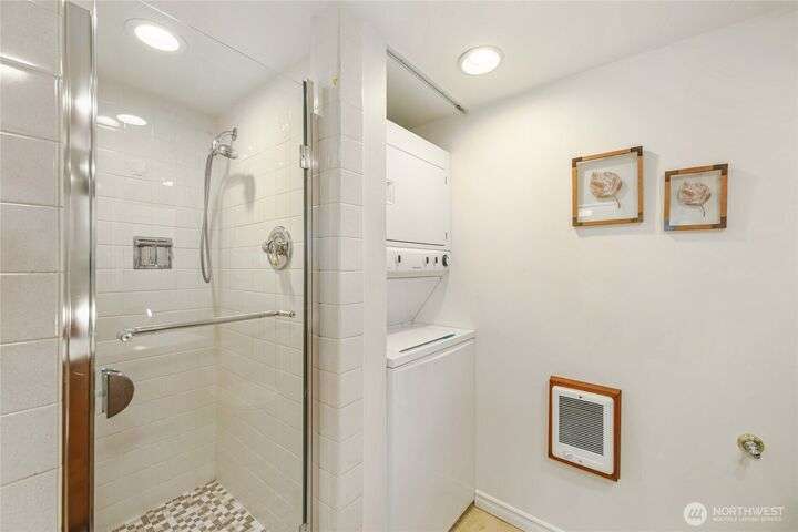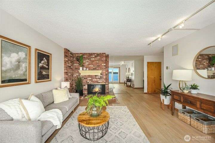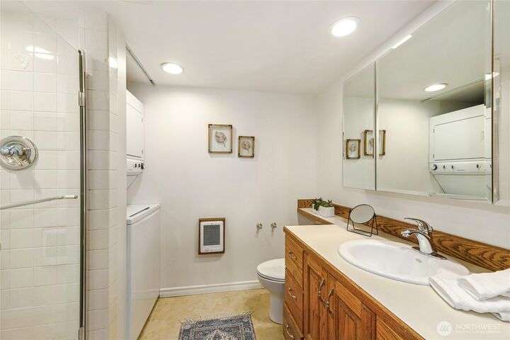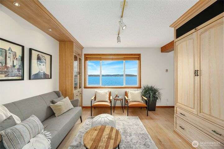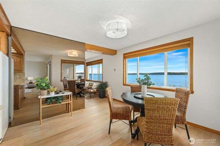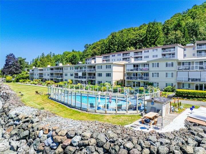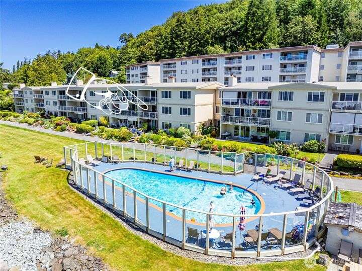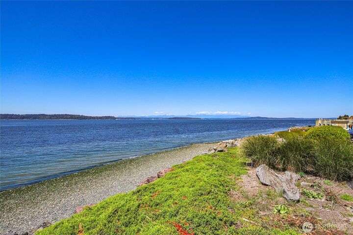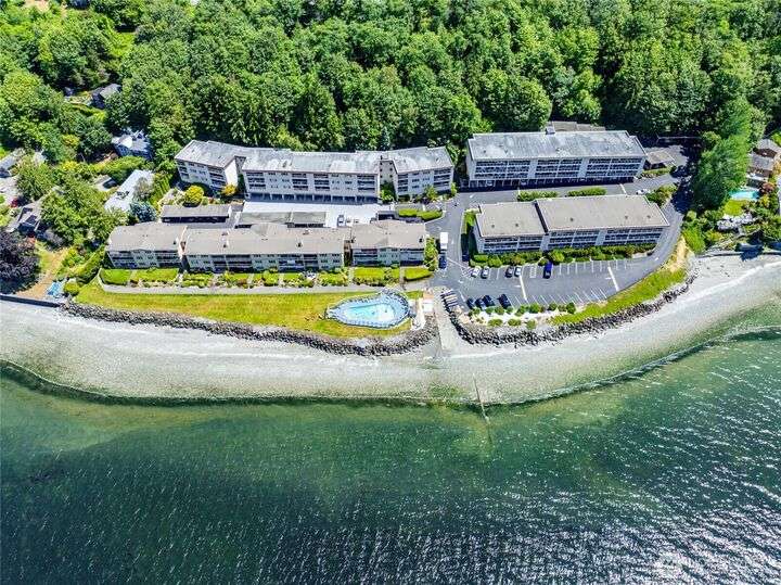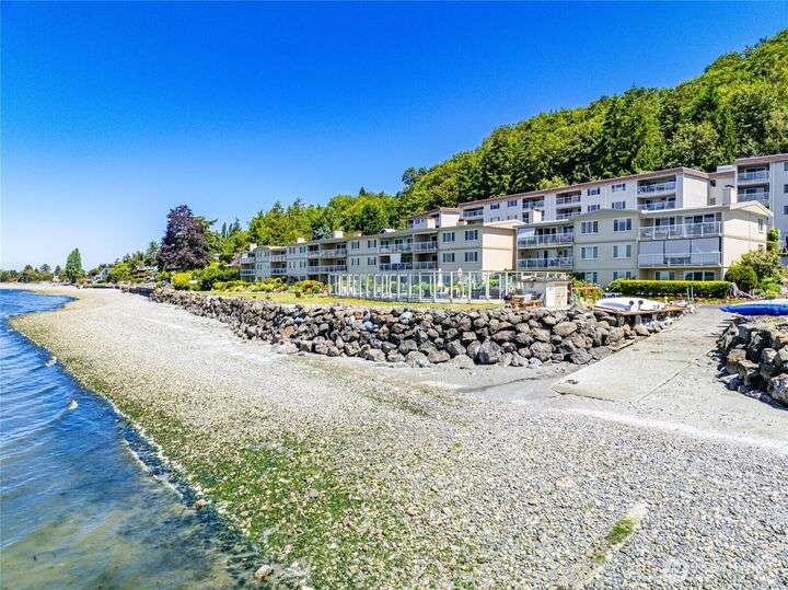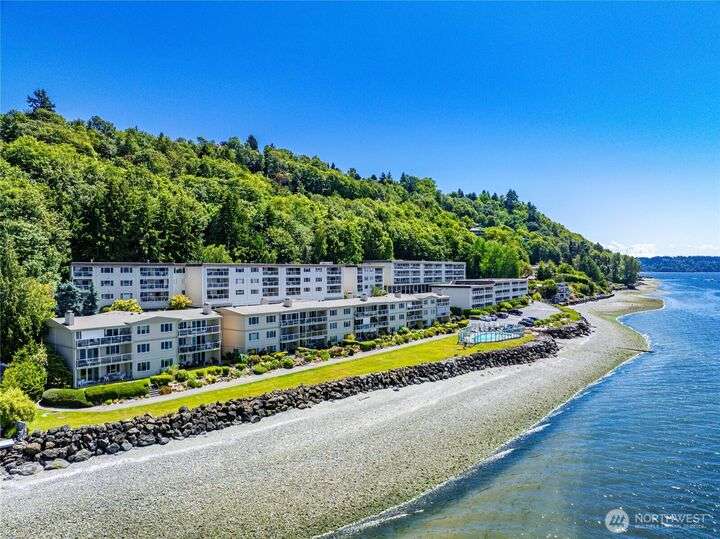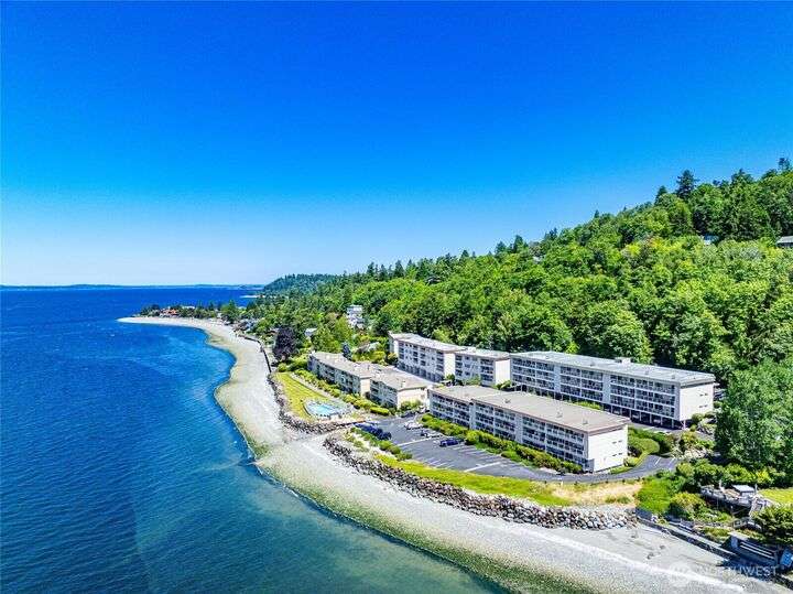 Enter a tree lined drive and come out at the beach! This quiet condo community in Brace Point is one of West Seattle's best kept secrets. Located at the water's edge on nearly 5 acres, West Beach boasts a private beach, boat launch, pool, common room, and work shop. The building has just been fully replumbed, has a new water heater and new paint. 1 big bedroom with en suite 3/4 bath, walk in closet plus second closet, 2nd non conforming BR/den with extensive built in cabinetry, 3/4 bath, kitchen w/ breakfast bar and dining room, big living room with electric fp and oversized slider to large covered deck. All rooms have western view of mountains,water and glorious sunsets. Parking in common garage, extra storage. The perfect staycation!