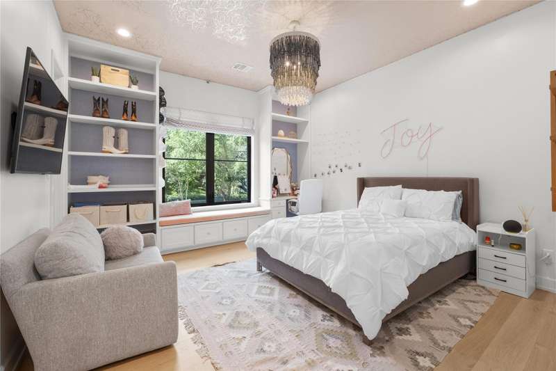 The main-level primary suite provides convenience and privacy, while the upper level features three additional bedrooms--each with its own full bath--and a secondary living area ideal for media or playroom. One bedroom includes a custom Murphy bed, easily converting the space from a gym to a guest suite.