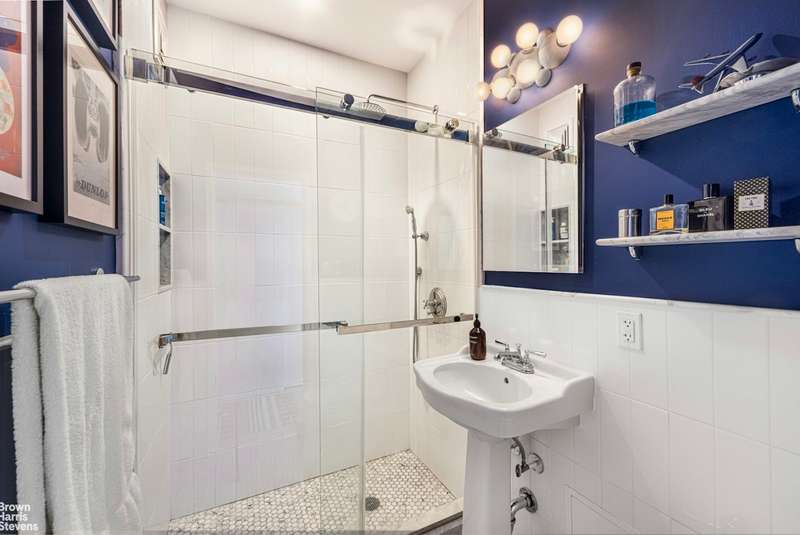 The bathroom's recent gut renovation includes new piping, electrical wiring, and sleek new fixtures, with a vintage look to keep in the spirit of the buildings past. A modern walk in rain shower has been added to replace the traditional bathtub.