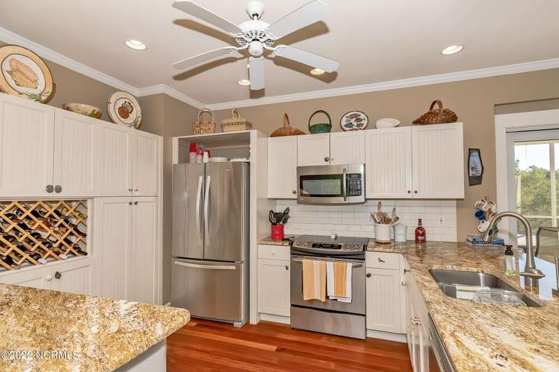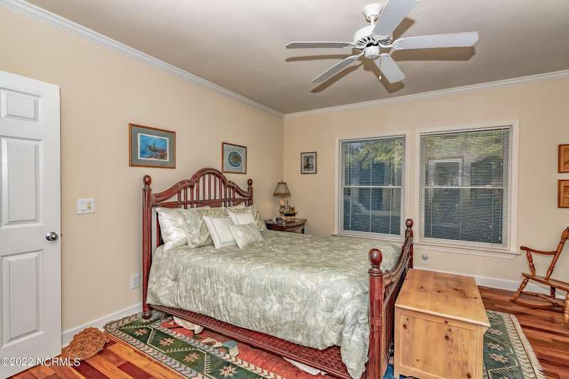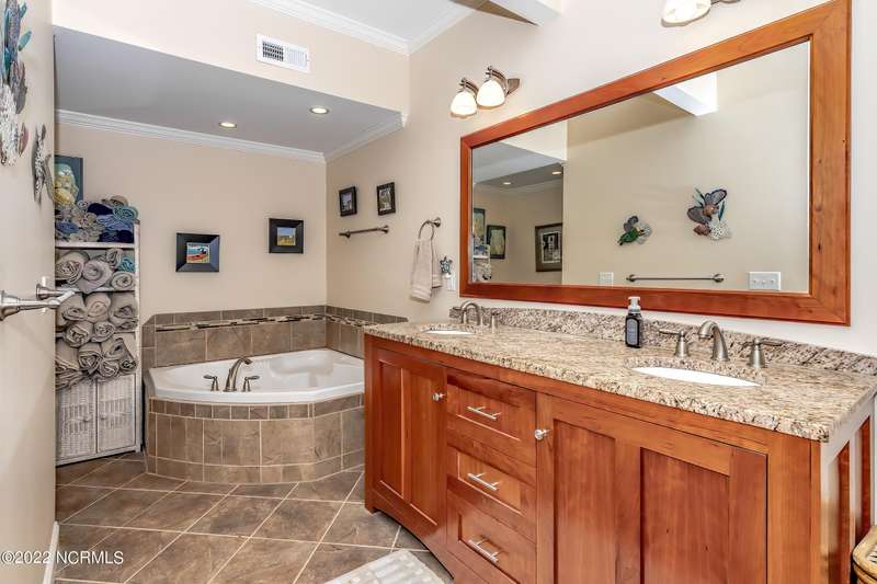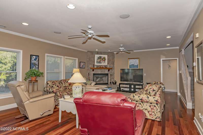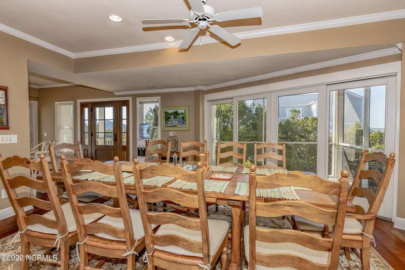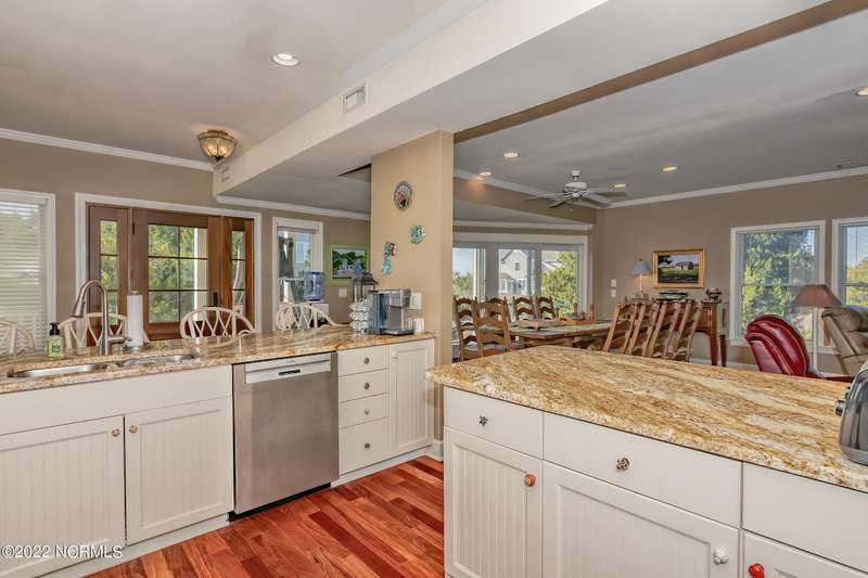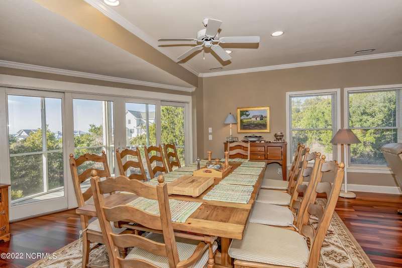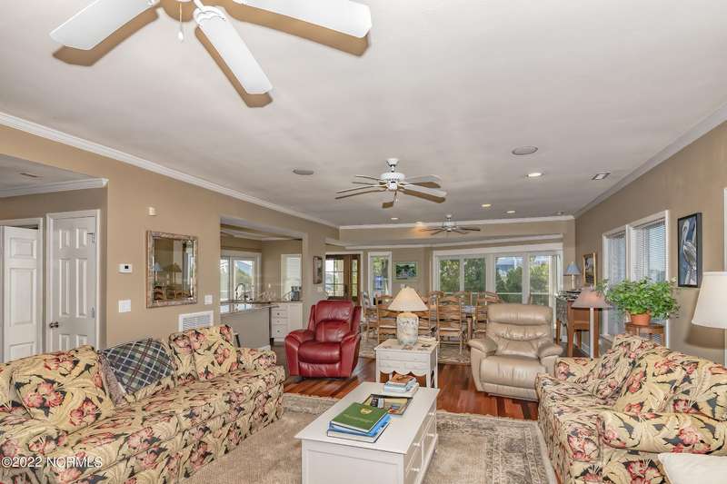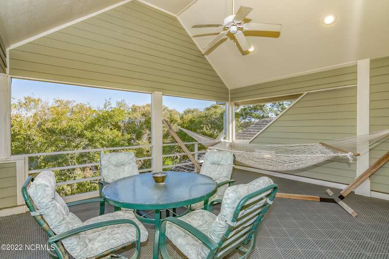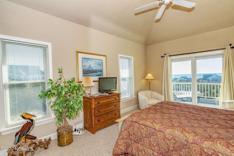 Perched on Bald Head's high dunes, enjoying Atlantic seascapes, this roomy six-bedroom, four-bath home is ideal for families. Open the striking mahogany front door to this retreat's open floor plan featuring Brazilian cherry hardwoods. To your left, an oversize dining space is furnished with a table for ten and opens onto a front screen porch. The adjacent kitchen's breakfast bar offers four more seats and egress to the sunny, screened dining porch. Relish alfresco feasting while savoring meals and water vistas. The gourmet kitchen boasts stunning granite counters, bead board cabinets, stainless appliances and wine storage. Nearby, the spacious living area is anchored by a wood-burning fireplace and begs for large gatherings. Down a short hallway, a natural-light-filled King Master suite bestows ocean views when you awake. Step through your private access to the front screened porch or luxuriate in the pampering ensuite with a dual granite vanity, sunken garden tub and oversize tiled shower. Another hallway leads to a sunny corner Queen bedroom with dune wildlife perspectives and private access to the hall Jack-and-Jill full bath. Tucked farther down a hall and up a few steps, another very private King bedroom, with a vaulted ceiling, also uses the hall bath. In addition, this level houses the laundry and access to the two-cart garage with a six- and a four-passenger cart. Upstairs, the bright Grand King Master-with its large flat screen, sofa, game table and ensuite-proffers South Beach panoramas inside and on its generous sun deck. This floor also provides two sunlit ocean-side Queen bedrooms, each with amazing views and glass doors to the sundeck. They share the hall bath. The landing on this floor tenders built-ins and entrée to a generous, serene back screened porch-furnished with a hammock and another dining table. Nap away the afternoon or revel in your own quiet time. Full equity membership to the BHI Club .
