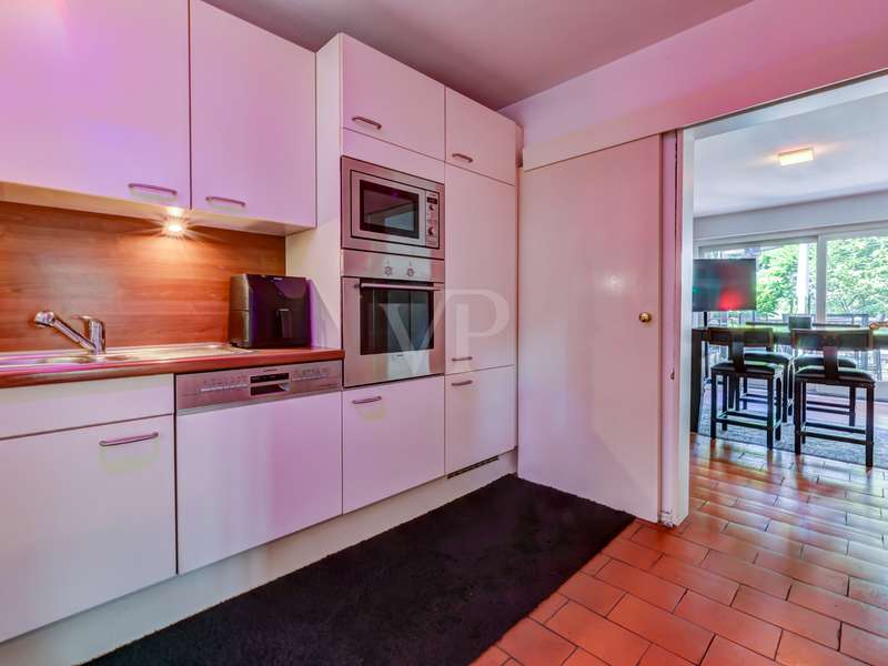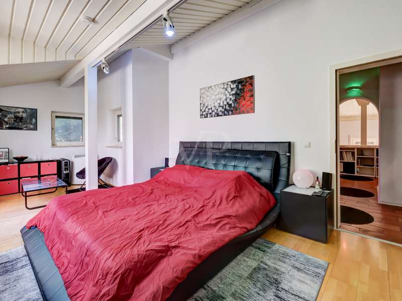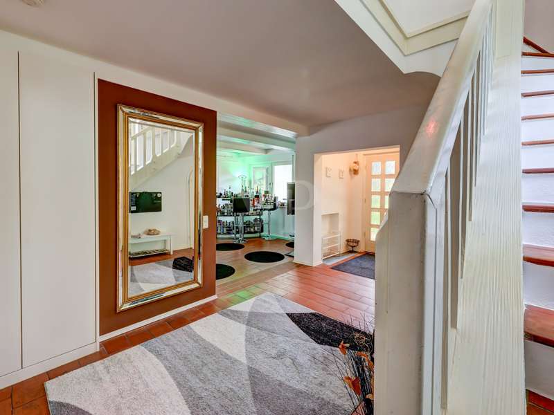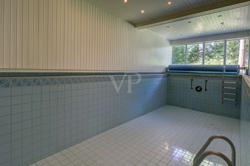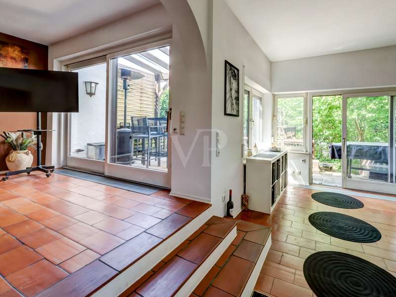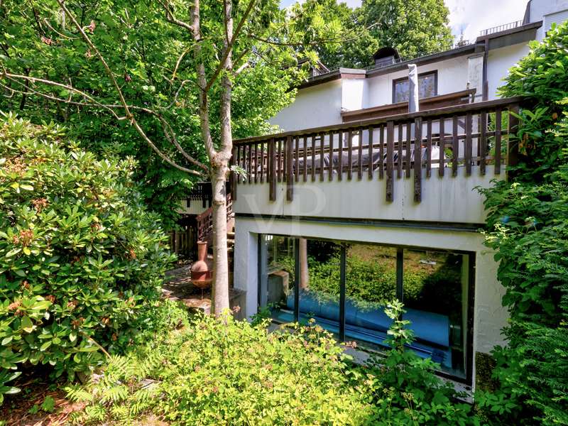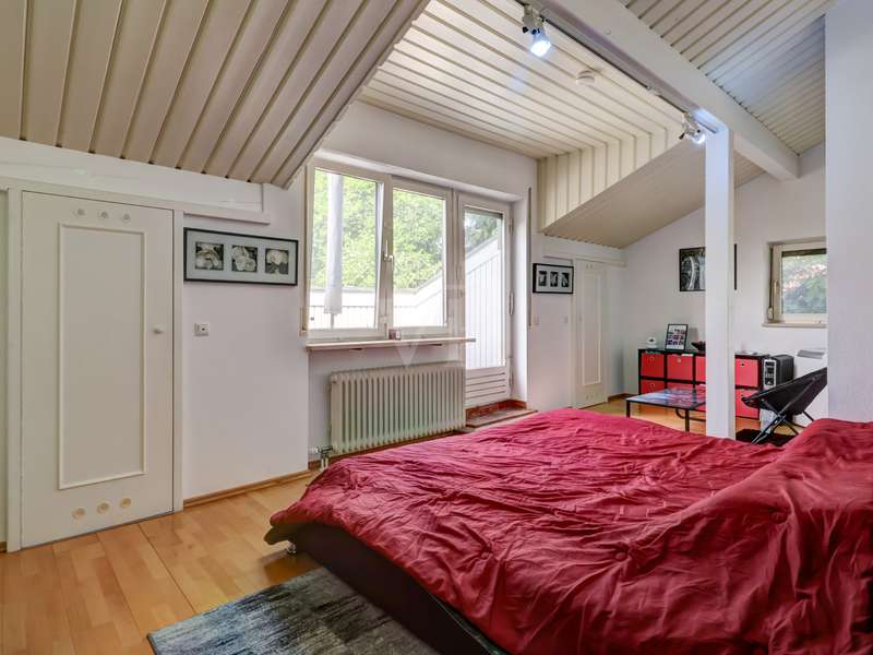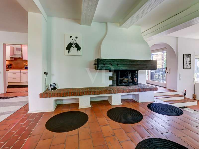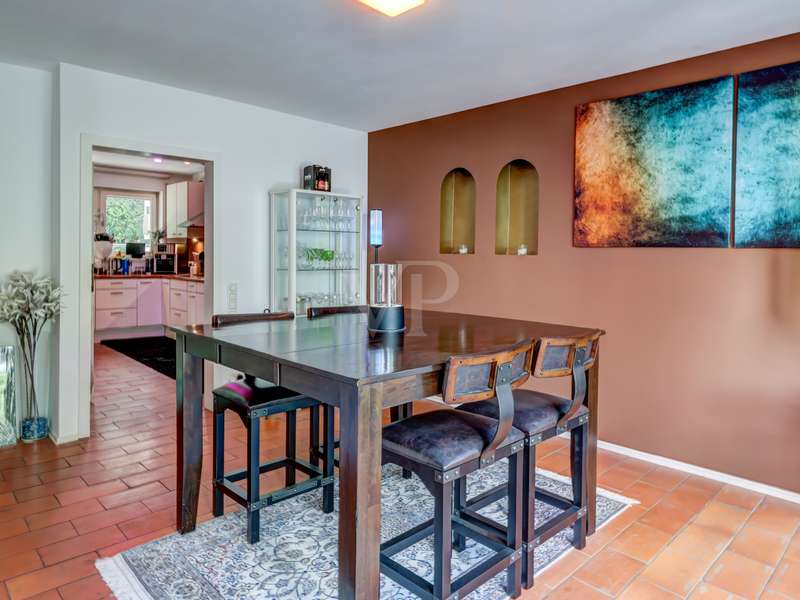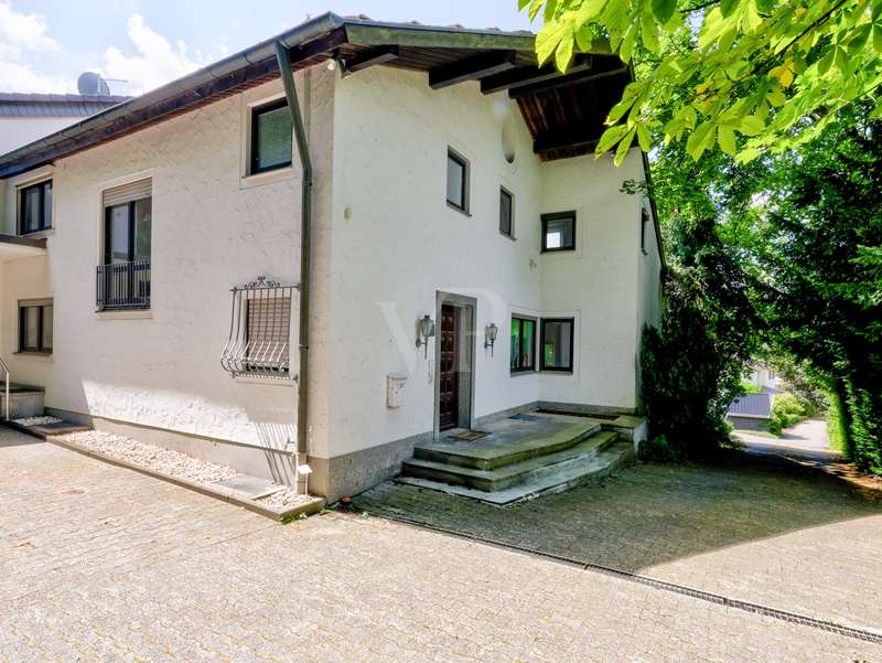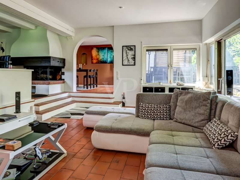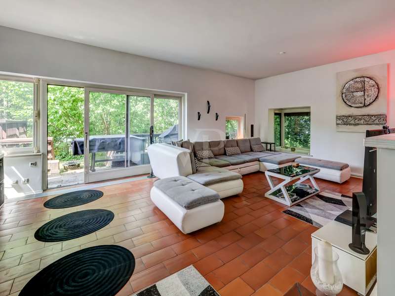 Exclusive oasis of calm with wellness area, split-level architecture and impressive sense of space In an absolutely quiet, barely visible location at the end of a private residential street, a special kind of residential gem awaits you: this extraordinary property combines spaciousness, privacy and stylish living at the highest level - ideal for people with high standards of comfort, space and retreat. On a total living area of approx. 250 m² - of which around 201 m² is pure living space (excluding swimming pool and terrace areas) - an overall architectural concept opens up that impresses with open levels, light-flooded rooms and a charming split-level design. Generosity, style and functionality come together here. The spacious living area with impressive corner fireplace invites you to spend relaxing evenings and impresses with its unique sense of space. With its floor-to-ceiling windows and direct access to the partially covered terraces and an idyllic loggia, the adjoining dining room offers a harmonious interplay of indoor and outdoor areas - ideal for sociable evenings and relaxing hours in the countryside. The private wellness area in the basement is a real highlight: the swimming pool (2.5 × 10 m), which is currently closed but can easily be reactivated, and an in-house sauna offer a luxurious spa feeling within your own four walls - all year round and completely undisturbed. The three bedrooms, one of which has a walk-in closet, offer plenty of retreats for the whole family. The space is complemented by a modern guest WC, an additional guest shower room and high-quality real wood parquet flooring on the upper floor, which creates a warm, homely atmosphere. The garden level has a separate living area with its own terrace, which is ideal for use as a granny apartment, office, studio or guest apartment. Three spacious cellar rooms offer additional storage space and room for hobbies or a workshop. Several parking spaces are available outside, and an alarm system provides an additional sense of security. Thanks to the cozy underfloor heating under elegant terracotta floors, the generous room layout and the wide range of possible uses, this property is perfect for families or couples who want to combine stylish living with wellness and retreat quality. Note on use: The property is currently rented out for €3,000 basic rent. If you wish to use the property yourself, you can do so subject to the statutory notice period of 6 months. The relationship with the current tenant is very good - a short-term viewing by arrangement is possible without any problems.