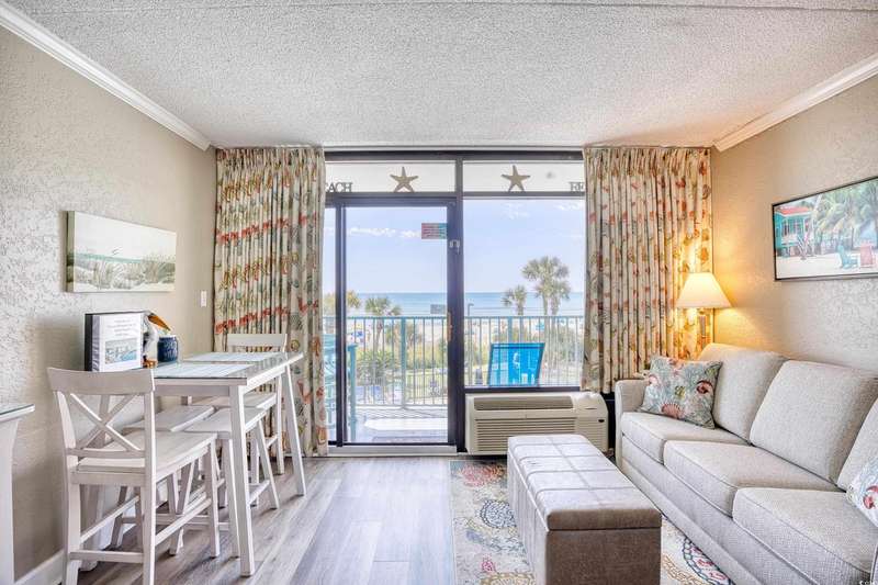 Looking for that fabulous oceanfront condo? This gem is located on the 2nd floor, offering easy access to all the amenities Sand Dunes has to offer. No long walks needed to enjoy the facilities. This condo is situated just above the outdoor pool and on the same floor as the indoor pool. Right downstairs, you'll find the exit to the beach, pool, and gym. Restaurants, a convenience store, arcade area, and laundromat are all available on the first floor. This beautifully decorated condo has been updated with vinyl plank flooring and features a king-size bed and sleeper sofa. With this condotel, you have the flexibility to rent it out yourself, hire a management company, or use the onsite rental service. The choice is yours! HOA payment includes all expenses except for taxes and HO-6 insurance. Owner is SC Realtor.