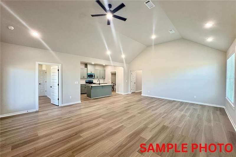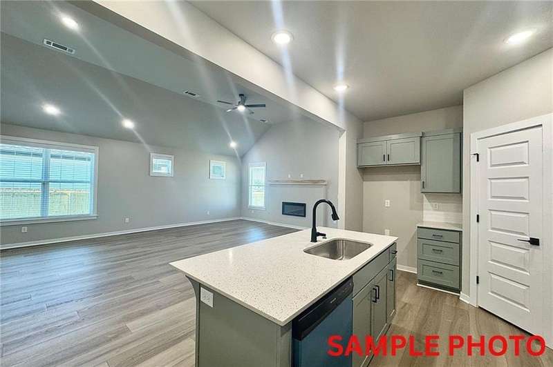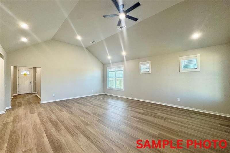 Fence, blinds and gutters included! Discover your dream home in the new neighborhood- Jacob's Crossing. Caden plan with 1 level, garage on the right & North facing! 13 ft ceilings in the living and dining, linear electric fireplace, LVP flooring throughout the main living areas & primary bedroom, quartz countertops & more. Chef's kitchen boasting frigidaire stainless steel appliances, gas range, pantry, quartz countertops, bar pull handles, large island & gorgeous backsplash. Luxurious primary bedroom features abundant natural light, while the spa-like primary bathroom offers a walk-in shower, double sinks, tub & spacious walk-in closets. Additional features include two large secondary bedrooms & a functional laundry room. Nestled on a generous lot with covered patio that overlooks the serene sodded, fully fenced backyard, creating an exceptional living experience. Sturdy concrete siding! Model home located at 3631 Tranquility St- Lot 1.