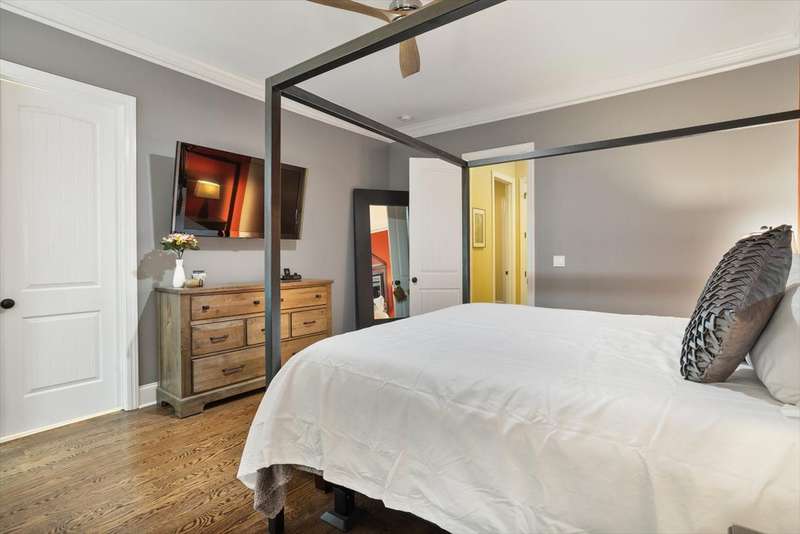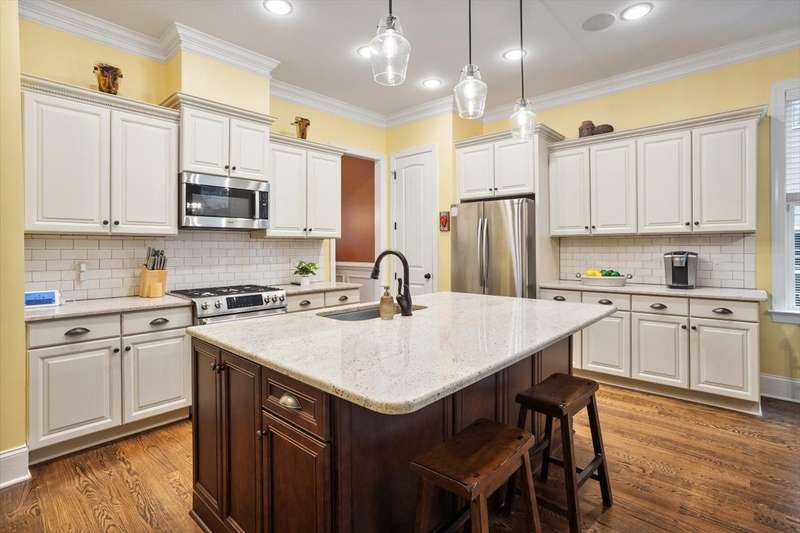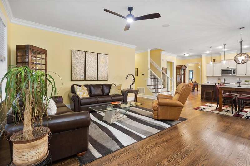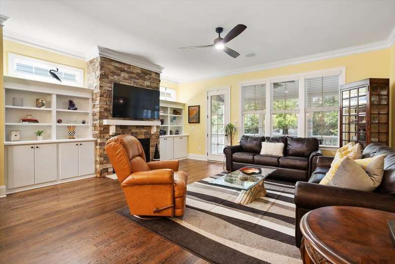 Welcome to this exceptional property located at 8039 Brandyapple Drive, perfectly situated in the highly desirable Yorkchester subdivision. This home offers a unique blend of style and tranquility with complete main floor living highly sought by today's homebuyers. Arriving at the home, you will see the meticulous care and warmth this house offers from the manicured lawn to the rocking chair front porch. Stepping inside, you'll be greeted by an entry hall that opens to a formal dining room with boxed paneling and crown molding, perfect for entertaining, dinner parties, and family events. This open concept floorplan features site-finished hardwood floors on the main living area and an abundance of natural light highlighting the modern kitchen, family room and covered patio outside. The large kitchen island features granite countertops with cabinets on 3 sides and 2 kitchen bins. The kitchen has a gas range, all stainless-steel appliances and a large stainless-steel sink. The kitchen opens to an eat-in breakfast area and large family room, with gas fireplace for staying warm and beautiful custom built-ins with ample space to display your treasures. A unique feature above the fireplace is the pull-down/out/swivel TV stand which allows you to comfortably watch your favorite programs from the kitchen, family room or breakfast area. Start your day off or wind down relaxing on the recently updated screened porch and peaceful backyard surrounded by mature landscaping. Enjoy the extended and enclosed patio area, featuring a custom stained non-slip epoxy flooring. Designed for entertaining in mind, the entire first floor living areas have built-in speakers to enjoy music while relaxing or entertaining. The main level concludes with a private hallway leading to the primary bedroom and guest suite with its own ensuite bath. The primary bedroom is your serene sanctuary to relax and unwind with a private bathroom featuring ceramic tiled flooring, a dual vanity with granite countertop, and an oversized ceramic tiled shower. The primary closet has ample hanging space and custom wood shelving for shoes, hats, sweaters, etc. Upstairs, you'll find two generously sized bedrooms and a versatile bonus room, perfect for family or guests. Additionally, there are two large walk-in attics for storage, and an opportunity to finish this space to add additional square footage for another bedroom, bath or flex space. The entire house was recently repainted and the main floor has a new HVAC system. Wireless alarm system does NOT convey. Yorkchester is ideally located near schools, shopping, dining, major highways and RDU, offering comfort, convenience, and lasting value in a sought-after neighborhood. Welcome home.