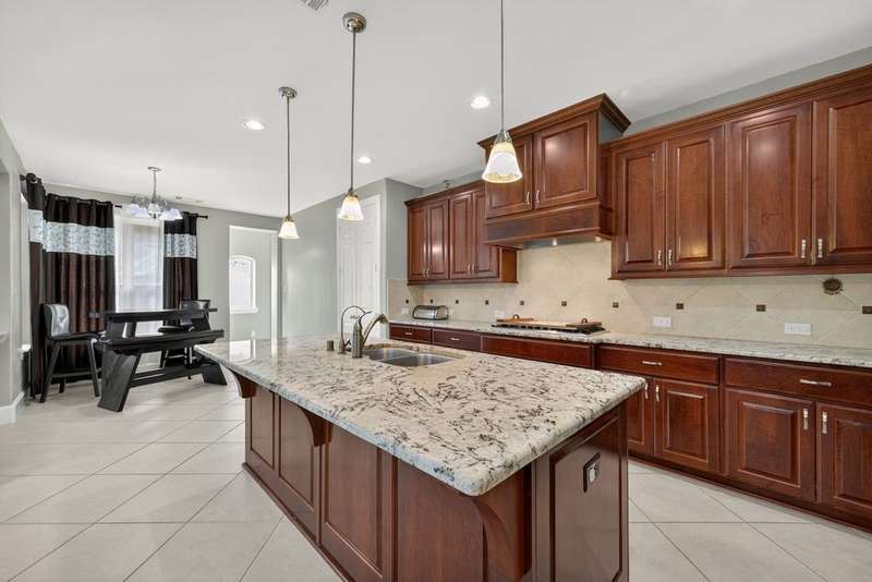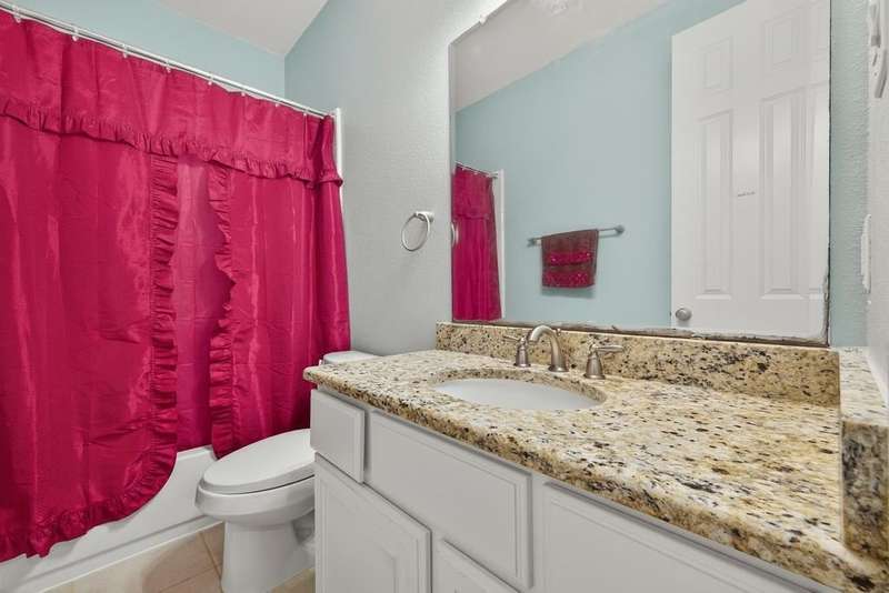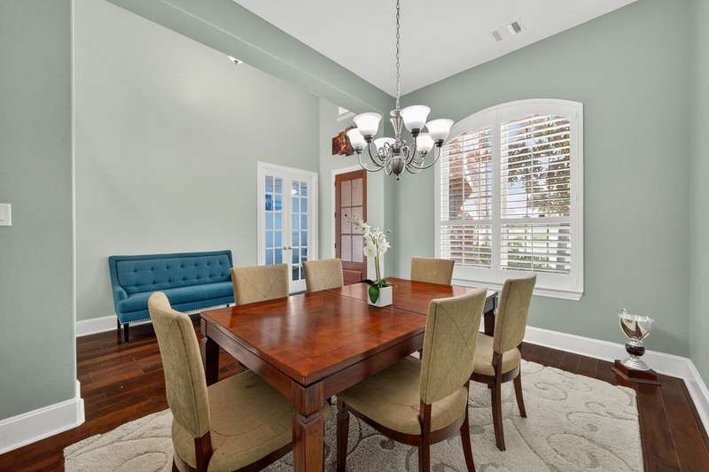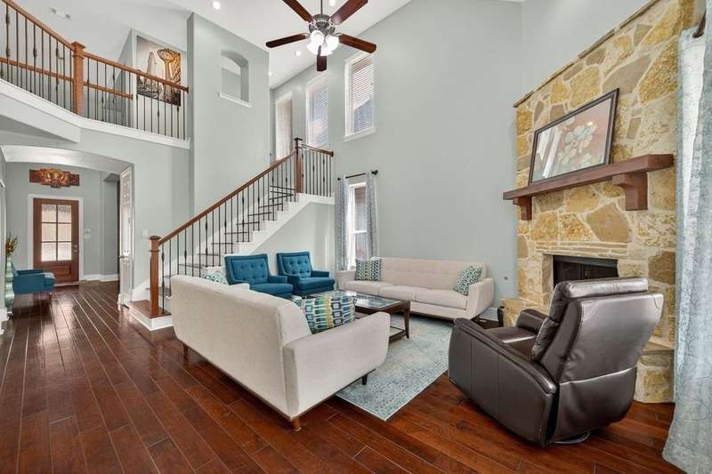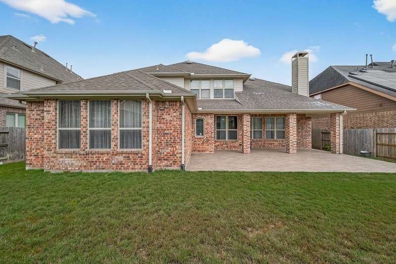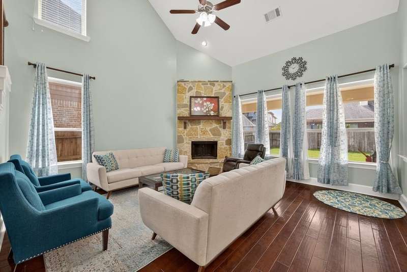 Highly Desirable Riverstone Home Built by Highland Homes! Beautiful 4-bedroom plan with 2 bedrooms down, plus private study, gameroom, and media room! Gorgeous wood floors flow from entry through all main living areas. Designer details throughout including plantation shutters and elegant fixtures. Private study with glass doors offers perfect work-from-home space. Formal dining ideal for gatherings. The spacious living room impresses with double-height ceilings and a cozy corner fireplace. The chef’s kitchen opens to the family room and features a large center island, granite counters, pendant lighting, and abundant storage. Retreat to the primary suite with wood floors, raised ceilings, and spa-like bath. Upstairs showcases a huge gameroom, theater-style media room, and generous secondary bedrooms with large closets and study nooks. Enjoy outdoor living on the extended covered patio overlooking a wide, open backyard with sky views. Walking trails, parks, shopping, and dining nearby!