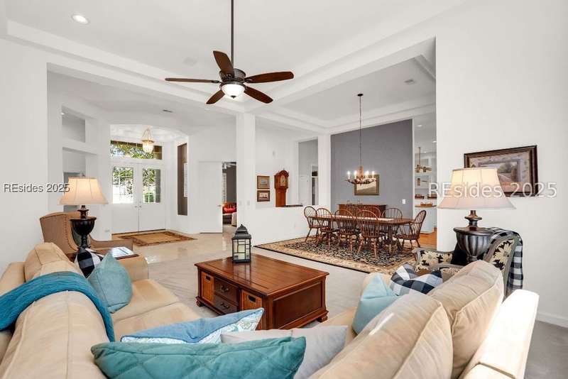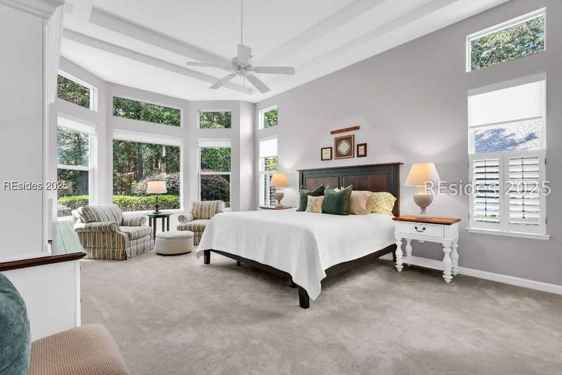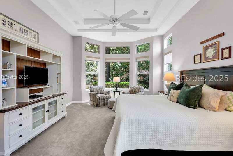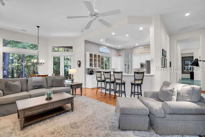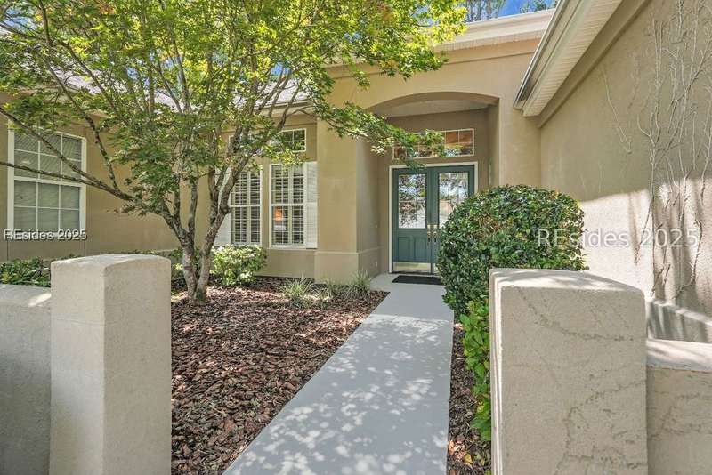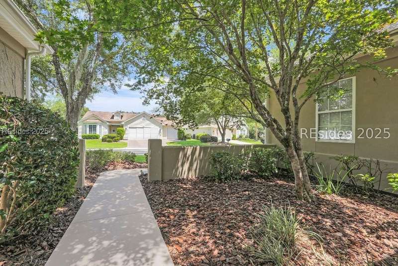 Located on a tranquil court in Sun City Hilton Head lies a rare and refined Del Webb Marion Webster Estate Model-a one story home showcasing soaring 12 foot ceilings and is enveloped by a serene wooded view. The expansive layout encompasses 2 bedrooms, 2.5 bathrooms and includes a versatile den/office/library thoughtfully equipped with a Murphy bed, offering the option of a third bedroom. This home includes two living rooms, one is equipped with built ins and a cozy fireplace. Other upgrades include a new A/C, two car garage PLUS golf cart garage, a spacious primary suite w/a closet equipped with custom shelving & an expanded screen lanai which is the perfect space to unwind while admiring views of the water fountain and secluded woods. There are too many upgrades to list, this home is a must see!
