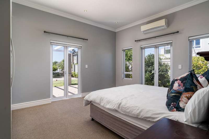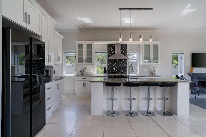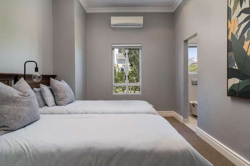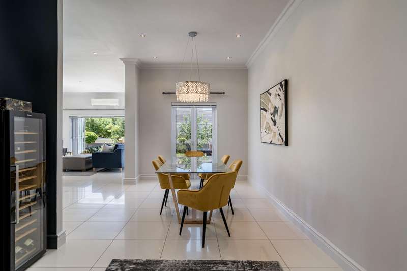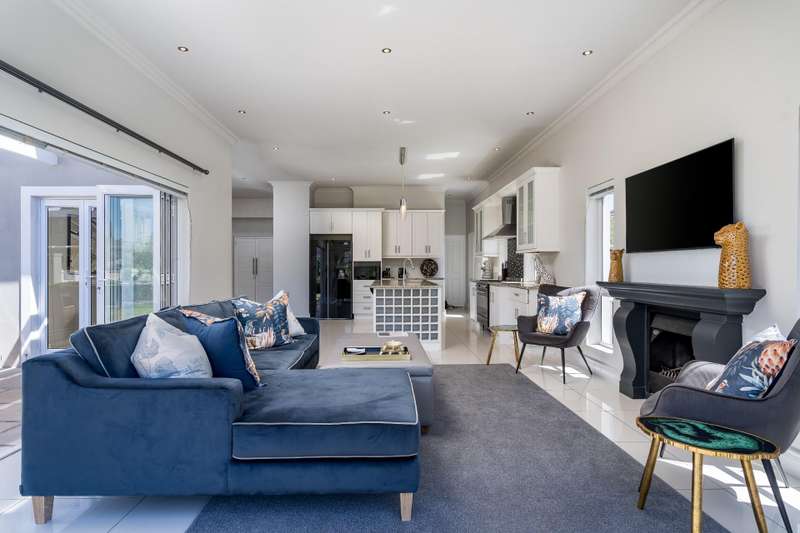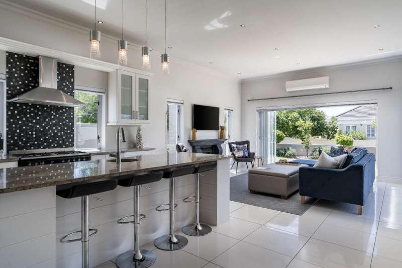 This beautiful single storey home faces North onto a green belt with views towards the Paarl mountains. The living areas of this house are expansive with a beautiful flow from the modern well-equipped kitchen through to the dining, lounge and patio arears. All 3 bedrooms offer natural light and are all en-suite. The home is built with a double garage and rounded off with an easy to maintain garden. The garden also enjoys incredible views of the Paarl Monument.