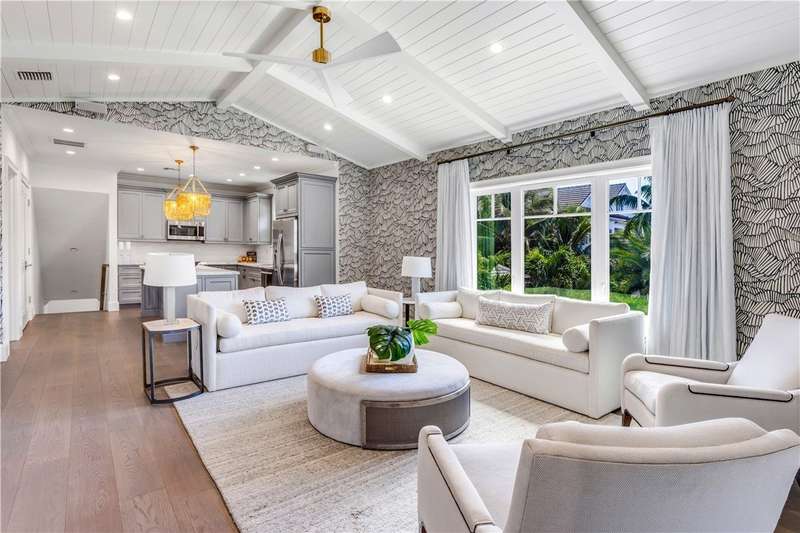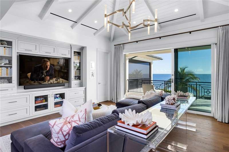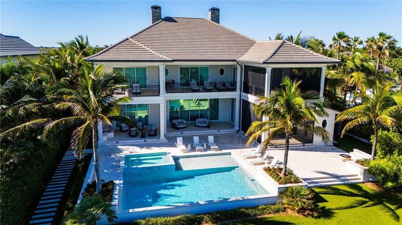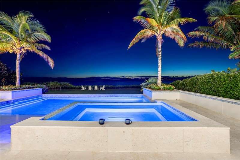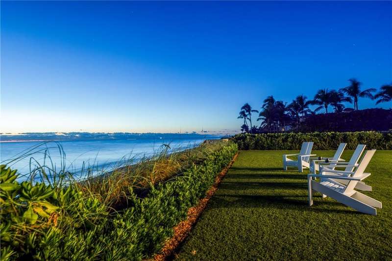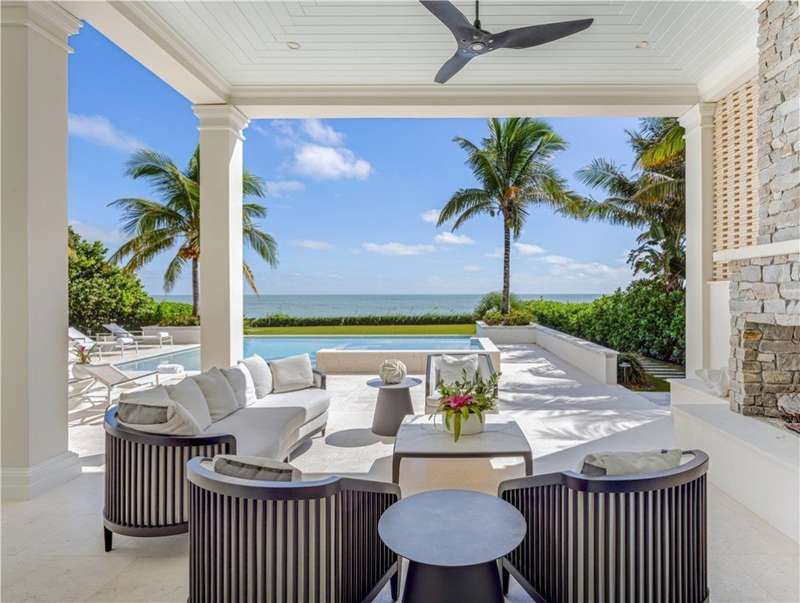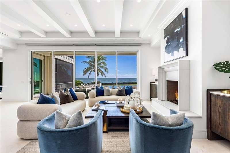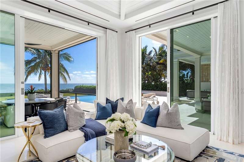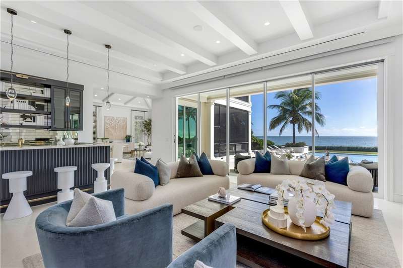 Discover luxury oceanfront living on 1.09 elevated and secluded acres with 104' of beach frontage. Built in 2016, this 5BR/5.4BA coastal estate has dual primary suites, private guest suite, gourmet kitchen, custom office, SAVANT system, custom bar, elevator and laundry rooms on both floors. Effortless outdoor living from breezy terraces, resort-style pool/spa, summer kitchen, putting green, meticulous landscaping, 4 car garage, gated drive and seawall. Near Moorings Yacht Country Club, marina. Miles from public beach access. Partial staging by Vesta Homes-furniture available for purchase.