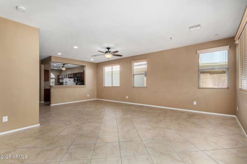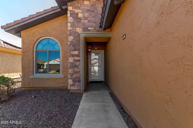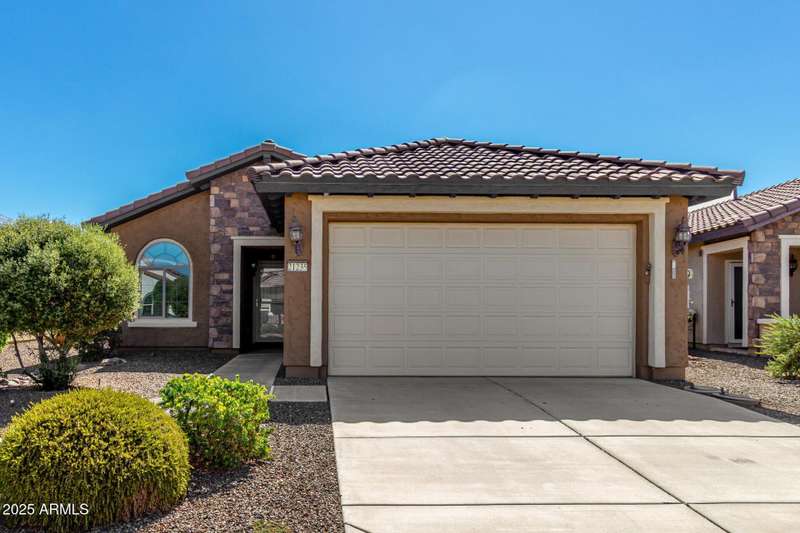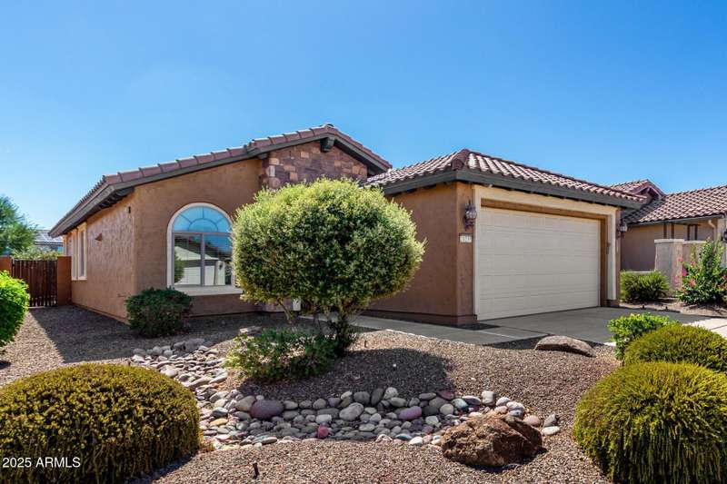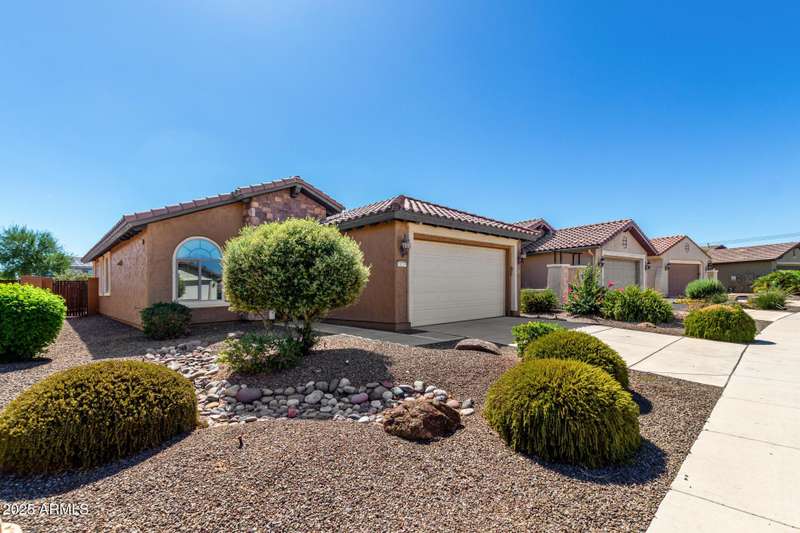Find your ideal retirement haven in the 55+ Sun City Festival! This charming single-level home offers 2 beds, 2 baths, 2-car garage, & a low-care landscape. The welcoming interior features abundant natural light, a two-tone palette, recessed lighting, tile flooring in common areas, and soft carpet in bedrooms. The eat-in kitchen boasts built-in appliances, a pantry, and ample wood cabinetry. Its 2-tier peninsula, with a breakfast bar, overlooks the large living space for an inviting & open-concept feel. Enter the main bedroom to find a walk-in closet, a bay window, and a private bathroom for added comfort. Laundry room with a sink & cabinetry. If you want to relax or enjoy BBQ, check out the perfectly sized backyard with a covered patio & extended pavers! No rear neighbors! Make it yours!