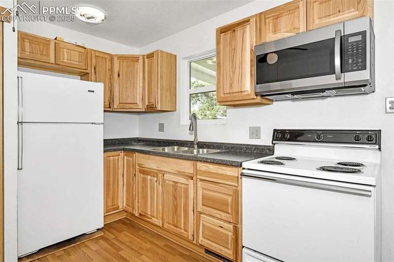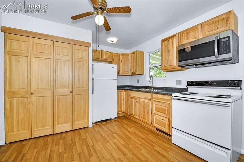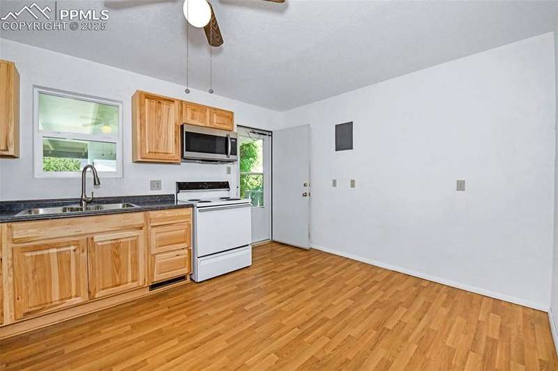 NEW REFINISHED HARDWOOD FLOORING THROUGHOUT!! GREAT opportunity in this darling rancher in a quiet neighborhood within walking distance to restaurants, shopping, the elementary school, and junior high! Interior includes built-in hall cabinets, kitchen appliances AND washer and dryer. Covered back porch and shed. Landscaping include perennials galore include trumpet vines and iris's. NEW SEWER LINING!! Quick access to Ft Carson. With a little love, this could be a wonderful home!