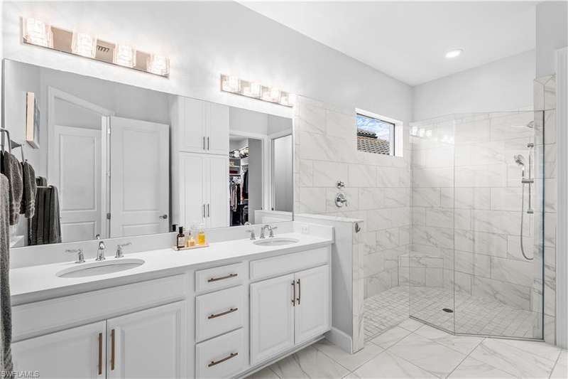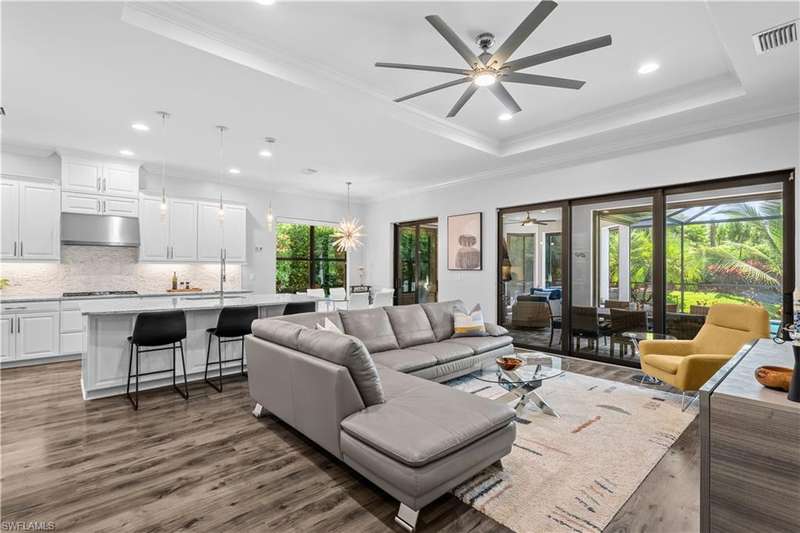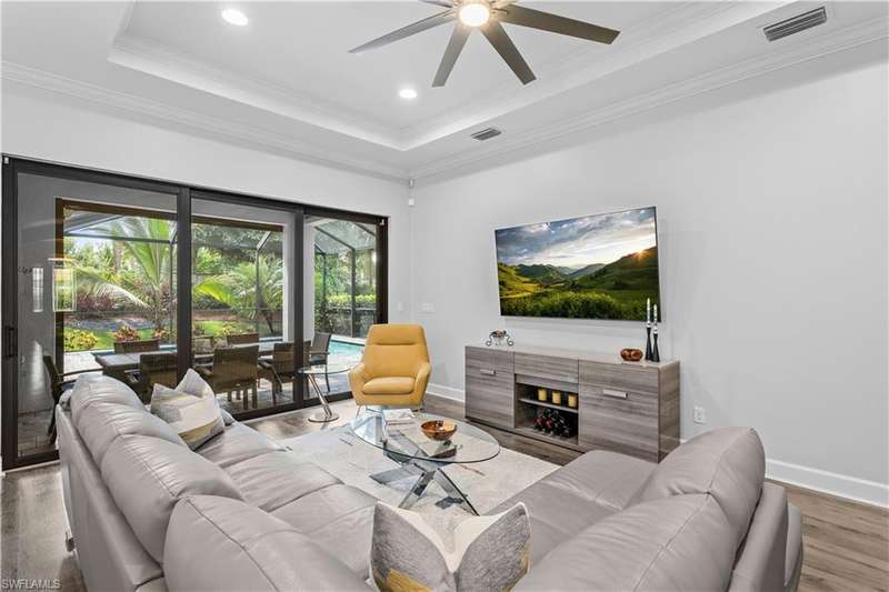 This beautiful 3 Bedroom plus Den, 2.5 Bath Farnese floorplan home is situated at the end of a quiet cul-de-sac street on an extremely private corner lot with southern rear exposure. The great room style floorplan with two sets of sliding glass doors to the extended covered lanai makes this home perfect for entertaining. Entertain family and friends around your heated pool with sunshelf, jaccuzzi, firepit area, and pavered side yard which lends itself to a game of corn hole/bags. Storm ready with hurricane impact windows/doors and motorzed roll down hurricane screens on the lanai openings. A long list of special features include: extended 2 car garage (24 x20 ); Cambria quartz countertops; Hunter Douglas window treatments; custom master closet built-ins; solid core interior doors; crown molding; recently sealed driveway and lanai pavers; lush landscaping; and more! This property also comes with a Club/Sports Membership, granting full access to all the amenities of Esplanade Golf &