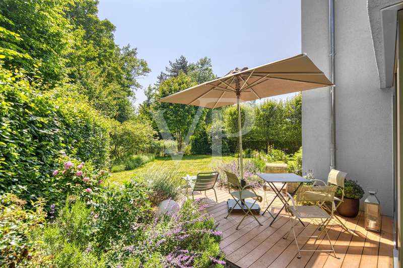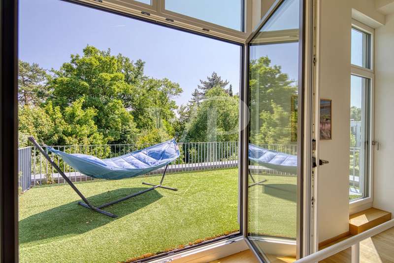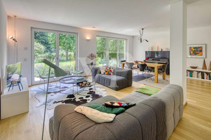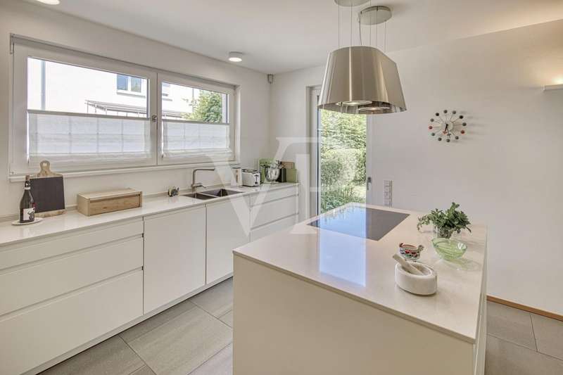 This exclusive detached house built in 2016 awaits you in a sought-after, quiet residential area of Aachen-Laurensberg - right next to the renowned Rahe Castle. Embedded in a well-kept and upscale residential environment and bordering a landscape conservation area, the property offers a well thought-out overall concept of modern architecture, sustainable building services and high-quality furnishings. The house impresses with approx. 190 m² of living space on a sunny, south-facing plot of around 500 m² with a wonderful view of the countryside. The open-plan design and the light-flooded conservatory with impressive views of the lovingly landscaped garden create a living ambience of the highest standard. The heart of the house is the spacious living area with a luxurious kitchen, which has an open-plan design but can be elegantly separated from the living area by a floor-to-ceiling sliding element if required. This creates either an open-plan living concept or a separate cooking area - just as you wish. Elegant, large-format tiles in the kitchen, entrance area, conservatory, bathrooms and cellar as well as stylish parquet flooring in the living rooms and bedrooms underline the upmarket standard. The property has three well-proportioned bedrooms. The spacious master bedroom is directly connected to a stylish, high-quality en-suite bathroom with a bathtub that invites you to relax. A separate children's or guest bathroom with a modern shower is available for the other bedrooms - both bathrooms impress with elegant sanitaryware and tasteful bathroom furniture. The top floor offers an open gallery area with access to the spacious roof terrace - ideal as a stylish workplace or private retreat with views of the greenery and Aachen's Lousberg. The sustainable and future-oriented building technology is a particular highlight: a geothermal heat pump in combination with a solar thermal system ensures environmentally friendly and efficient heating via underfloor heating. A photovoltaic system can easily be retrofitted. High-quality double-glazed wooden windows, an awning, a large terrace and a cozy outdoor seating area in the garden complete the harmonious overall picture. A single garage offers additional convenience. The elaborately and lovingly designed garden area invites you to linger - whether to relax in the greenery, for sociable evenings on the terrace or for breakfast in the morning sun. This exceptional detached house combines modern living culture, sustainable technology and one of Aachen's best residential locations. An ideal home for discerning buyers who value quality, design and location.