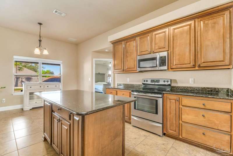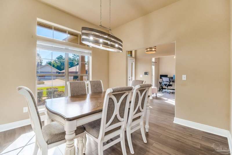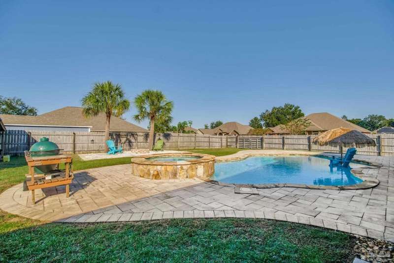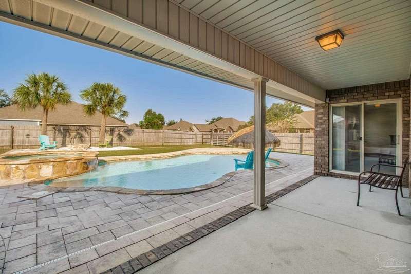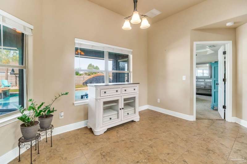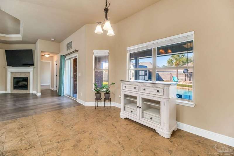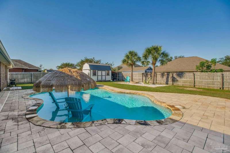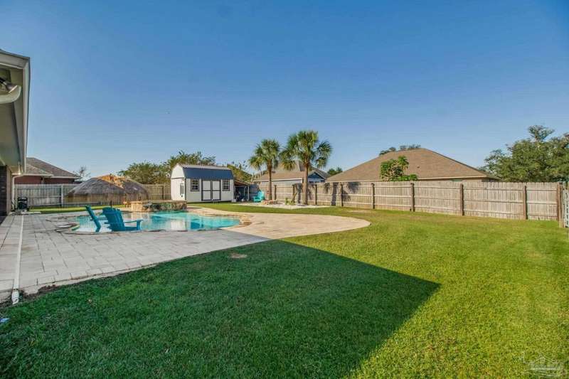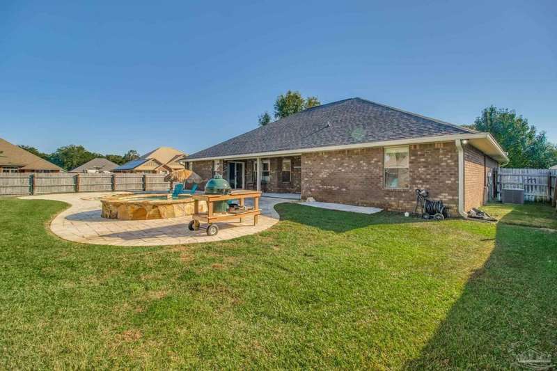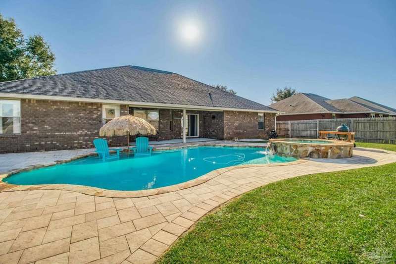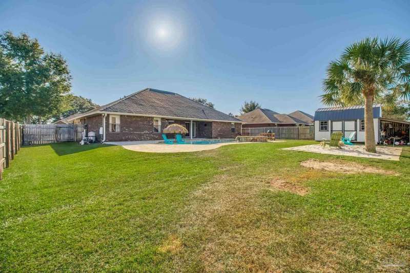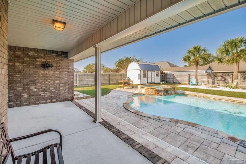 Beautiful 4-bedroom, 3-bath brick home featuring high ceilings and a spacious, open layout. The kitchen is a showstopper with gorgeous cabinets, granite countertops, a pantry, and plenty of workspace-perfect for cooking and entertaining. Enjoy meals in the formal dining room or relax in the comfortable living area. There's also an extra room that would make a great office, playroom, or hobby space. The primary suite offers a relaxing retreat with a soaking tub, walk-in shower, and double vanities. Step outside to your own backyard paradise-a heated gunite pool and spa, a sandy fire pit area, and a nice storage shed, all within a fenced corner lot that provides space and privacy. No HOA, so you can truly enjoy your home your way!