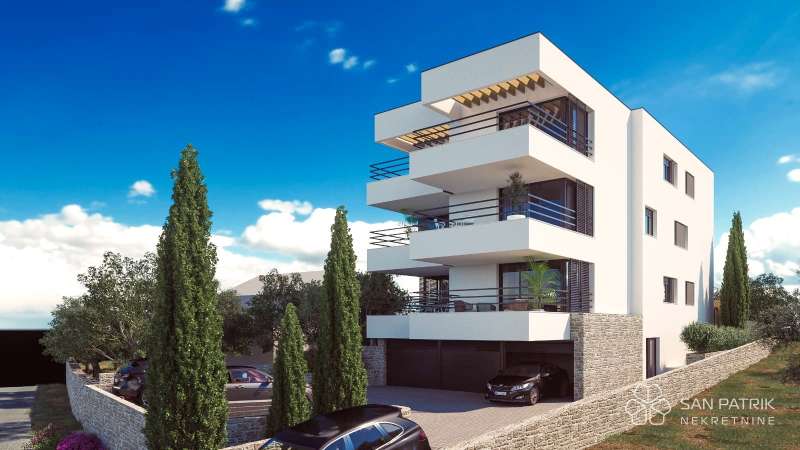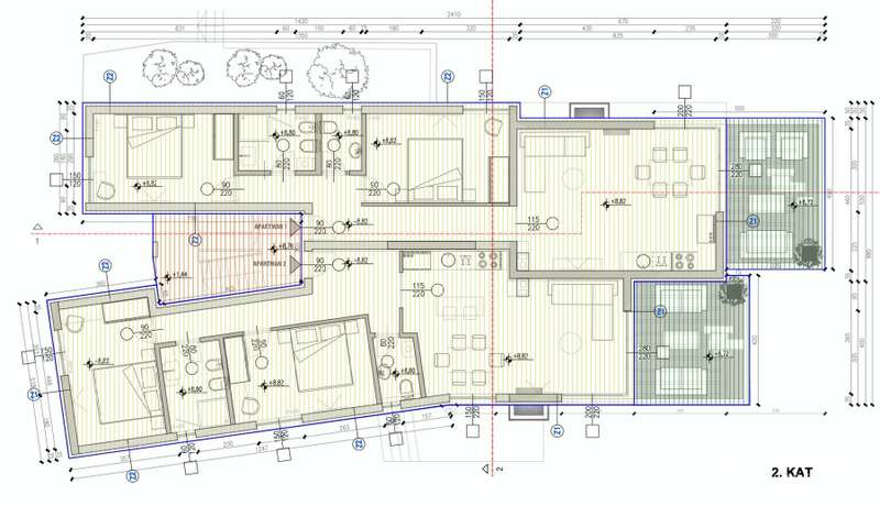 Apartment A1 is located on the 2nd floor of the villa and consists of: hallway, two bedrooms (13 m2), bathroom, toilet, living room, kitchen and dining room, covered terrace (13.50 m2) with sea view, of the outdoor parking space of this storage room in the basement, with a total net billing area of 87.48 m2. In the common yard of this urban villa, there is a summer kitchen with a gas grill for all co-owners, while in the basement there is a small fitness room.