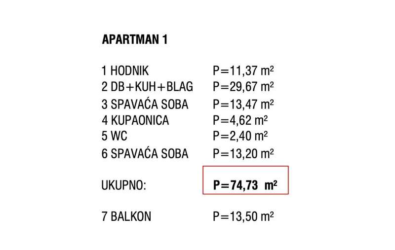 Apartment A1 - 2nd floor - living area 74.73 m2 (2 bedrooms + bathroom + WC) + covered terrace (13.50 m2) + storage room (5 m2) + outdoor parking space, total net billing area 87.48 m2 = EUR 600,000