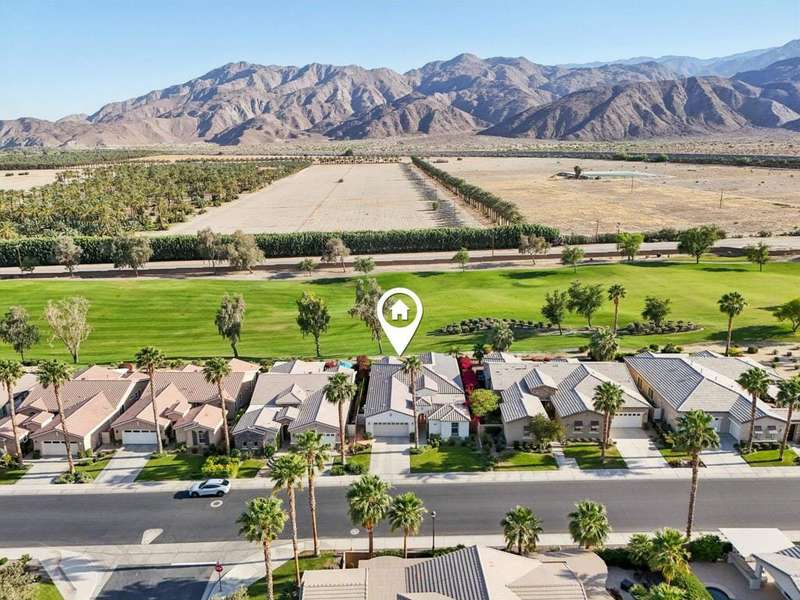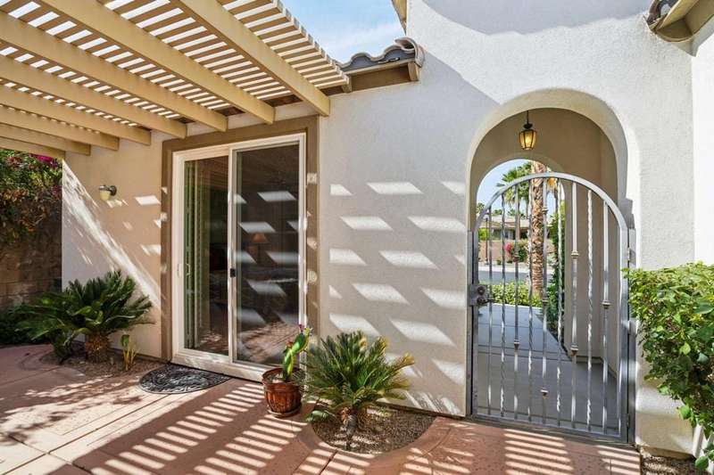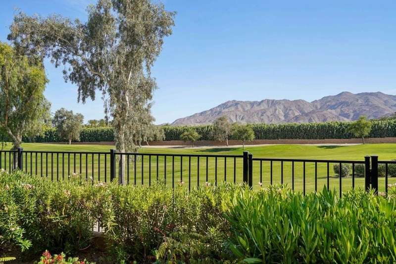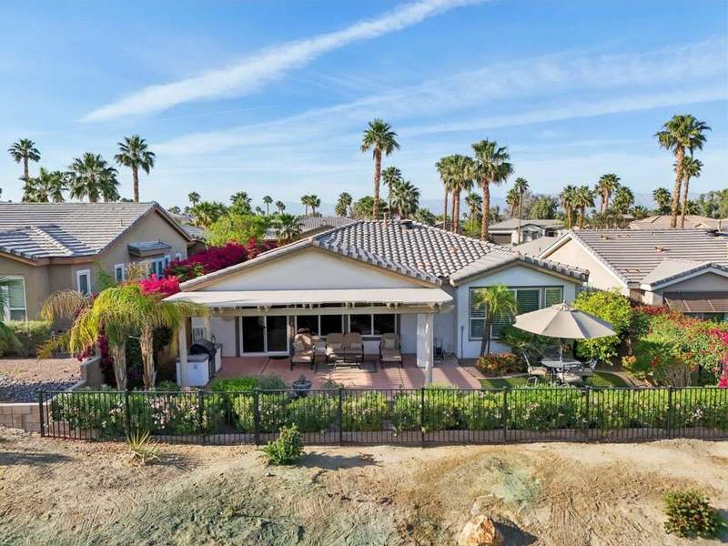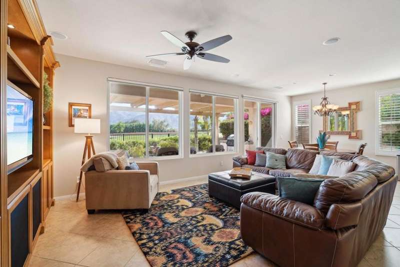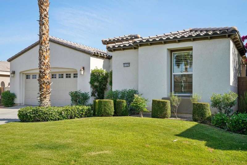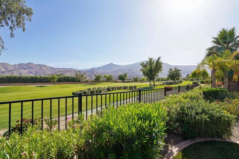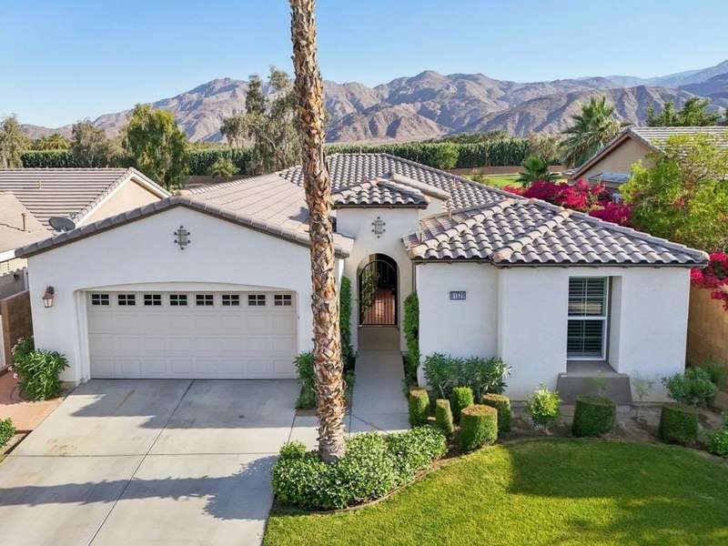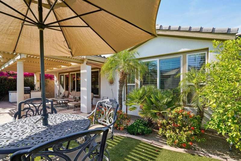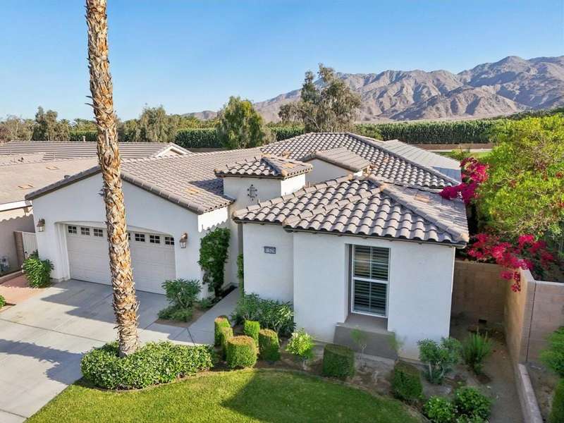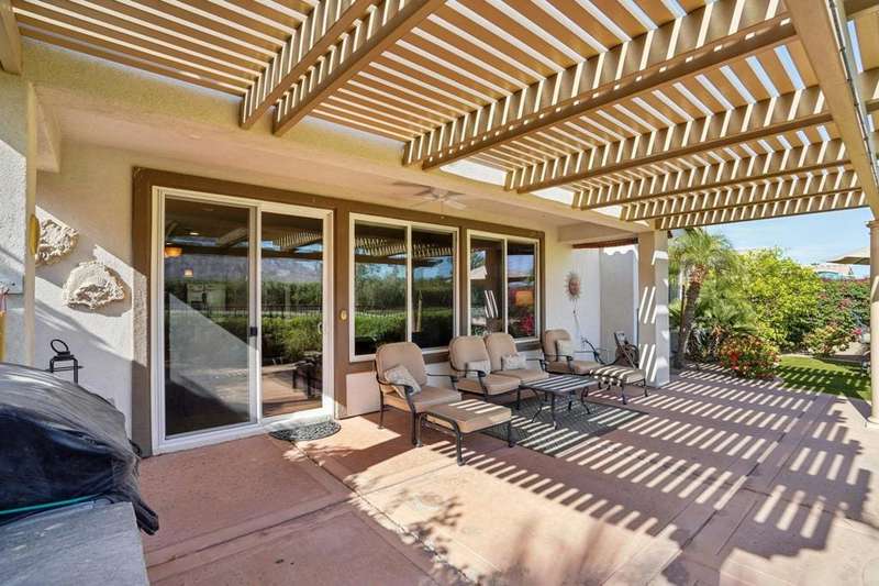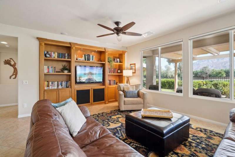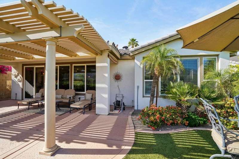 Perched on the 4th fairway of the prestigious Golf Club at La Quinta, this Monterey Plan stunner offers jaw-dropping Southern mountain and golf course views that will steal your breath away. Boasting 1,965 square feet of open-concept living, this 3-bedroom, 3-bath home includes a versatile den/office/reading room and a charming detached casita complete with full bath, fridge, and sink--perfect for guests! Enter through a wrought iron gate into a pergola-covered courtyard and step inside to discover tile flooring, custom window treatments, a great room with built-in entertainment center, surround sound, and plantation shutters. The adjacent chef's kitchen dazzles with stainless steel appliances, granite slab countertops, a prep island with bar seating and pendant lighting, double ovens, gas cooktop, and walk-in pantry. The primary suite is a serene retreat featuring a bay window, marble finishes, dual vanities, walk-in closet, and spa-inspired shower. With solar, a spacious laundry room, professional landscaping, misting system, and low-maintenance artificial turf, this entertainer's dream is made for relaxed desert luxury. Make an appointment today to take a closer look at this gorgeous residence.