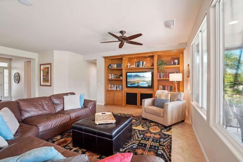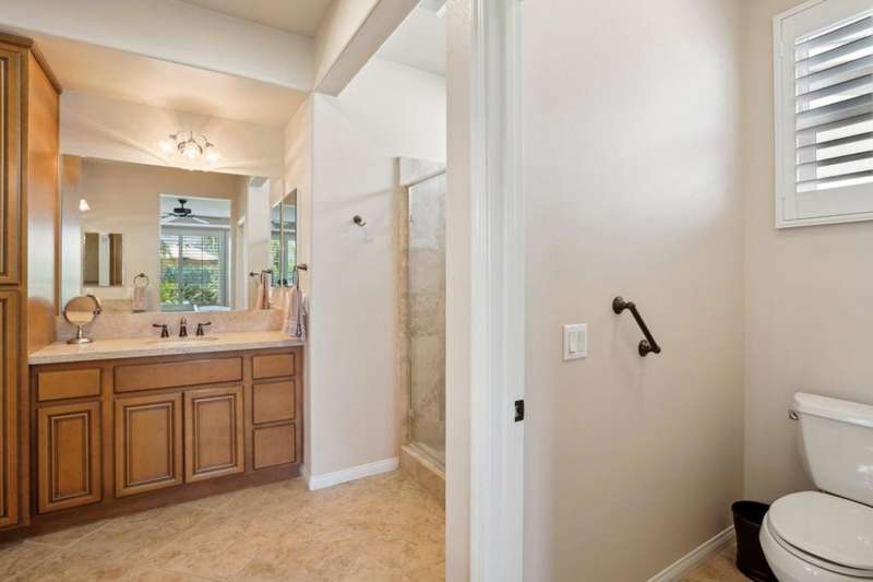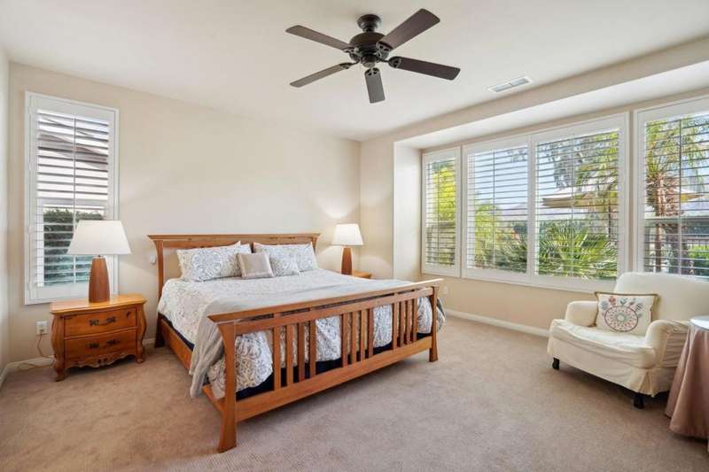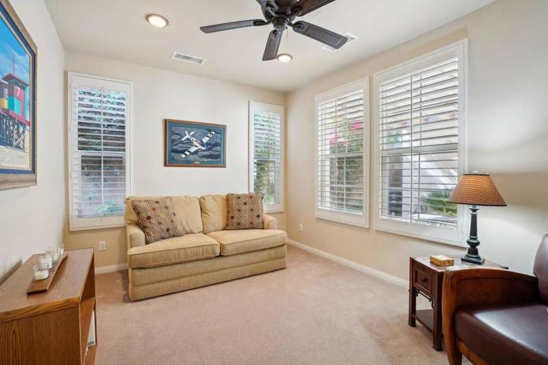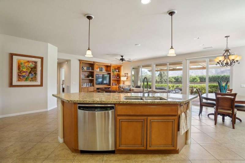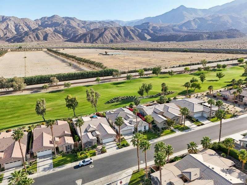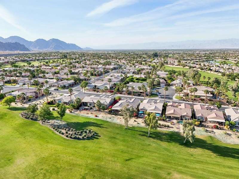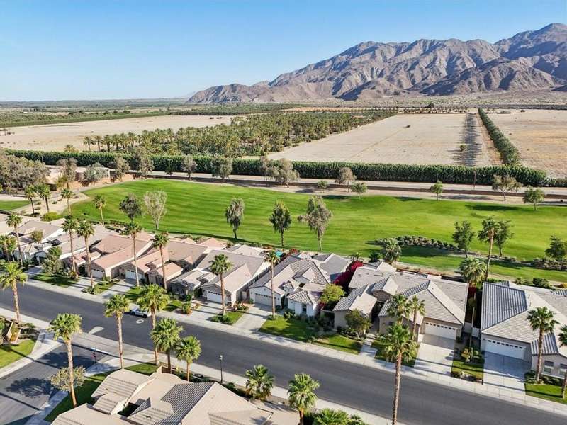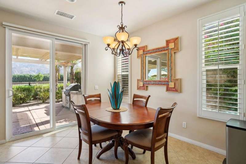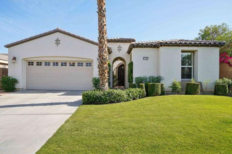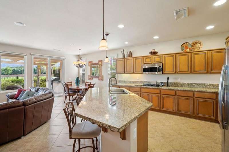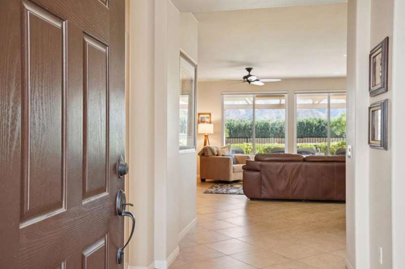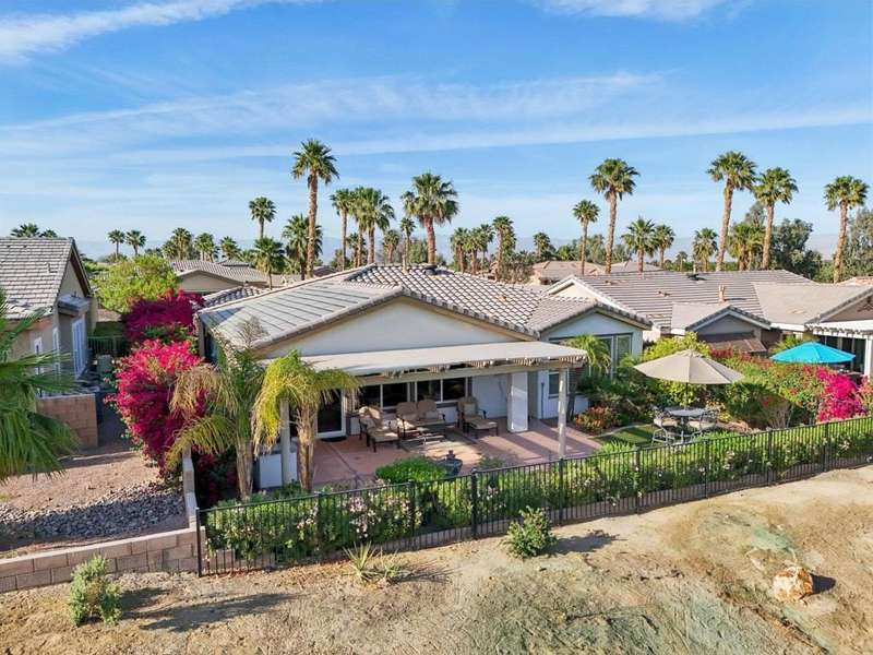 Perched on the 4th fairway of the prestigious Golf Club at La Quinta, this Monterey Plan stunner offers jaw-dropping Southern mountain and golf course views that will steal your breath away. Boasting 1,965 square feet of open-concept living, this 3-bedroom, 3-bath home includes a versatile den/office/reading room and a charming detached casita complete with full bath, fridge, and sink--perfect for guests! Enter through a wrought iron gate into a pergola-covered courtyard and step inside to discover tile flooring, custom window treatments, a great room with built-in entertainment center, surround sound, and plantation shutters. The adjacent chef's kitchen dazzles with stainless steel appliances, granite slab countertops, a prep island with bar seating and pendant lighting, double ovens, gas cooktop, and walk-in pantry. The primary suite is a serene retreat featuring a bay window, marble finishes, dual vanities, walk-in closet, and spa-inspired shower. With solar, a spacious laundry room, professional landscaping, misting system, and low-maintenance artificial turf, this entertainer's dream is made for relaxed desert luxury. Make an appointment today to take a closer look at this gorgeous residence.