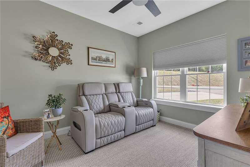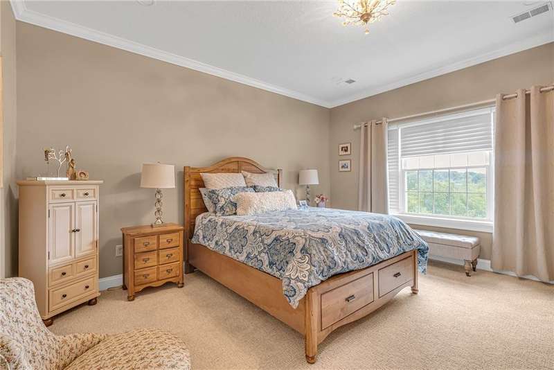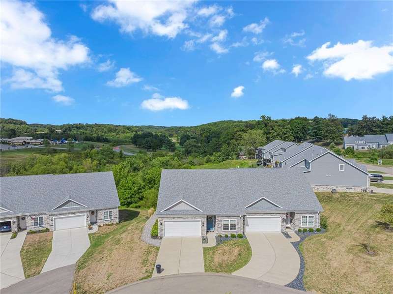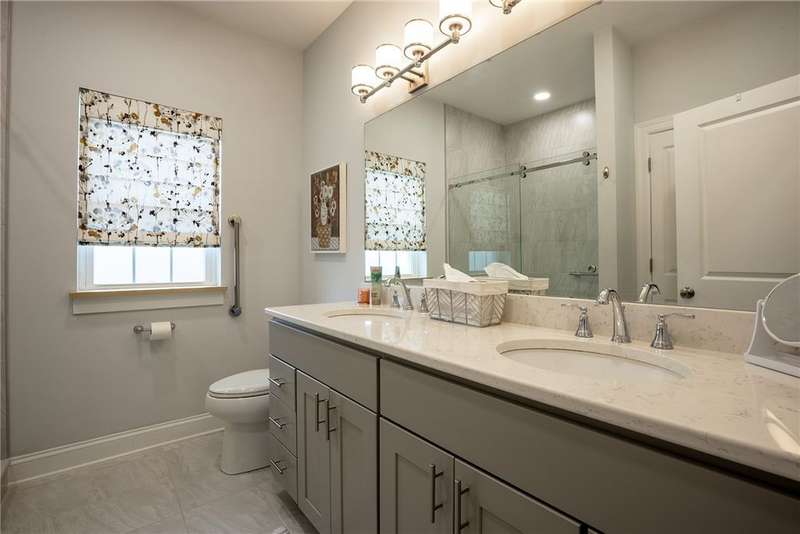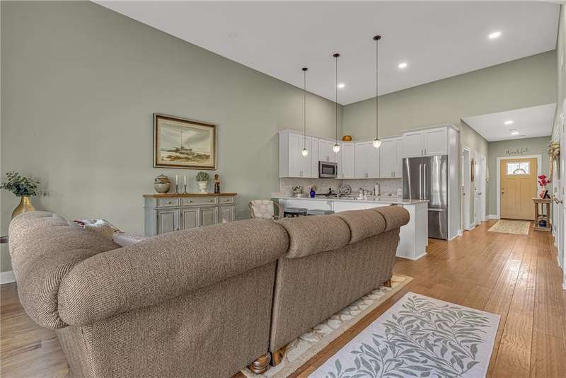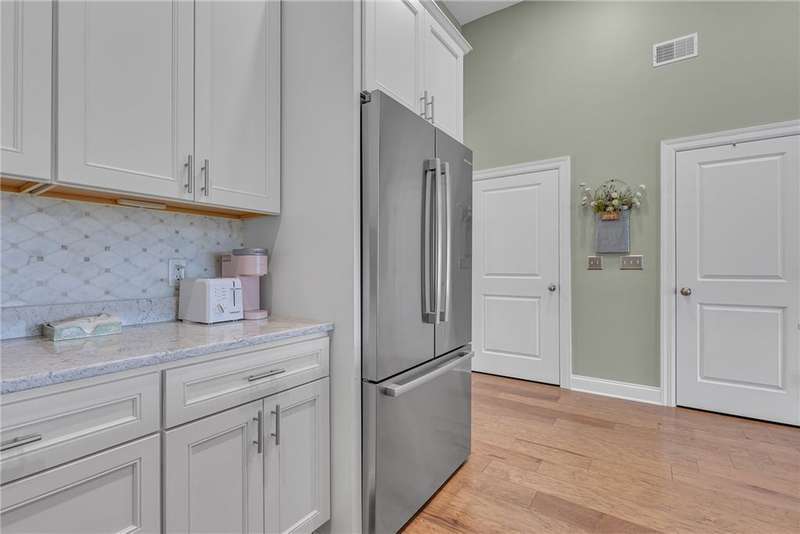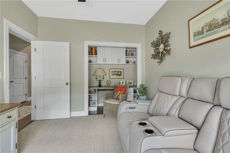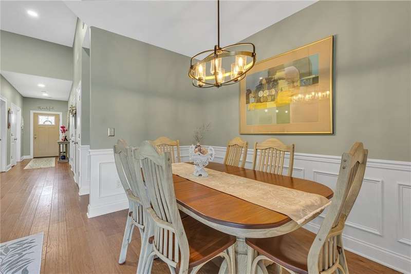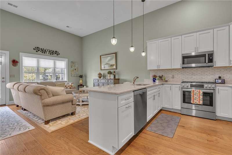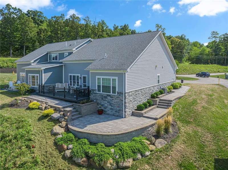 Welcome to this beautifully designed patio home in Pinehurst Village, neighboring the Seven Oaks Country Club. The exterior features a stone patio, thoughtfully placed lighting, plush landscaping, and an expansive composite deck. The interior features hand-scraped hardwood flooring with an open concept. The kitchen is complimented with pendant lighting, granite countertops, a tasteful ceramic backsplash and gas stove. Soft-close cabinetry and bar seating enhance both the function and beauty of this gourmet space. The adjoining dining area is wrapped in classic wainscoting. The spacious owner's suite is accented with crown molding and a custom walk-in closet, providing ample storage and functionality. The bathroom boasts a double bowl vanity, and high-end finishes throughout. The garage stands out with its stone pebble floor. This patio home combines low-maintenance living with upscale finishes.